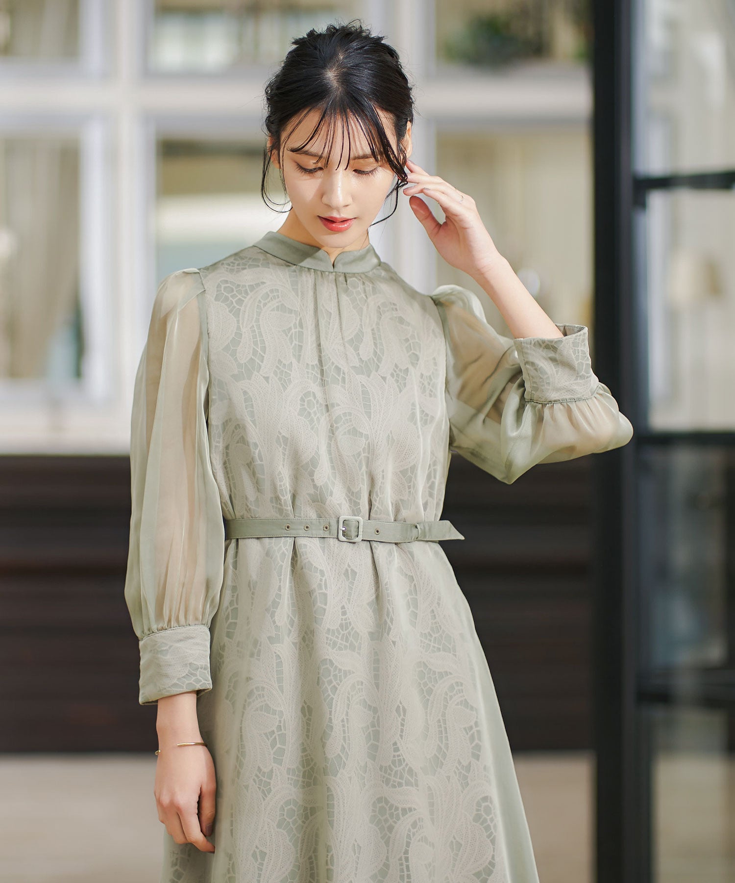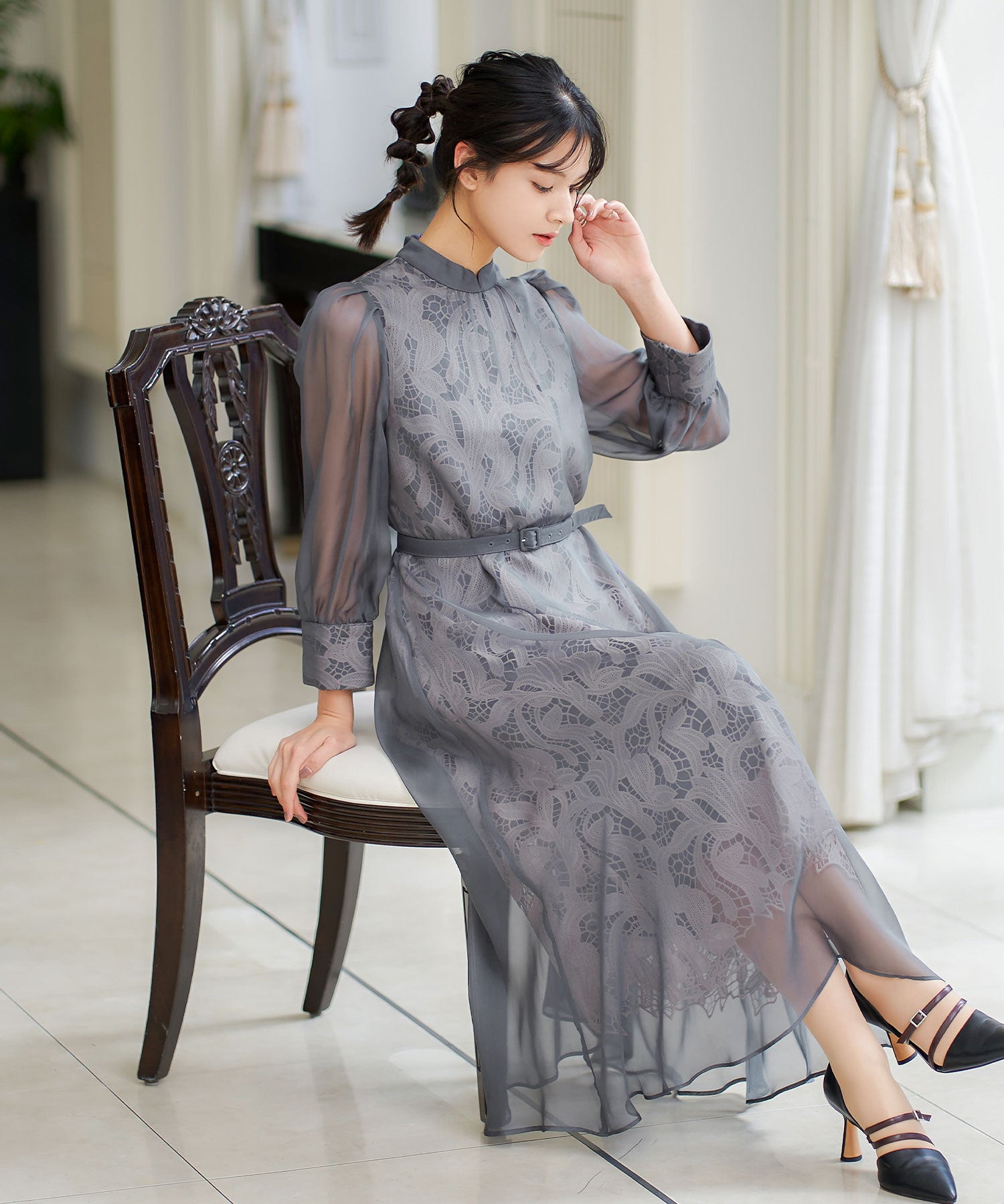 Zname ベルト付オーガンジー重ねレースワンピースドレス