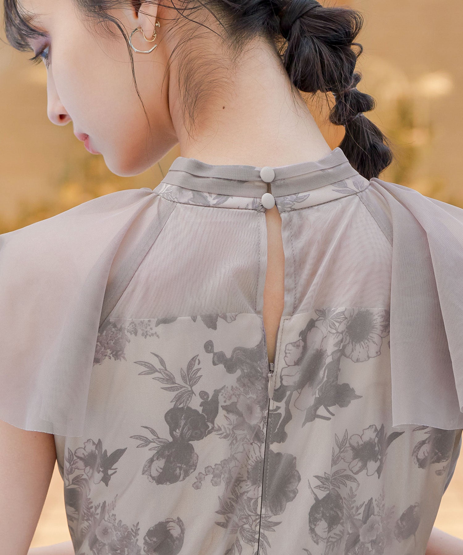 デコルテから肩にかけたシアー感と袖のフリルが抜け感をプラスし