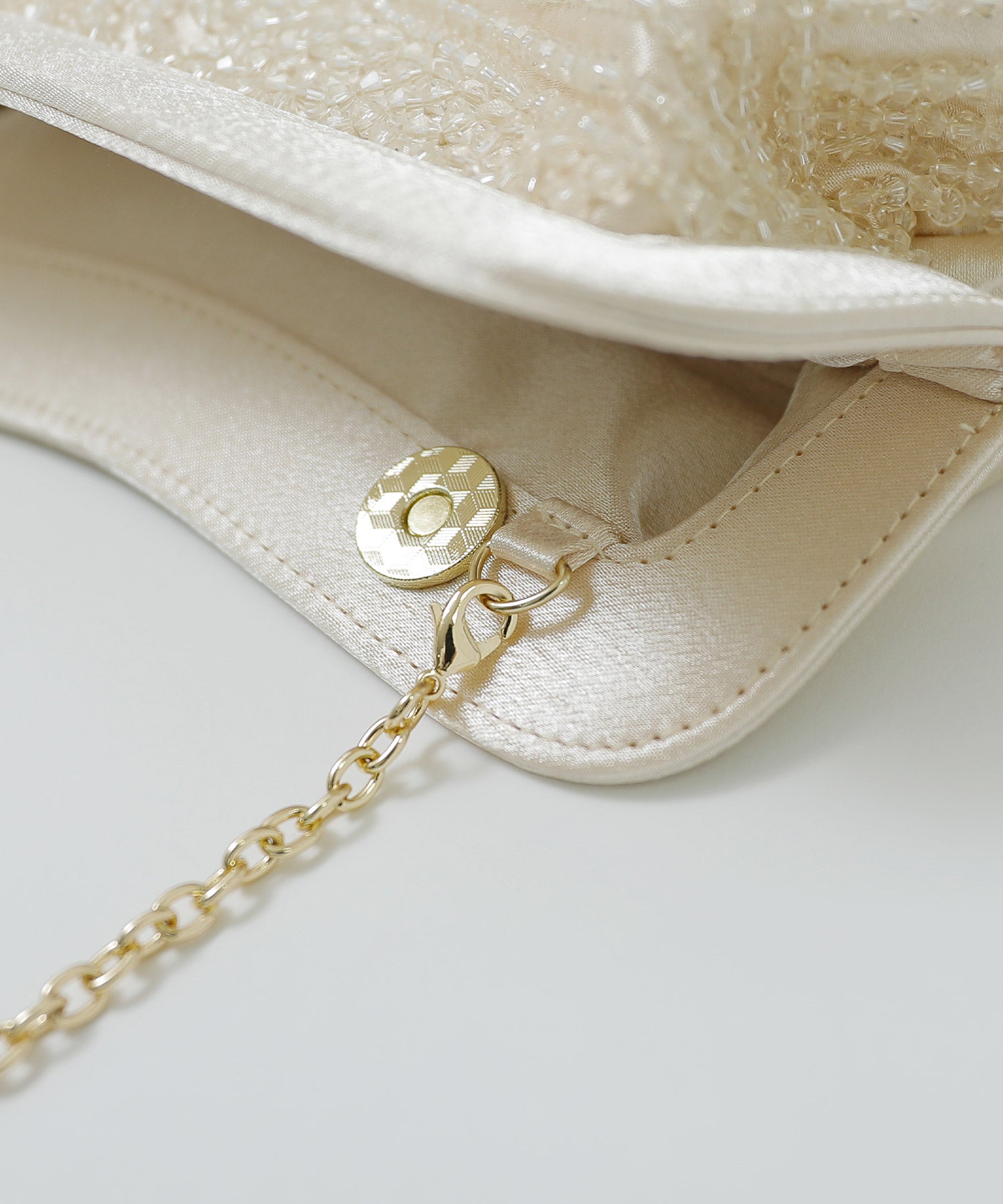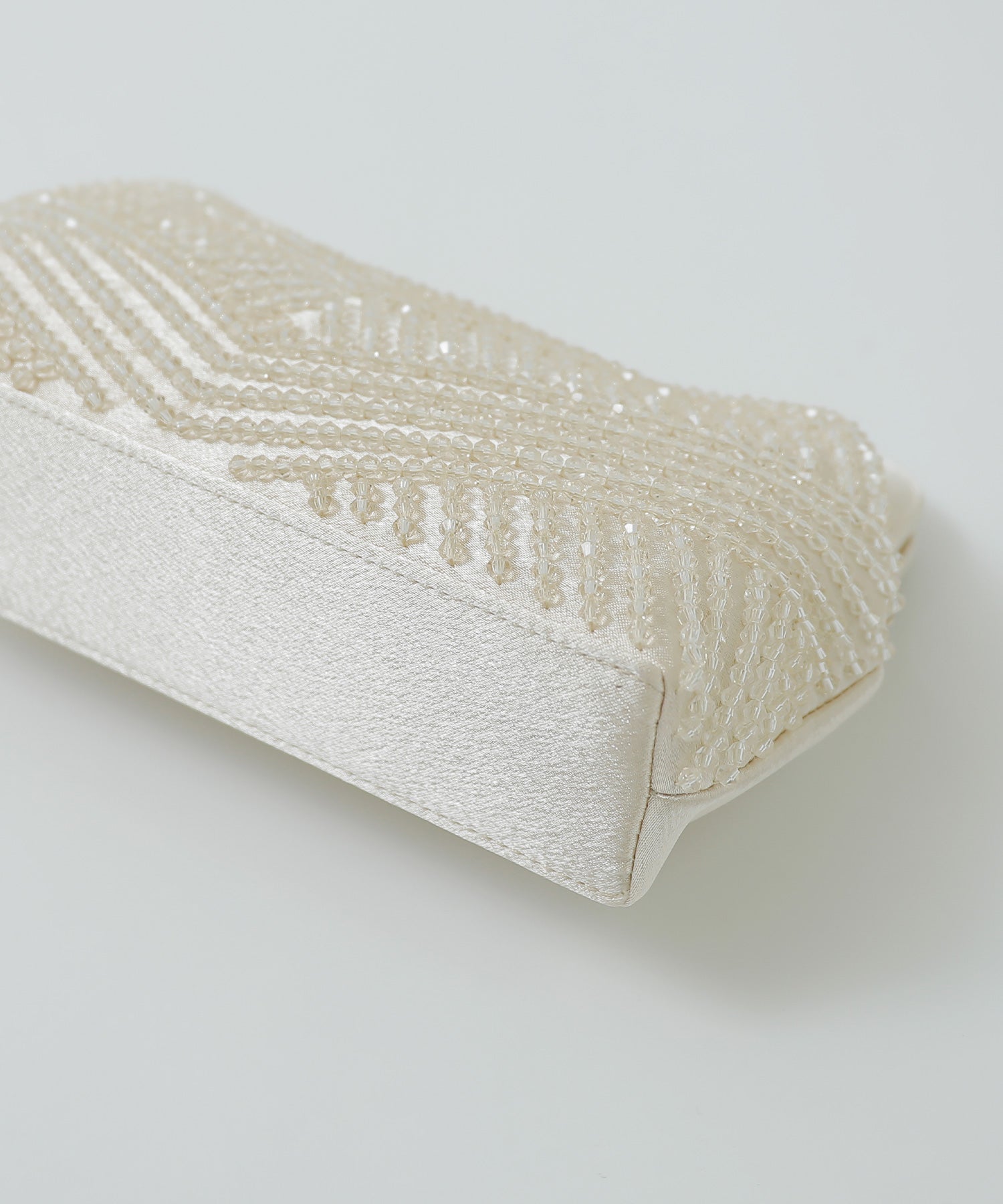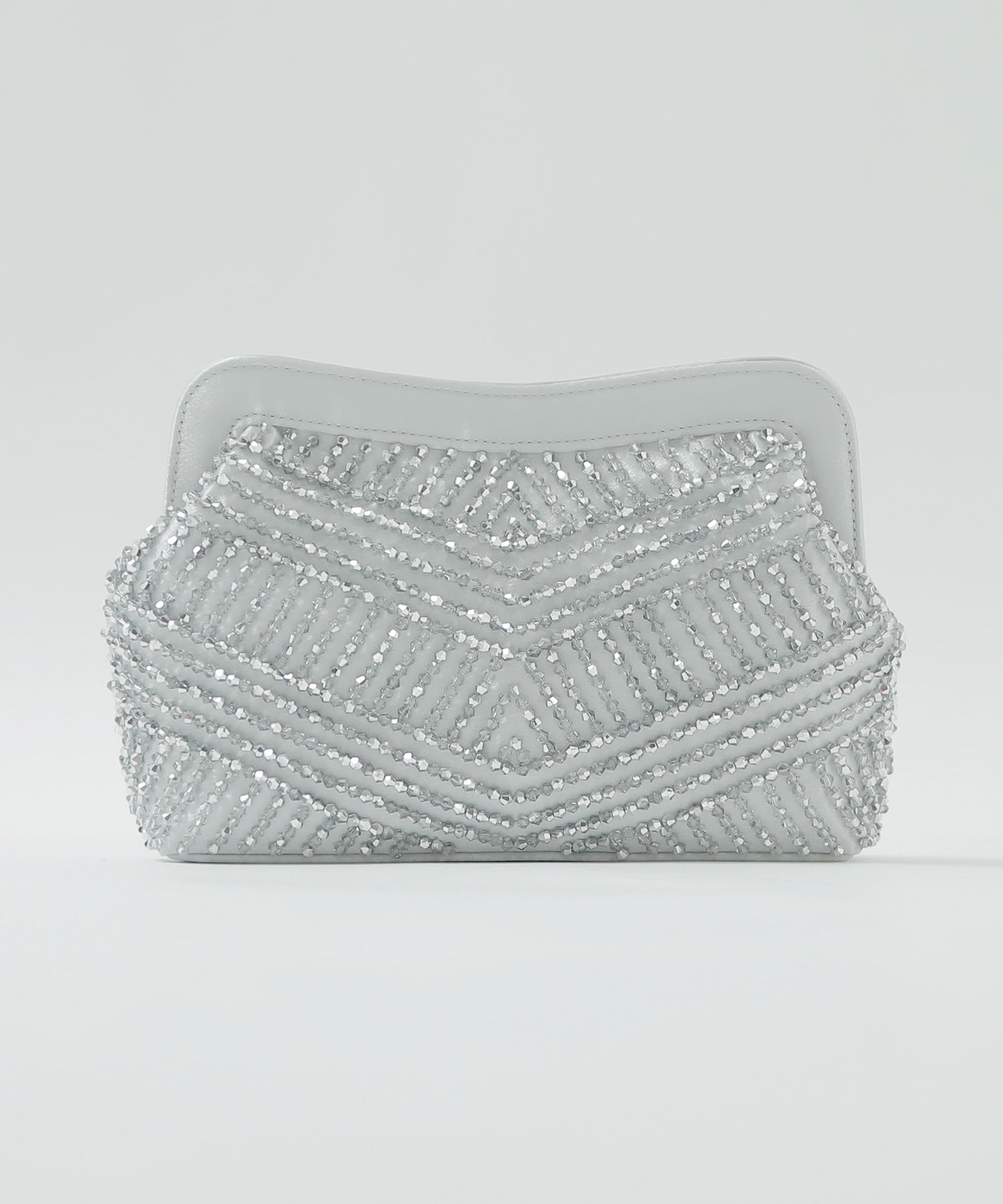 ビジューとビーズを散りばめたサテン生地クラッチバッグ。