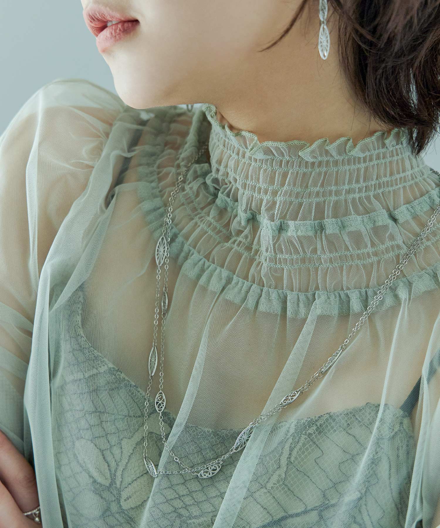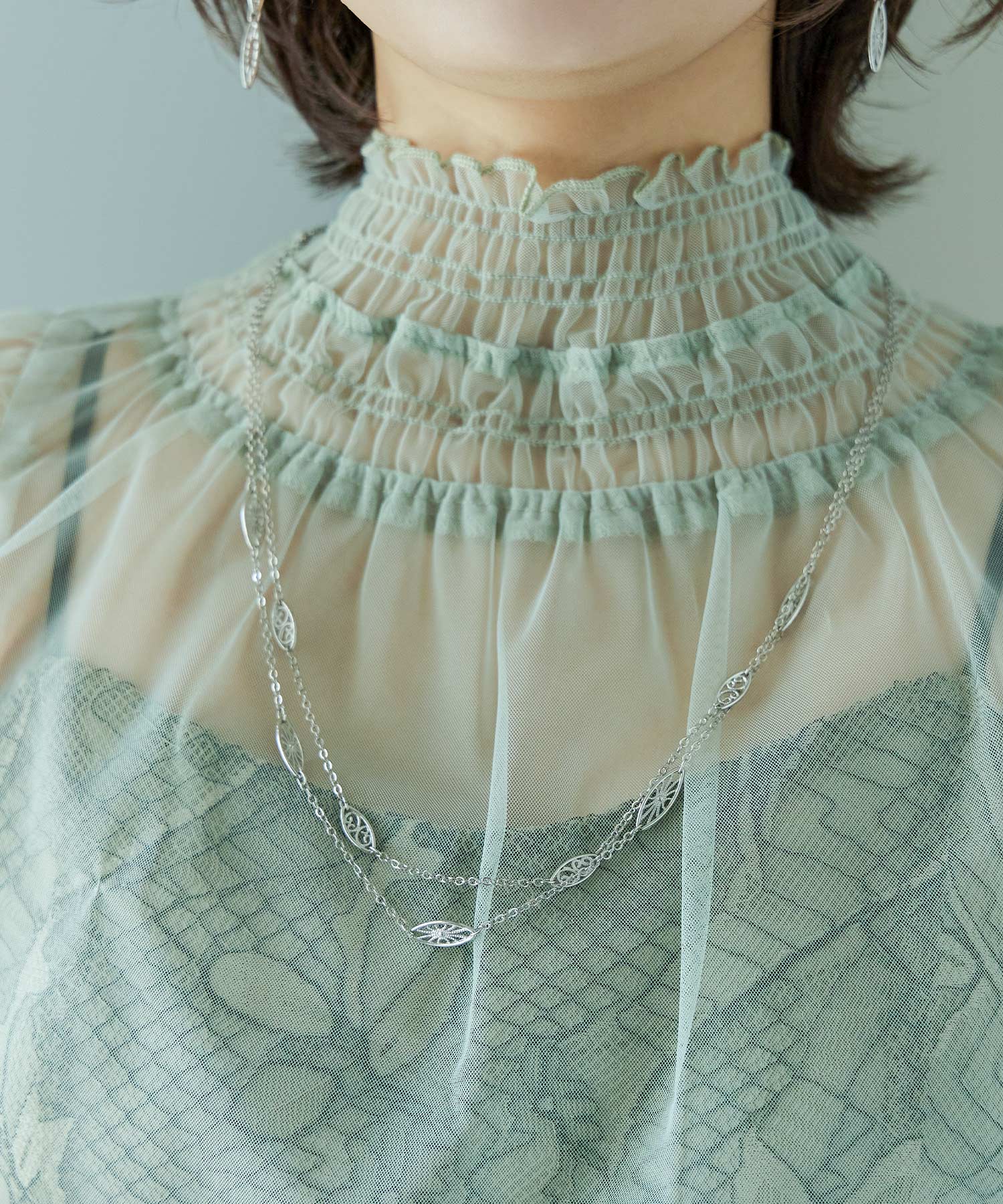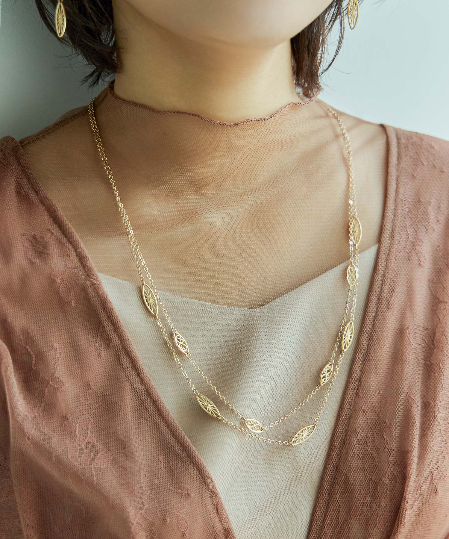 繊細なデザインのリーフモチーフが、デコルテに華やかな印象を与えてくれます。
