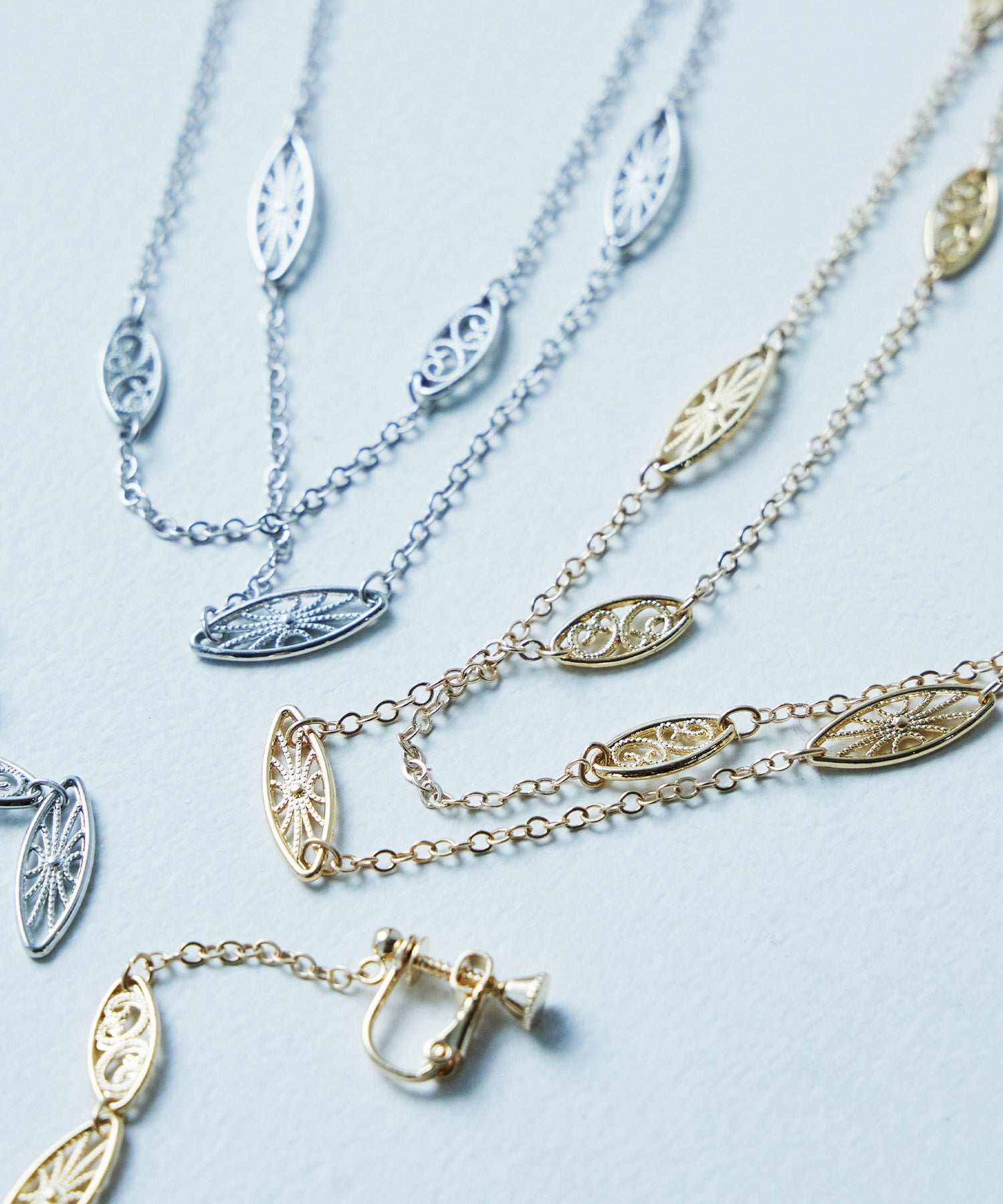同シリーズのイヤリングとセットで着用することで、統一感が出せるのでおすすめです。