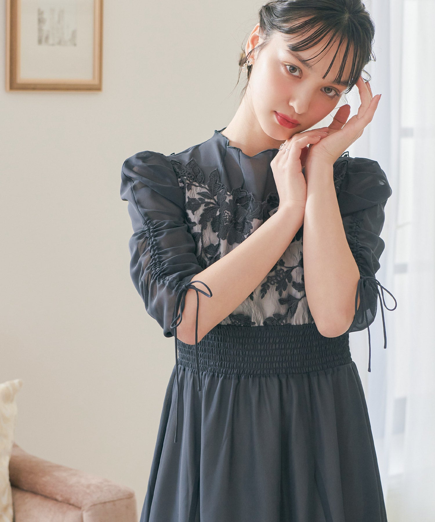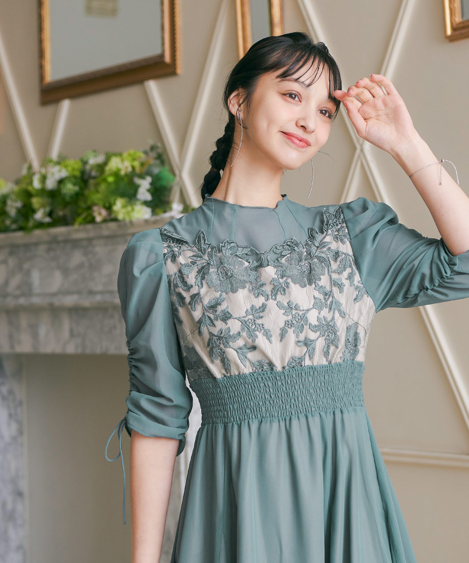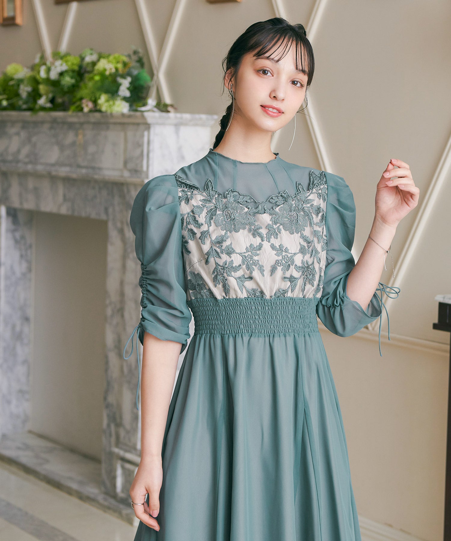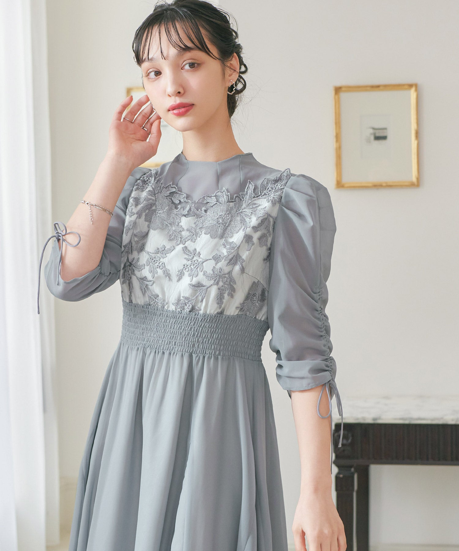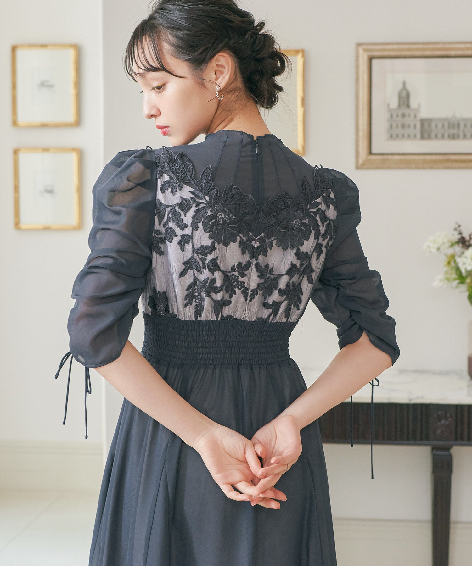 胸元のフラワーレースがクラシカルな印象を作る