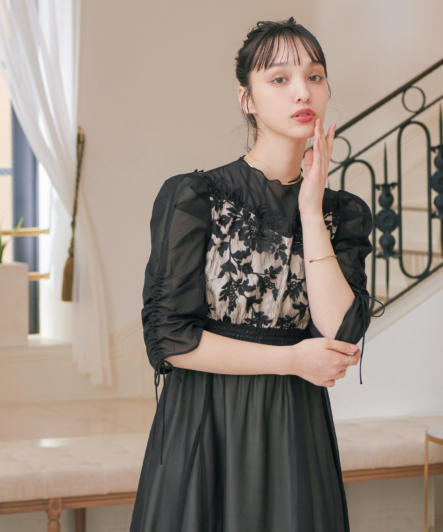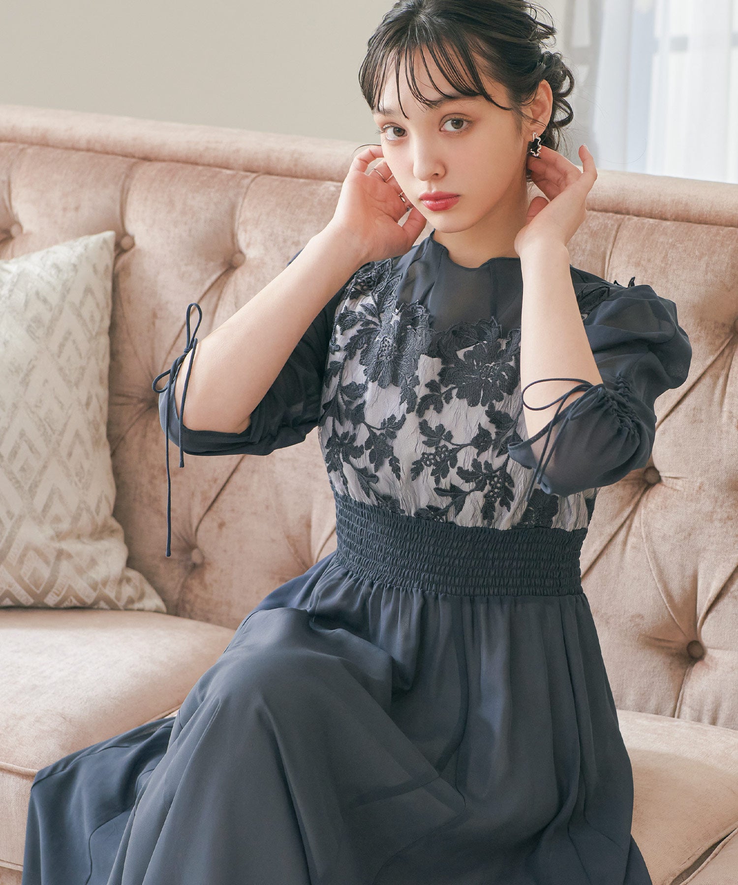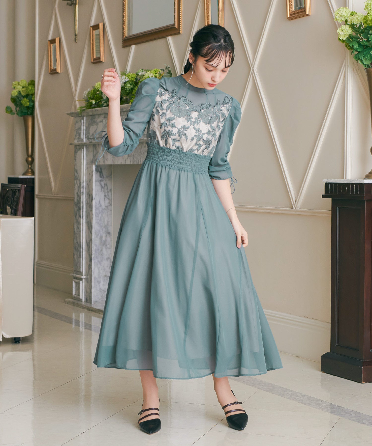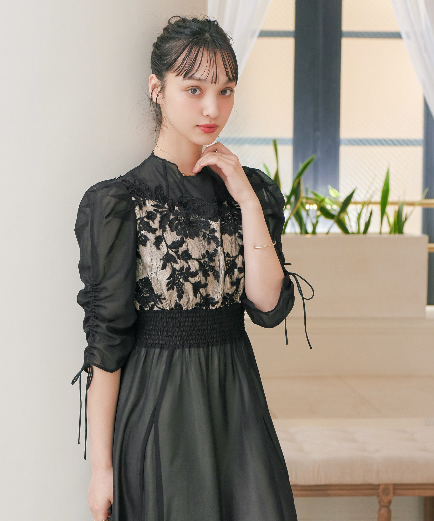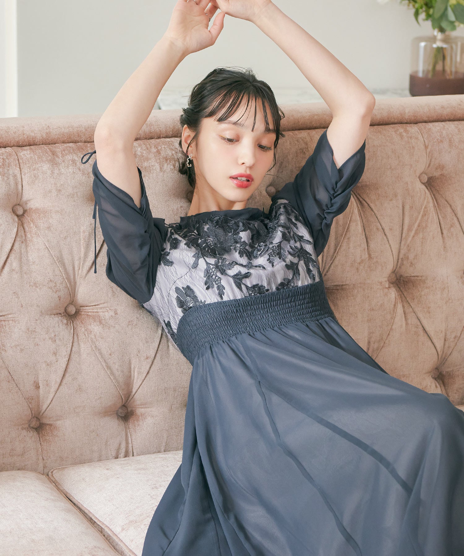 胸元のフラワーレースがクラシカルな印象を作る