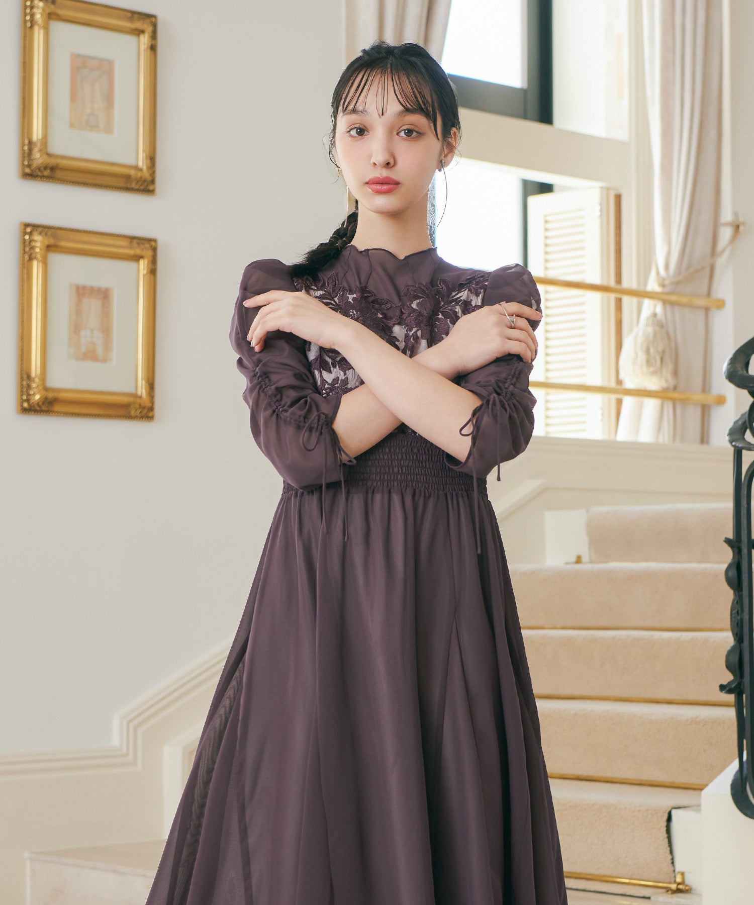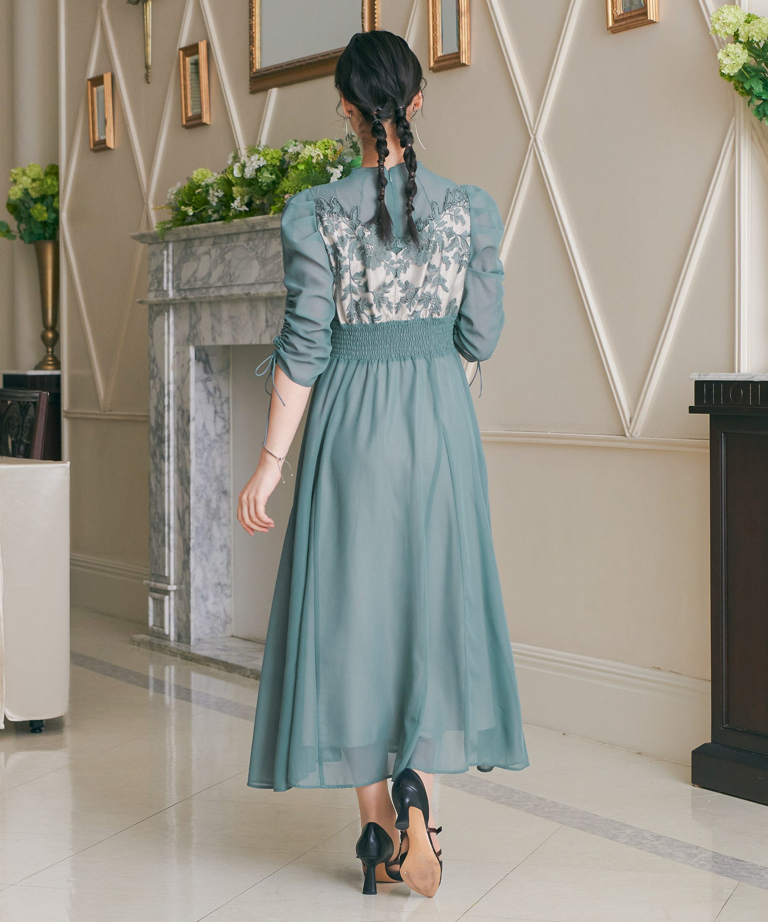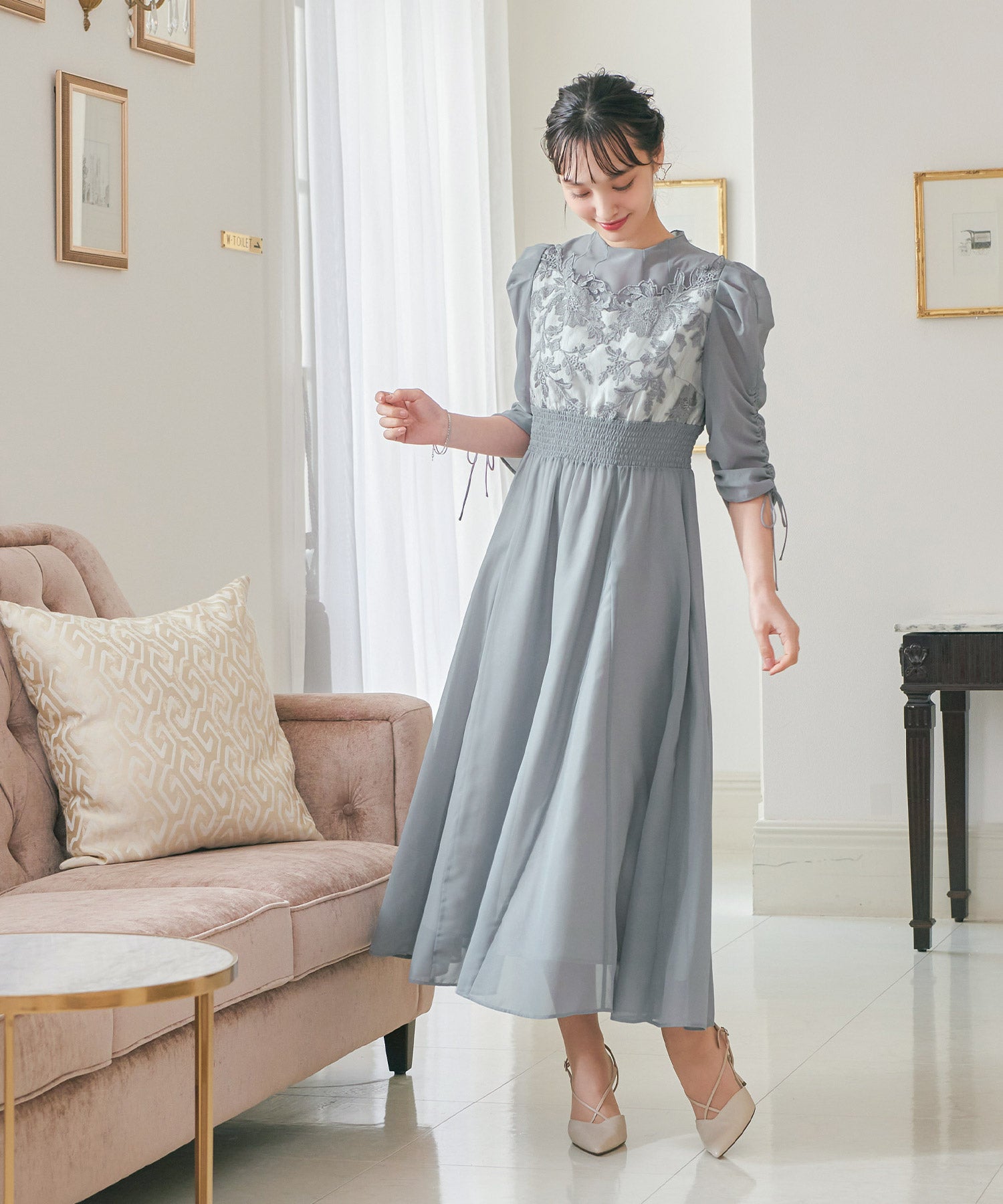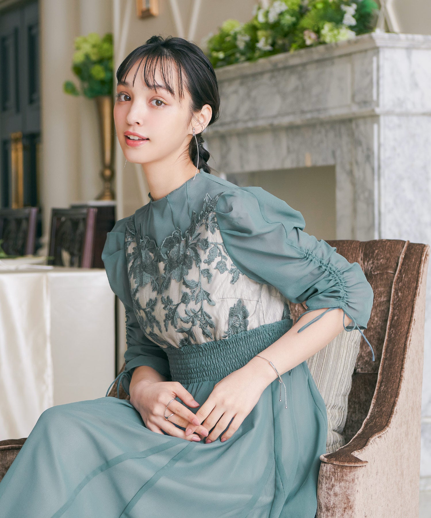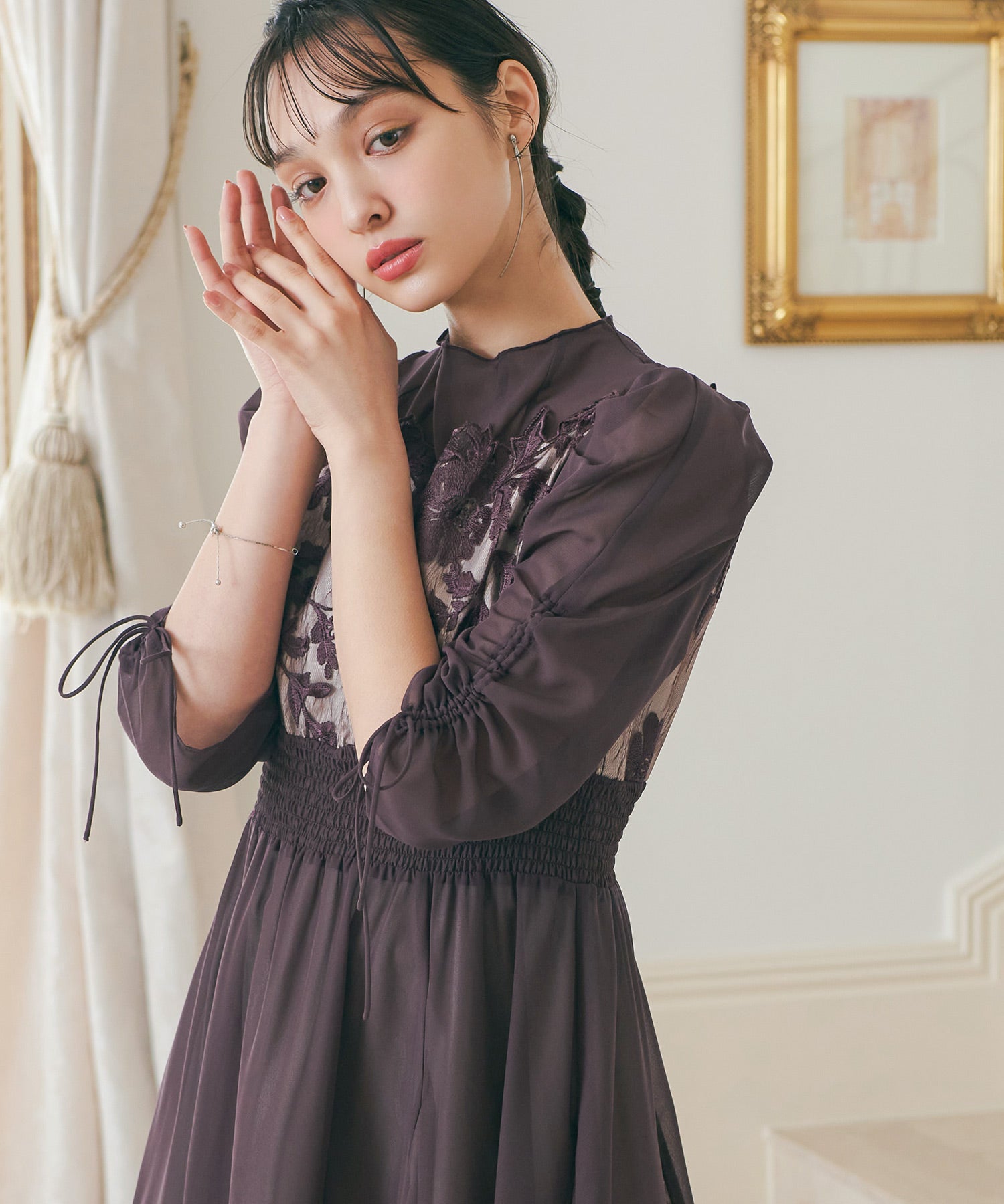 胸元のフラワーレースがクラシカルな印象を作る