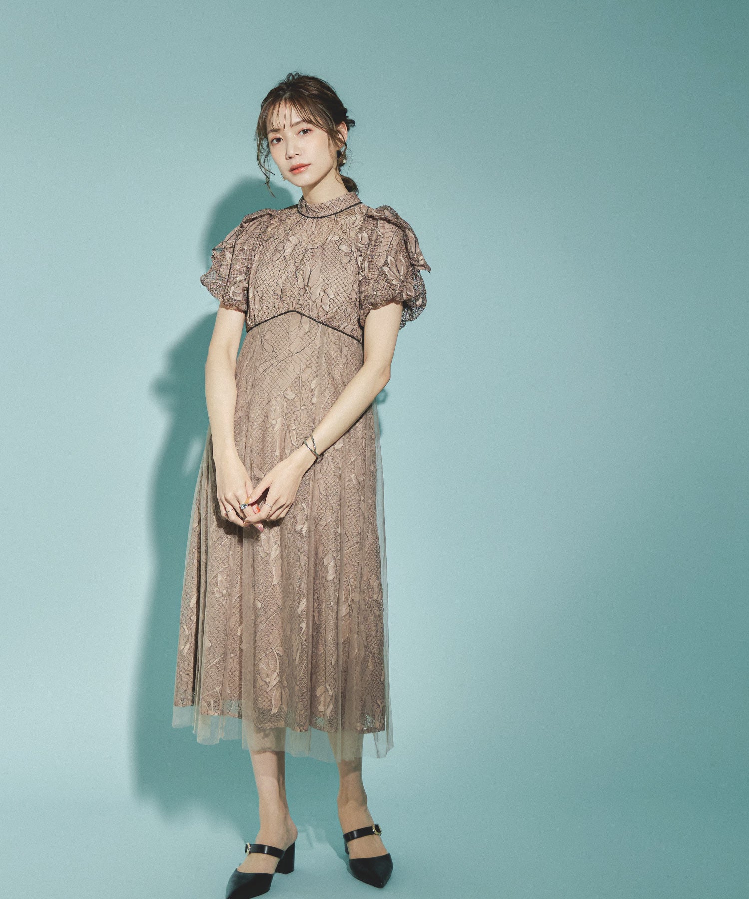 Rname 結婚式 ワンピース パーティードレス 総レース チュール レイヤード 花柄レース ロング丈 ボリューム袖 半袖 ロングドレス 他と被らない オケージョン 1.5次会 春夏 秋冬 二次会 謝恩会 成人式 同窓会 女子会 お呼ばれ 二の腕カバー 入学式 卒業式 ベージュ ピンク ネイビー