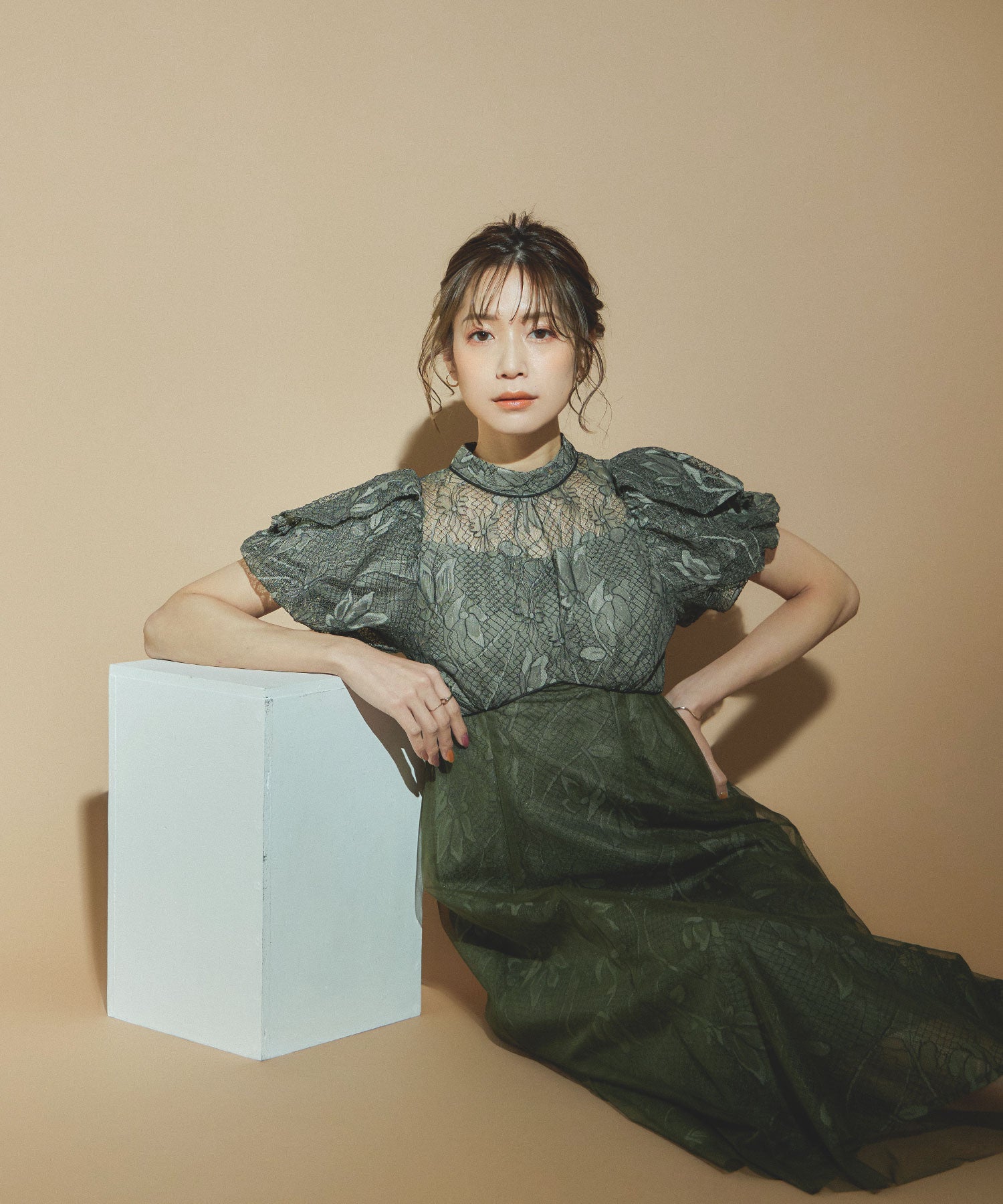デコルテ部分の程よい肌見せで大人レディな雰囲気を演出。