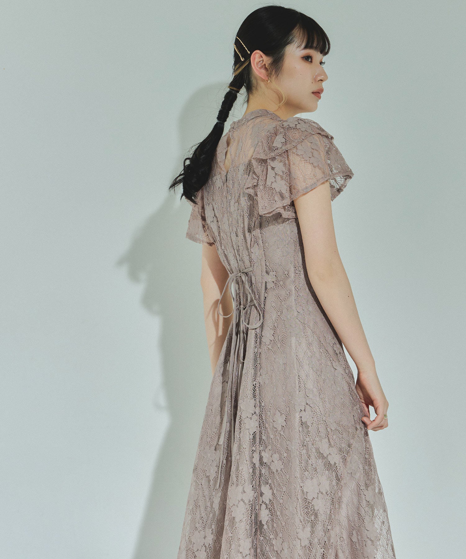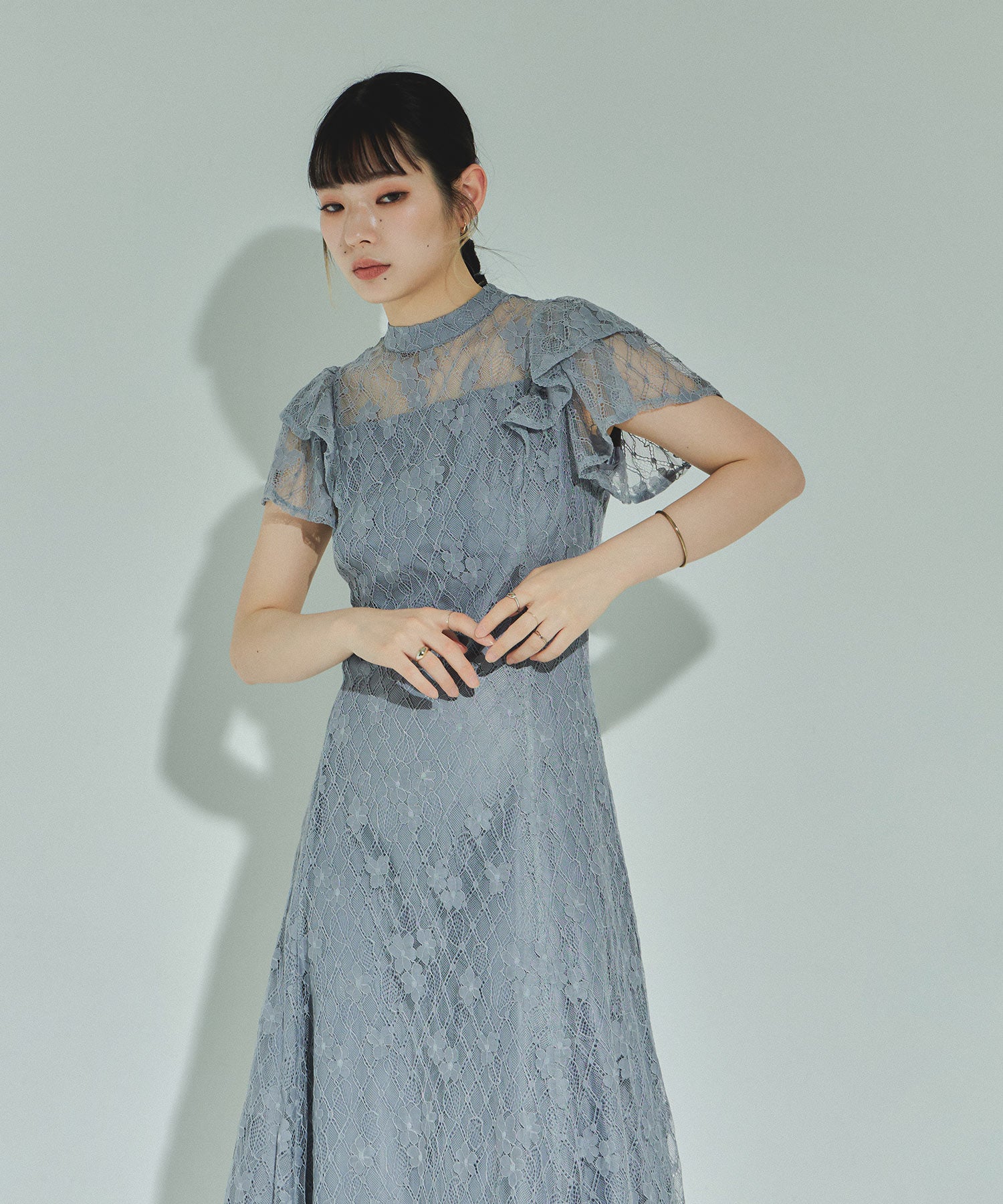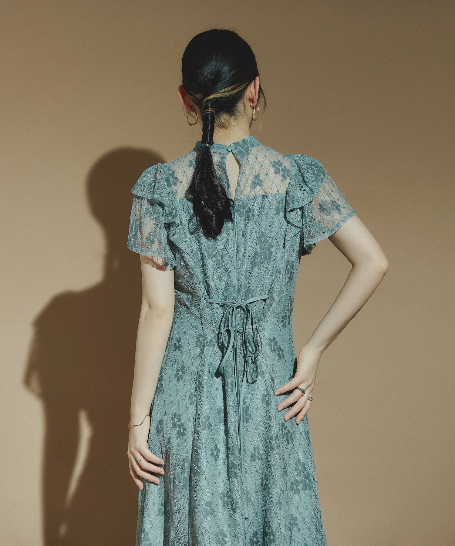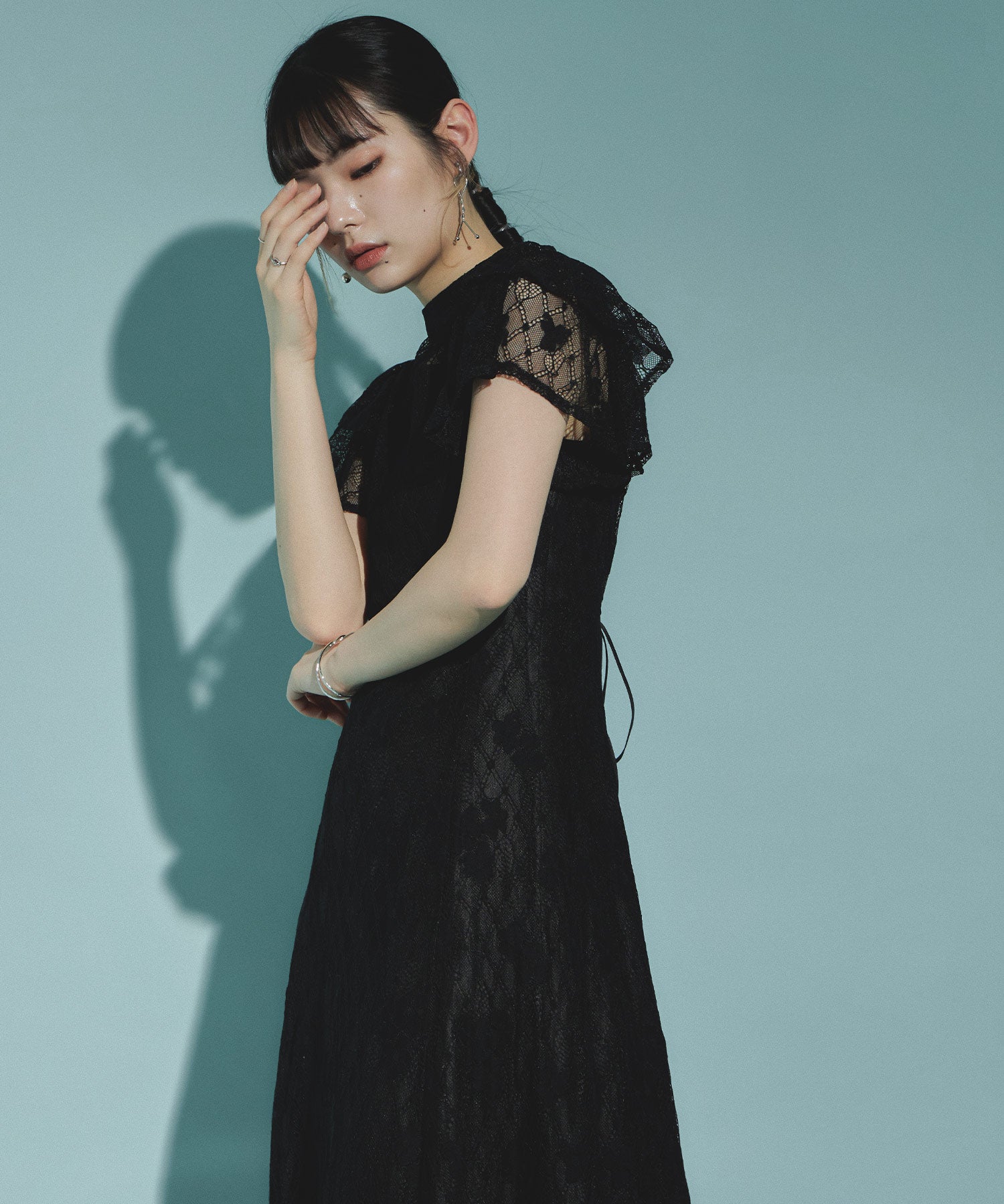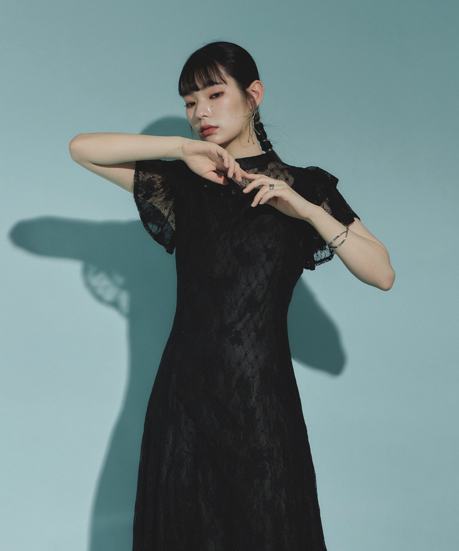目を惹く花柄レースを全身に纏い、ダブルフリルスリーブで