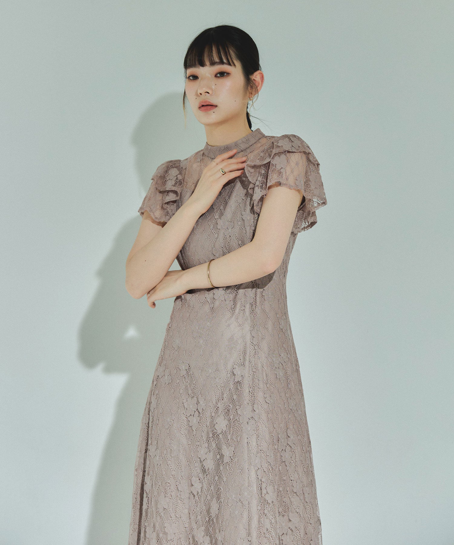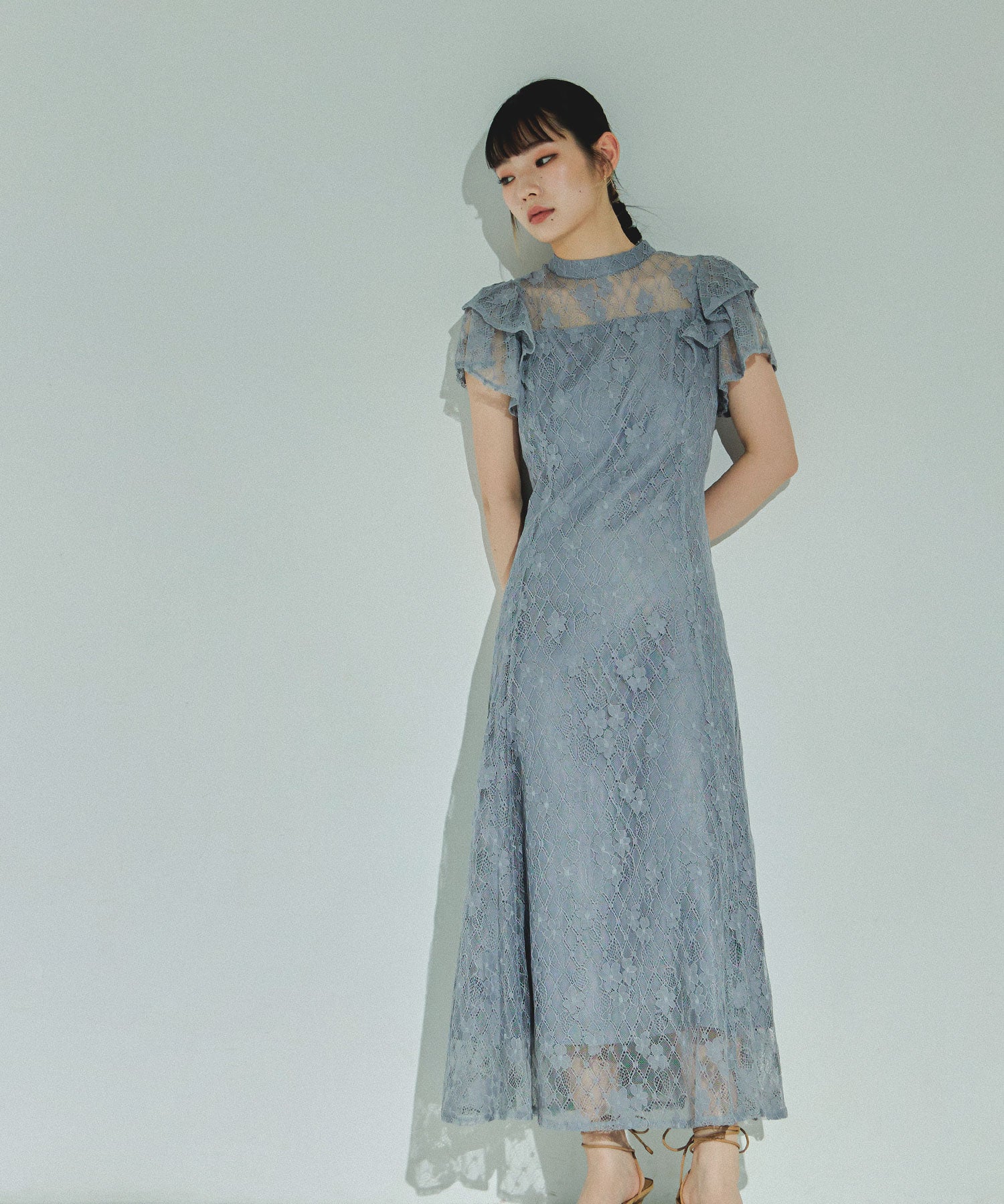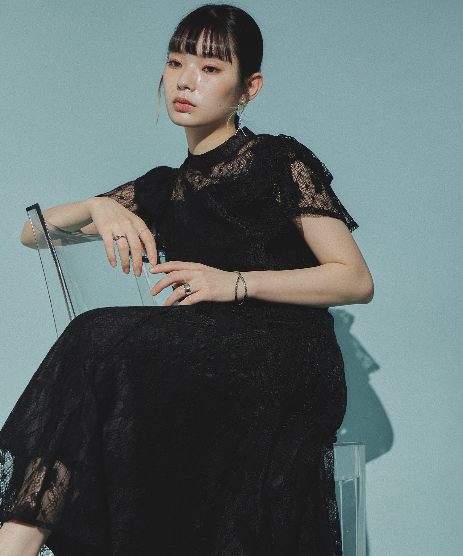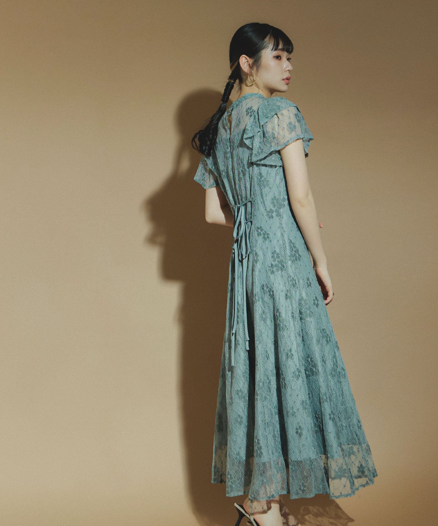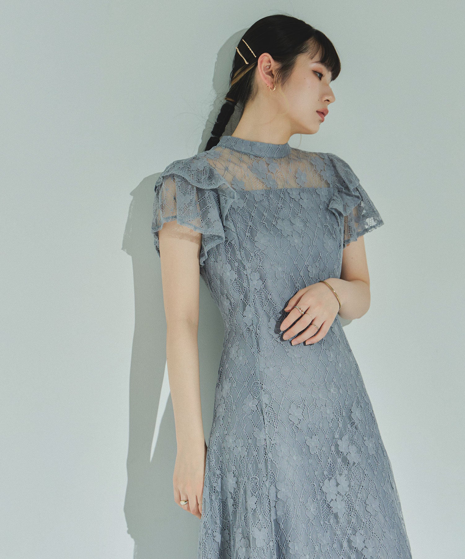 目を惹く花柄レースを全身に纏い、ダブルフリルスリーブで