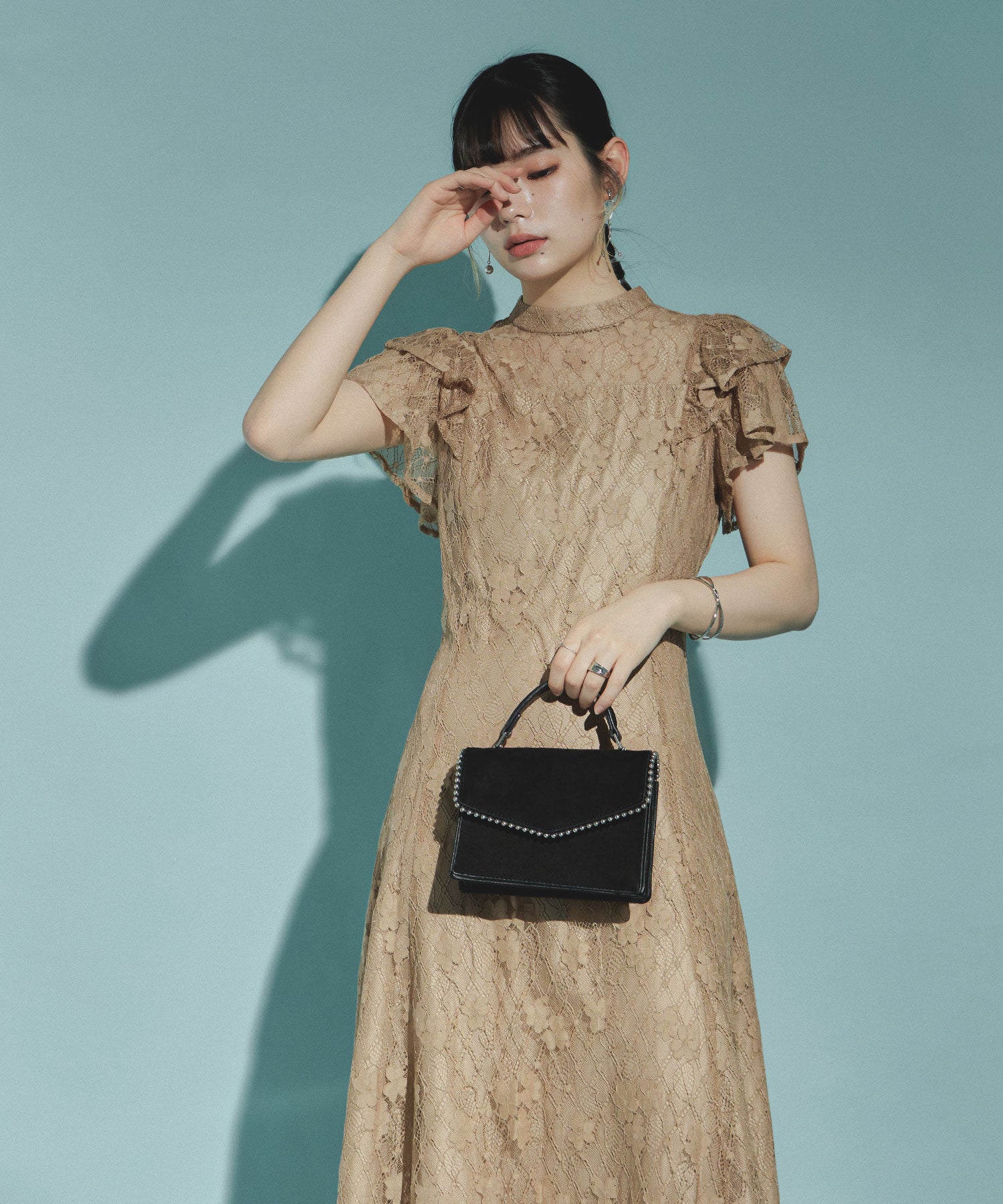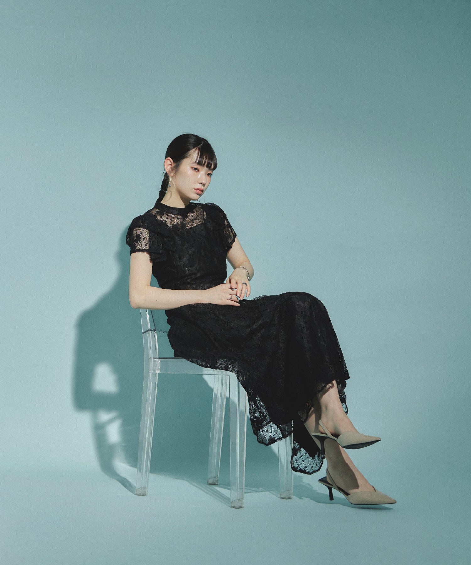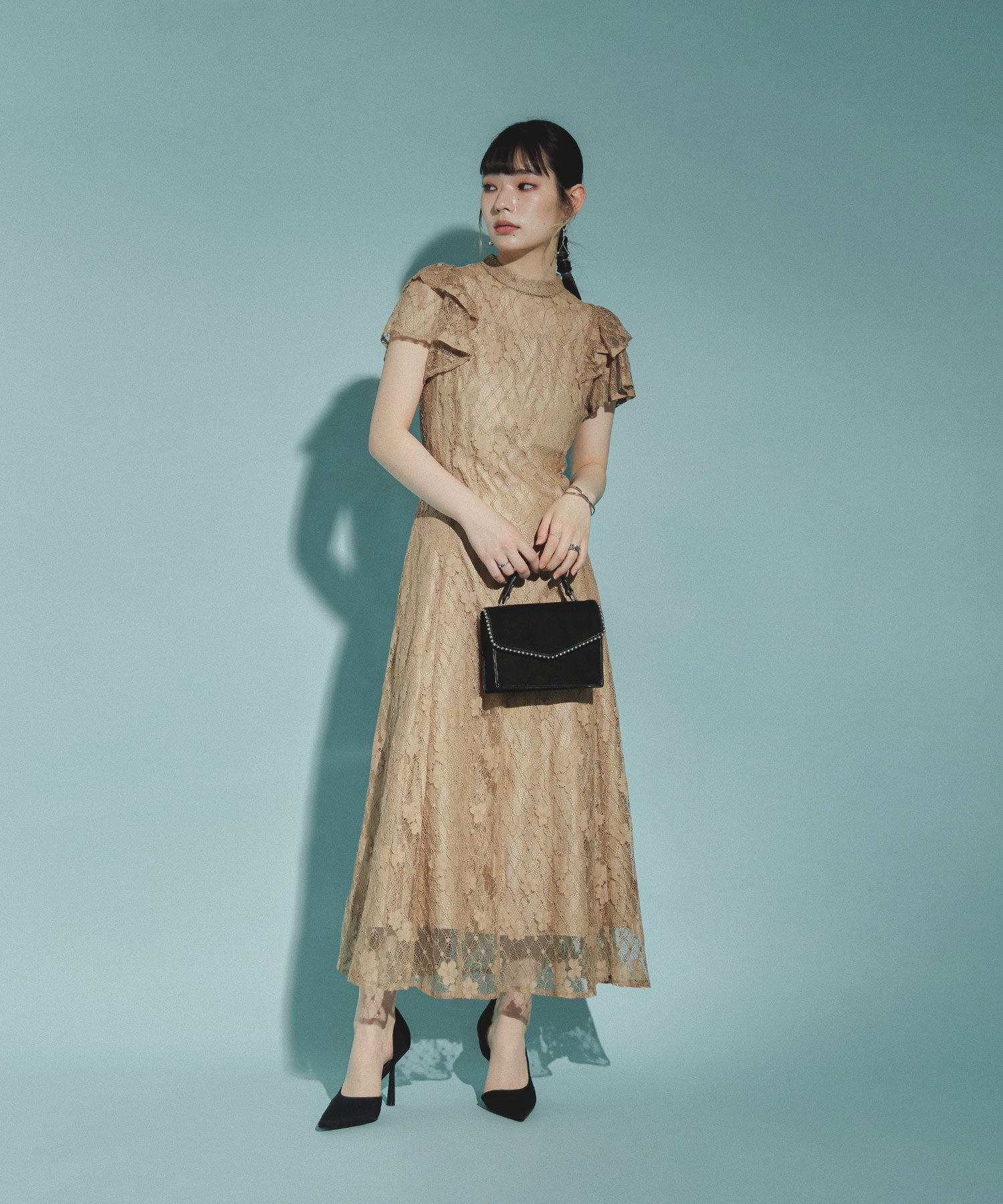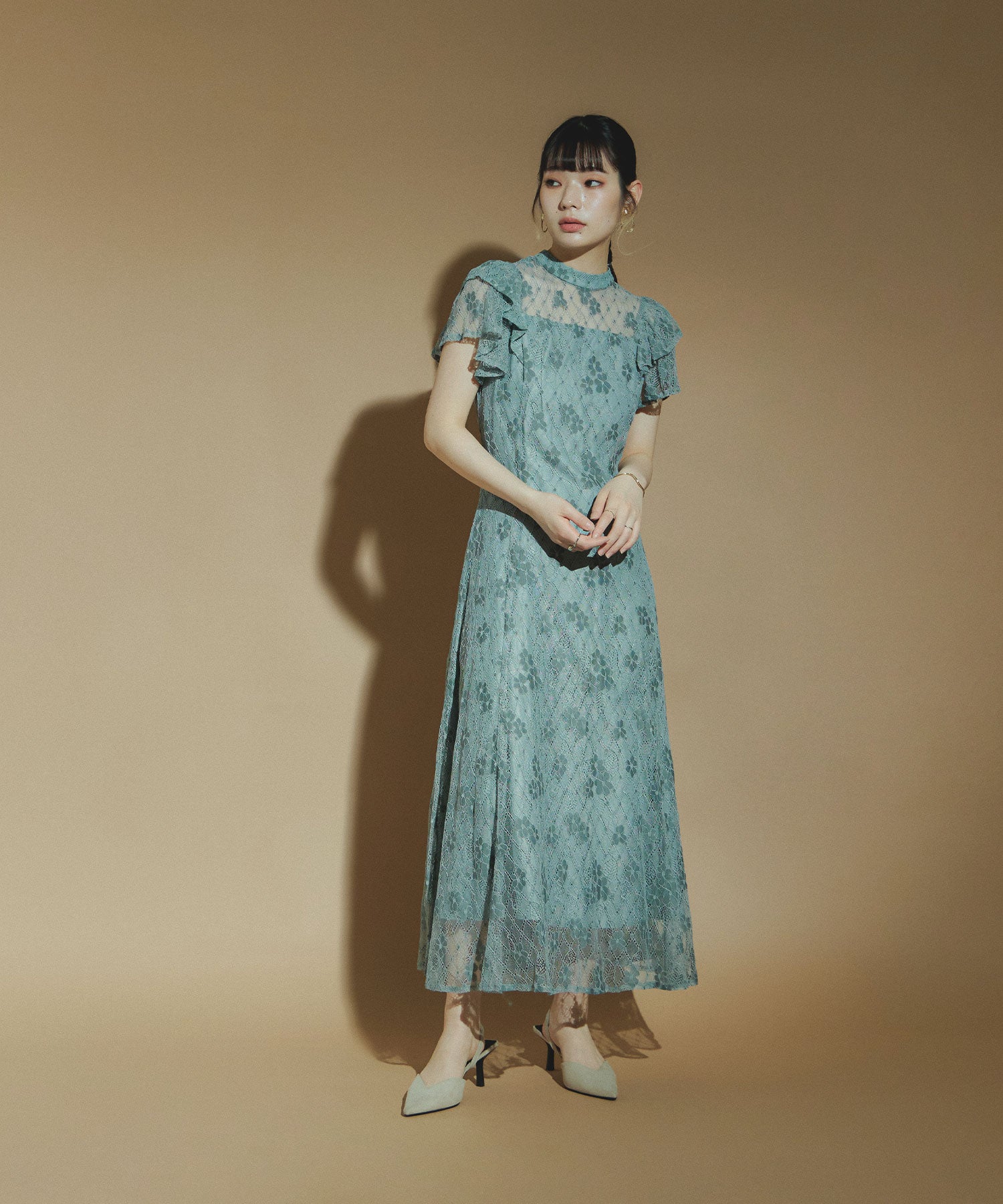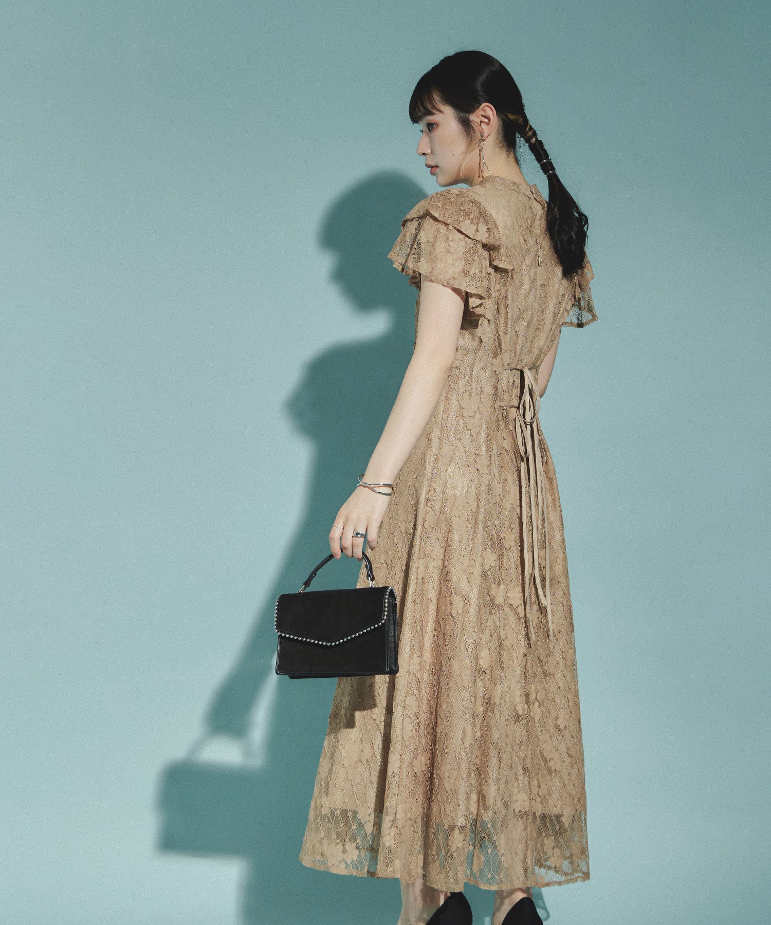 目を惹く花柄レースを全身に纏い、ダブルフリルスリーブで
