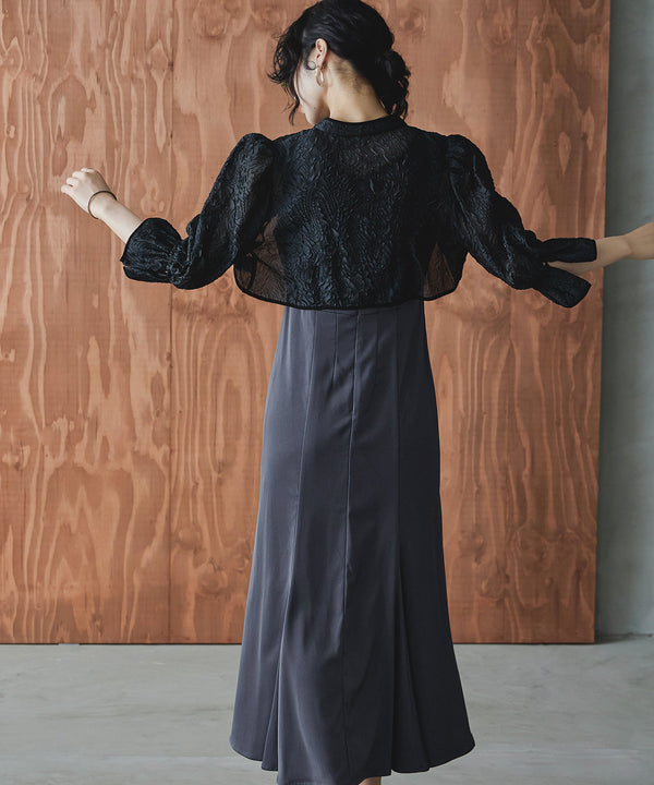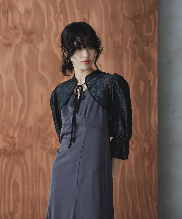 ショート丈ボレロは前後で着回し可能で、程よい透け感が抜け感を与えて