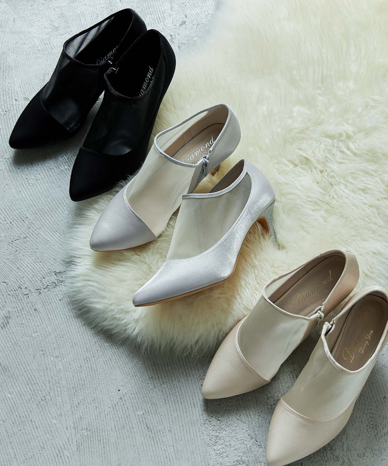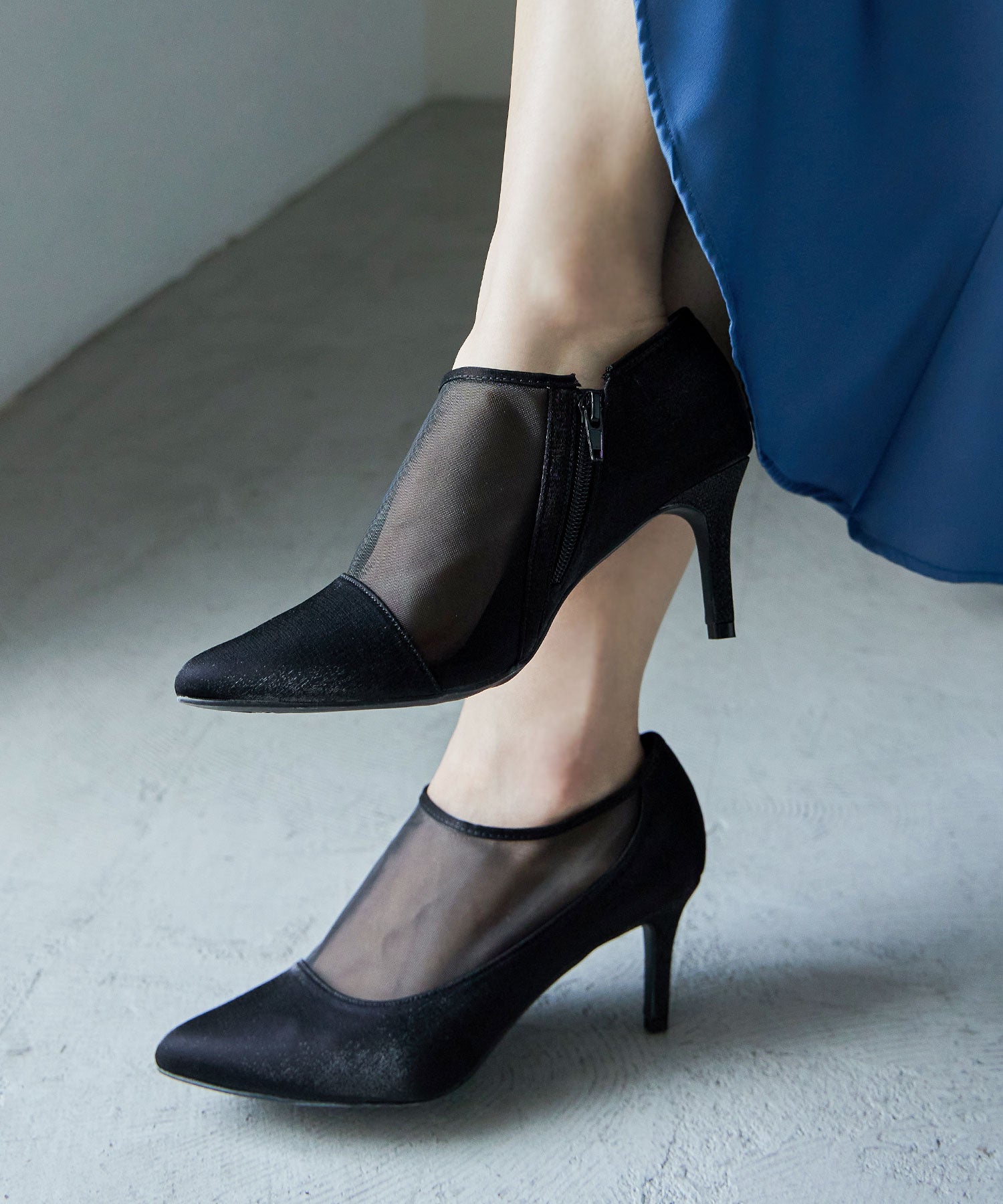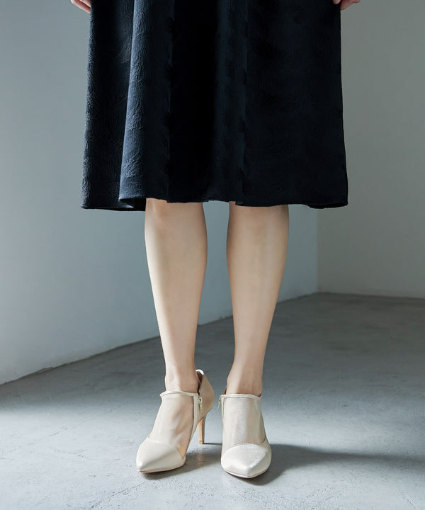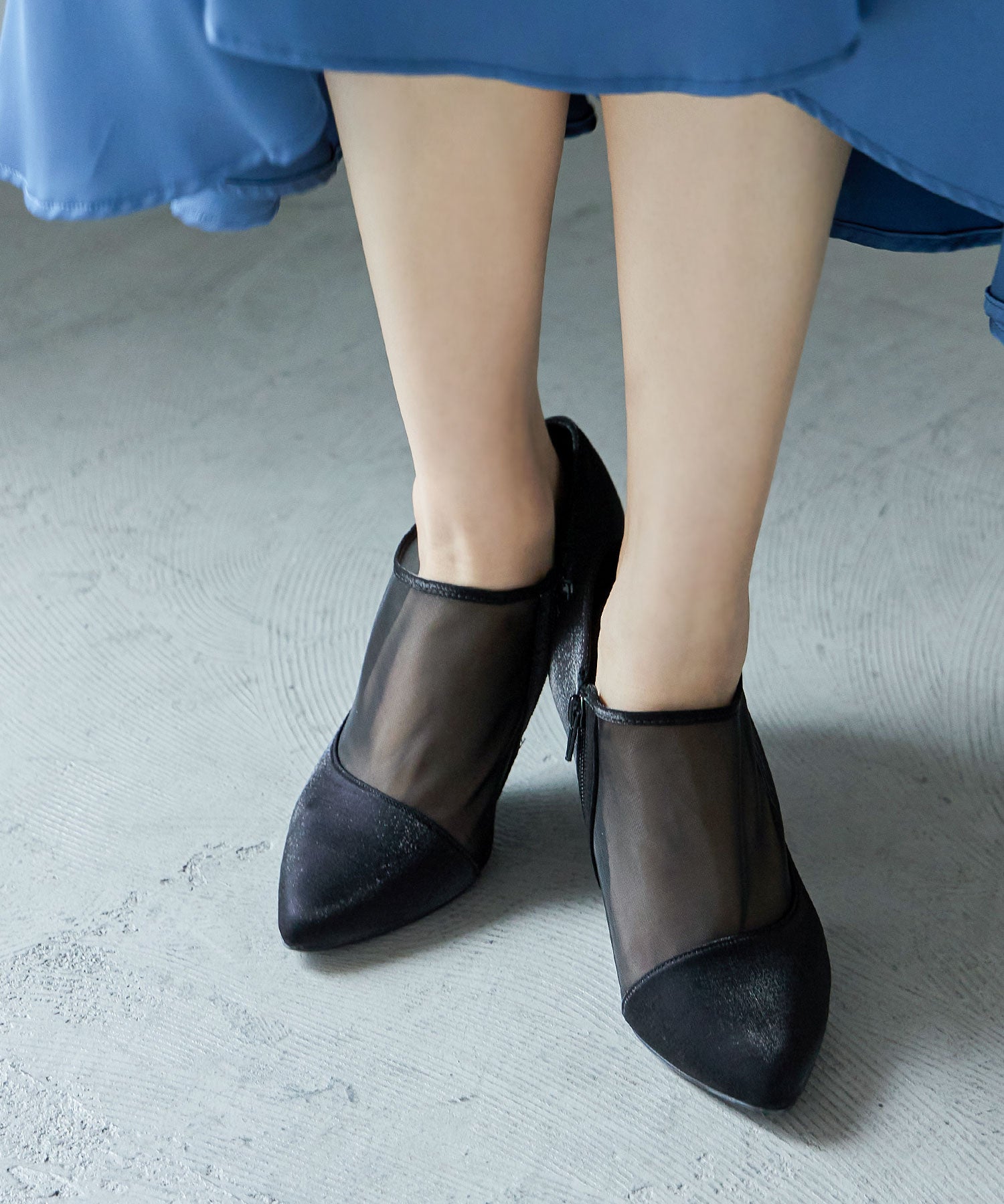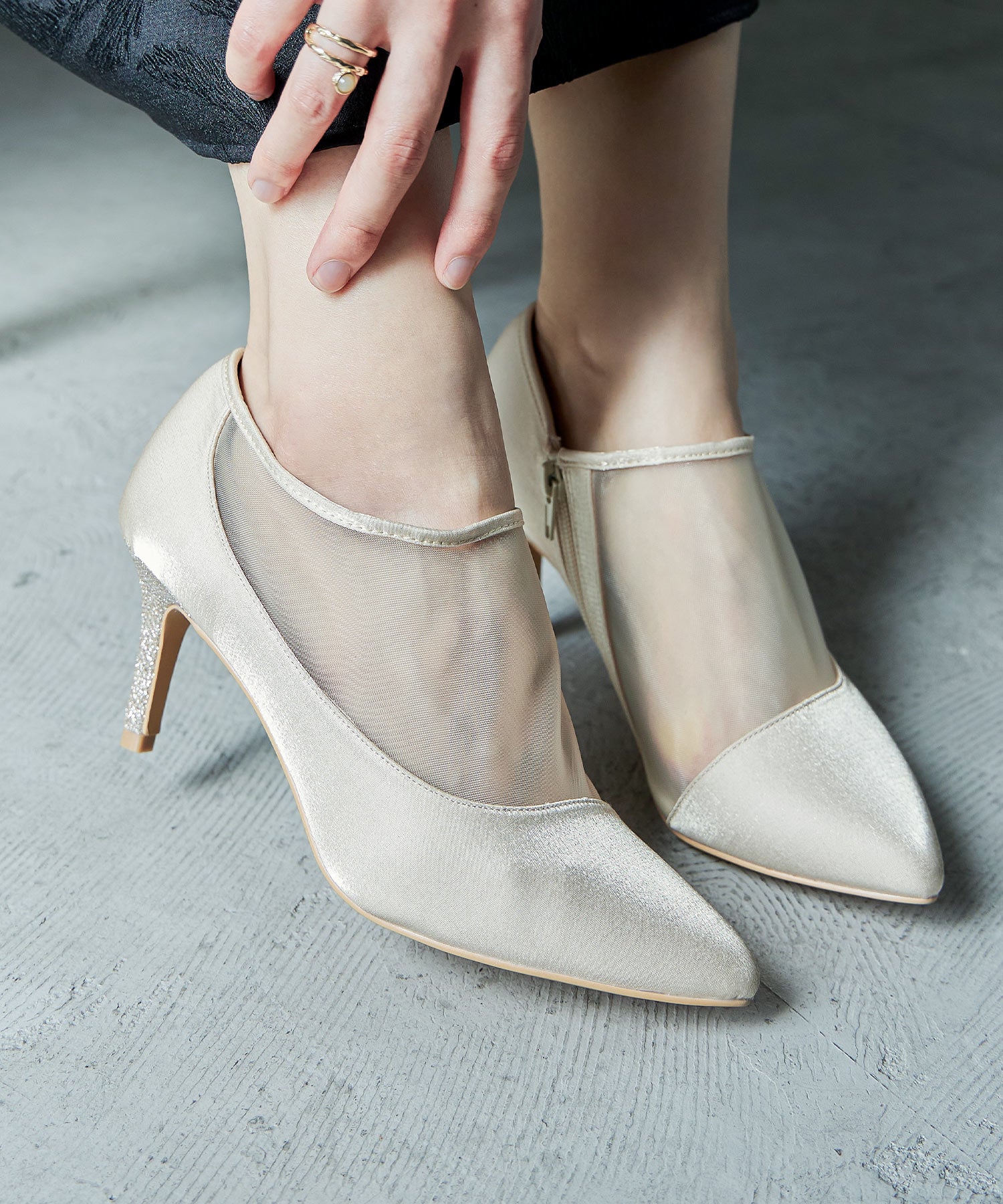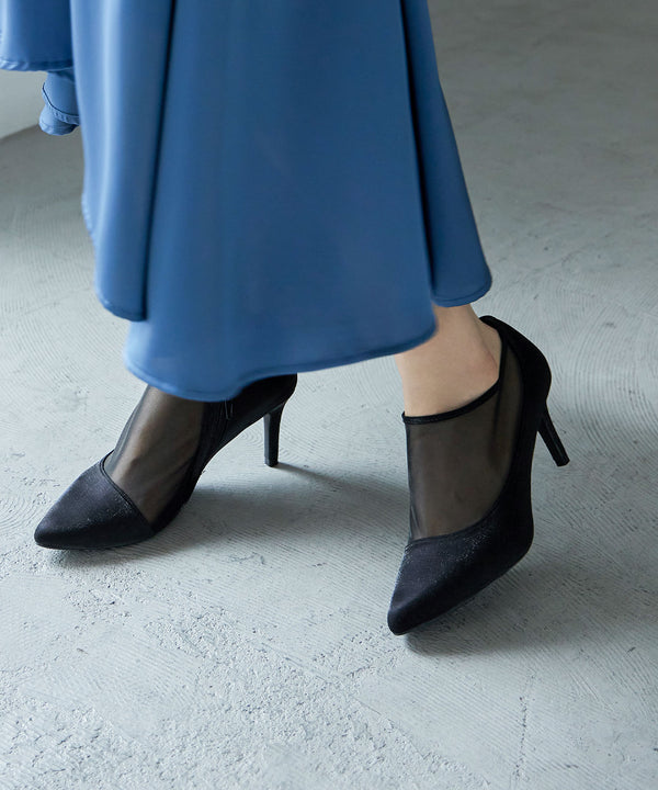 艶やかなサテンと透け感が美しいメッシュを組み合わせたブーティーパンプス。