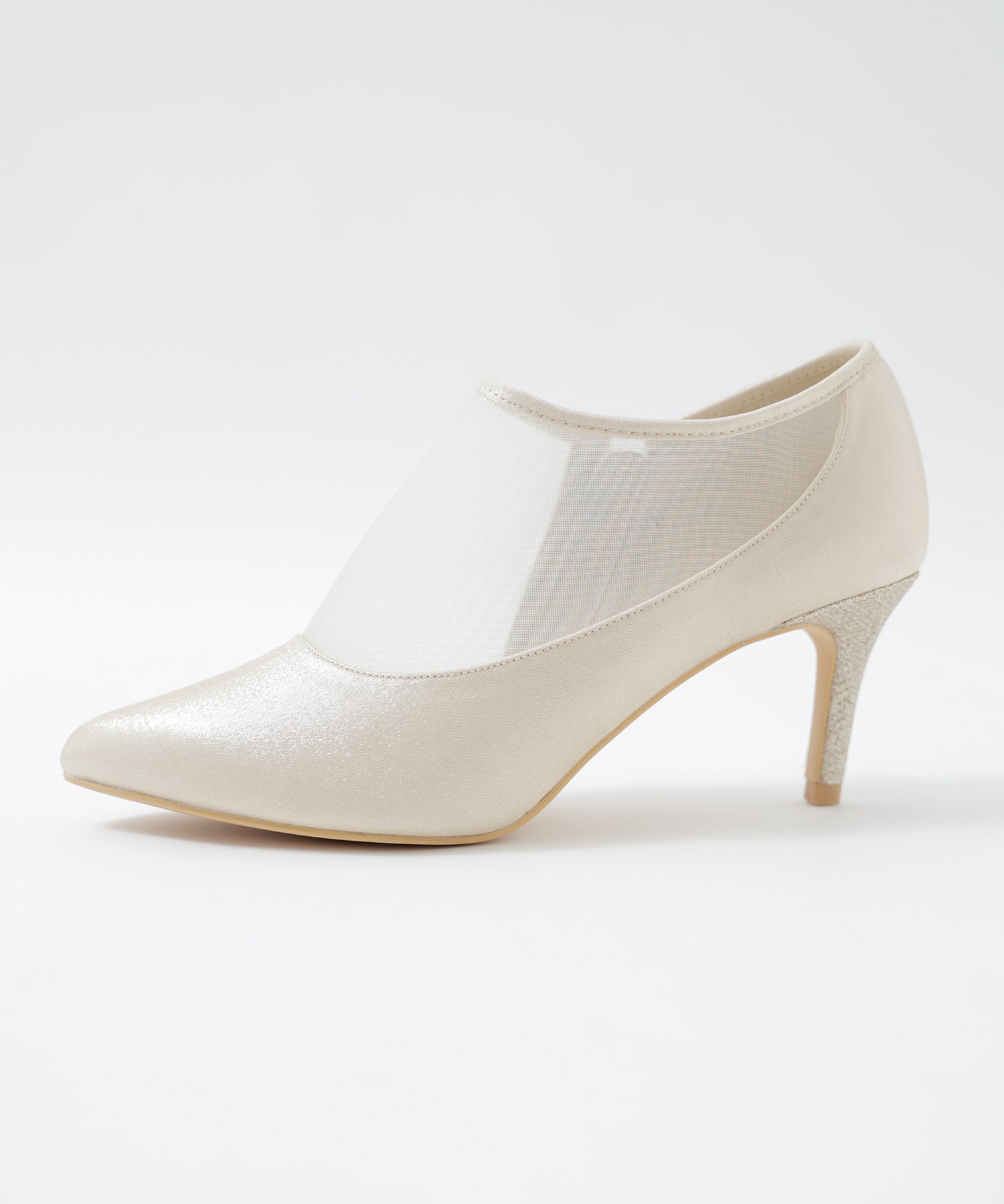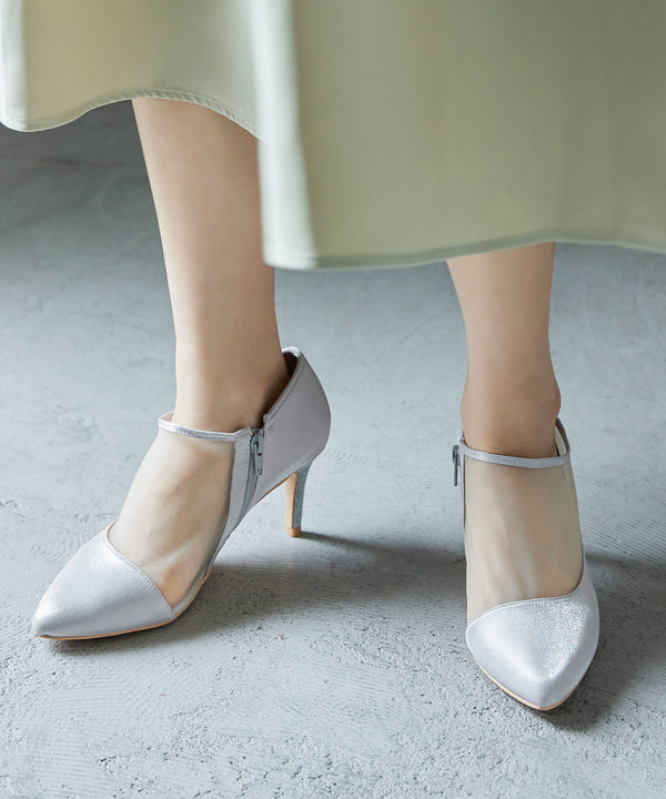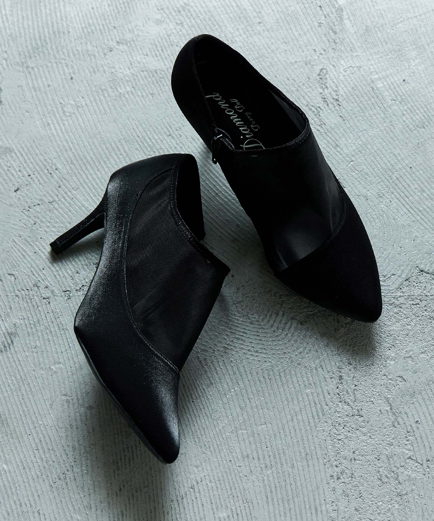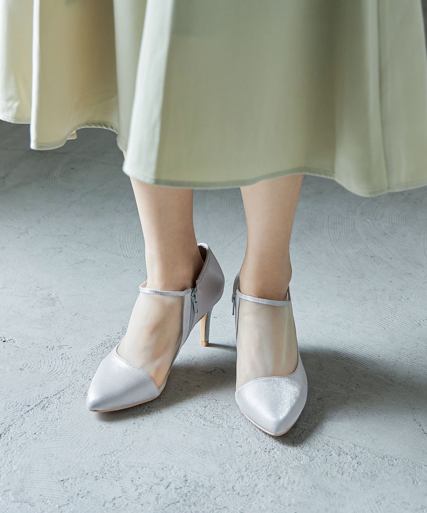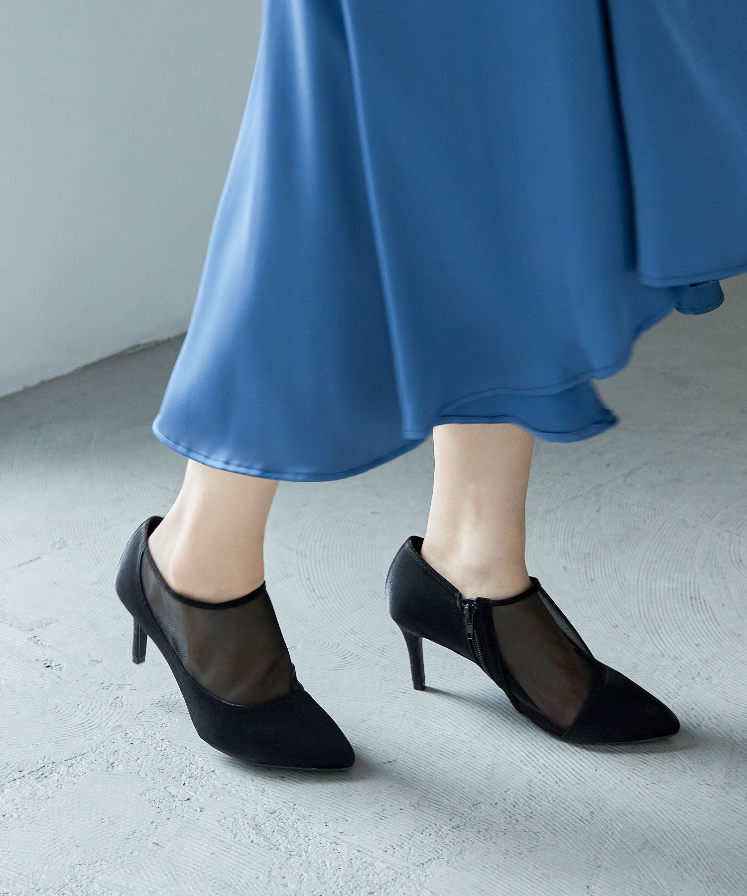 艶やかなサテンと透け感が美しいメッシュを組み合わせたブーティーパンプス。