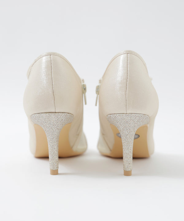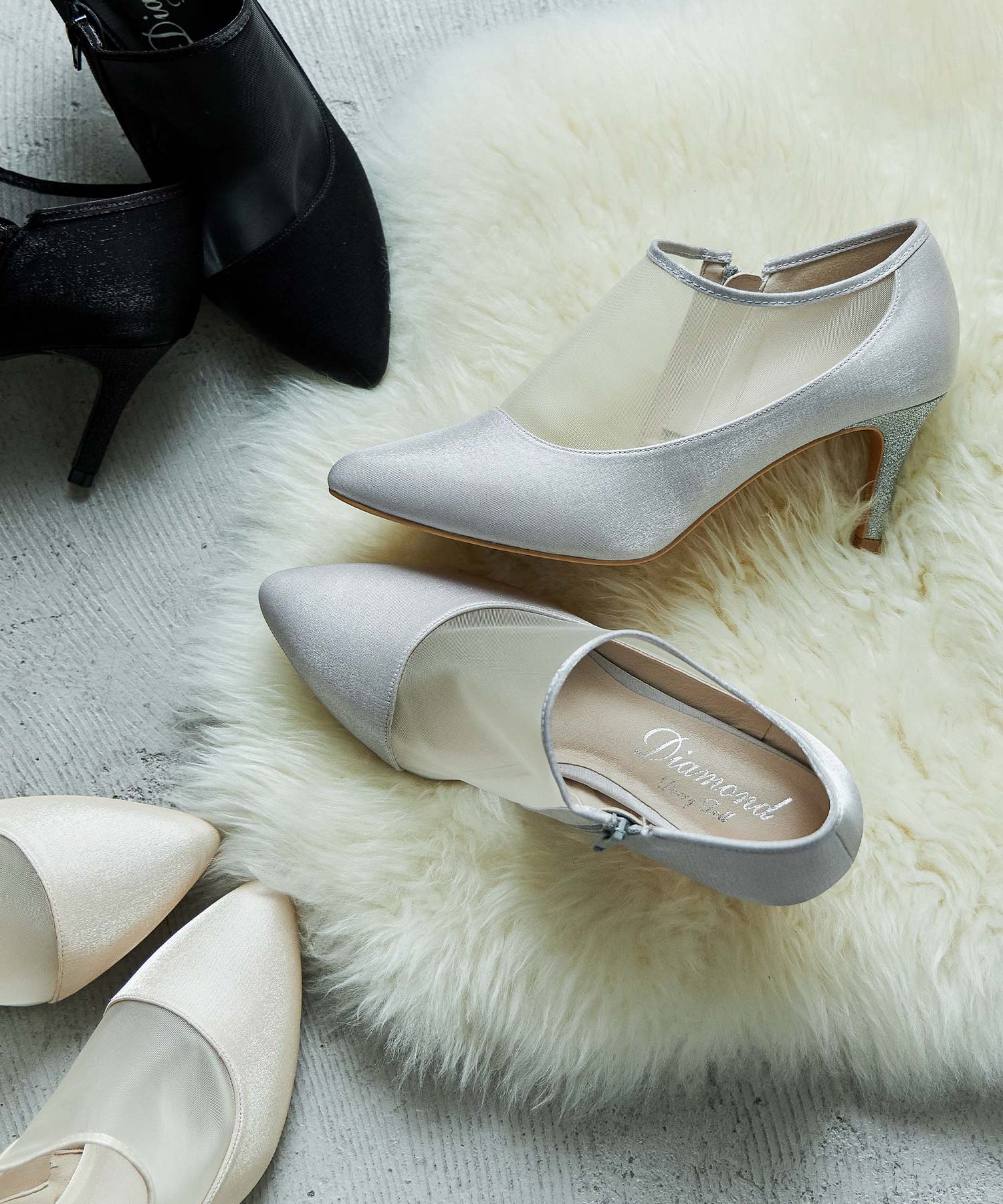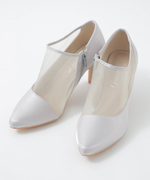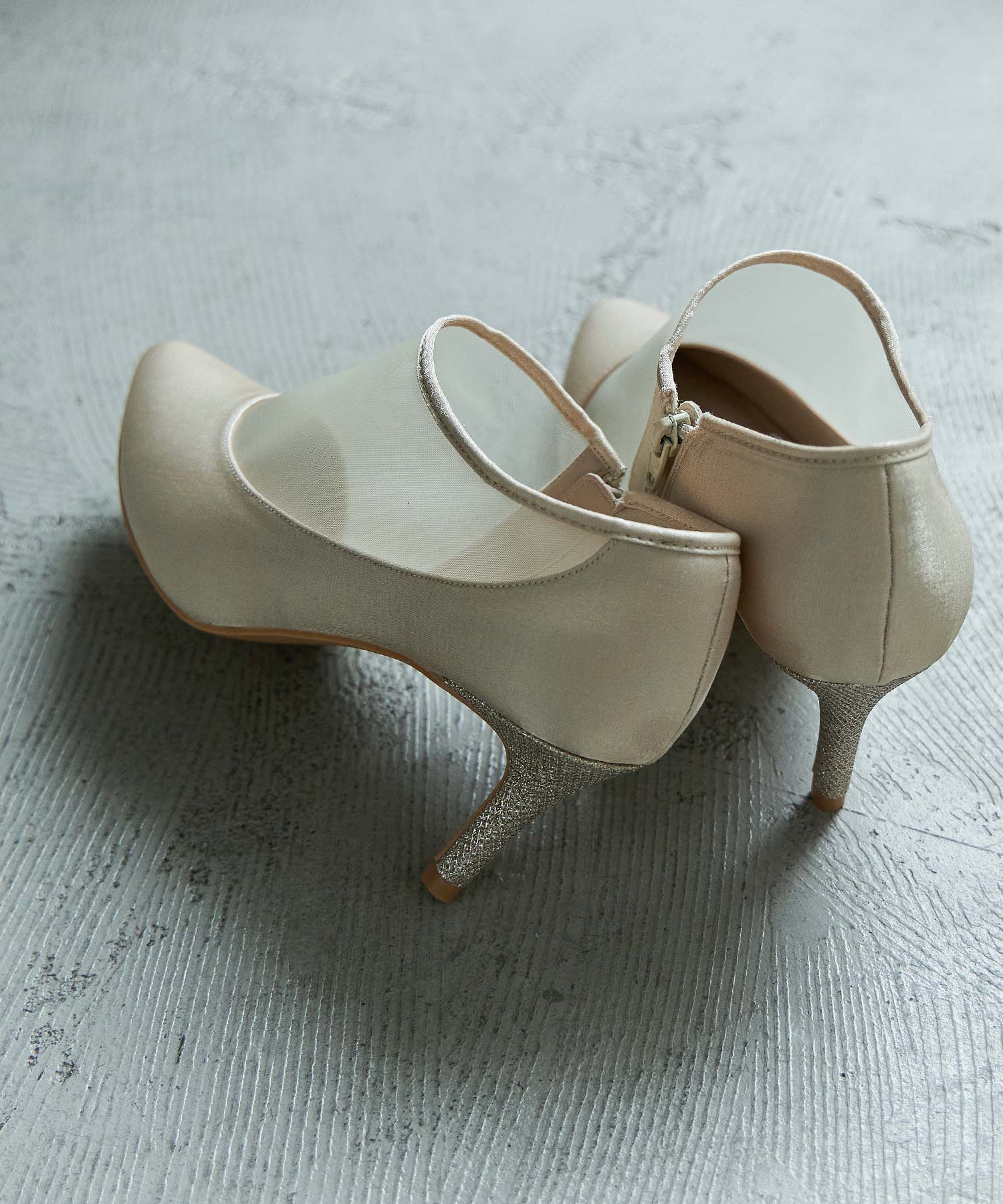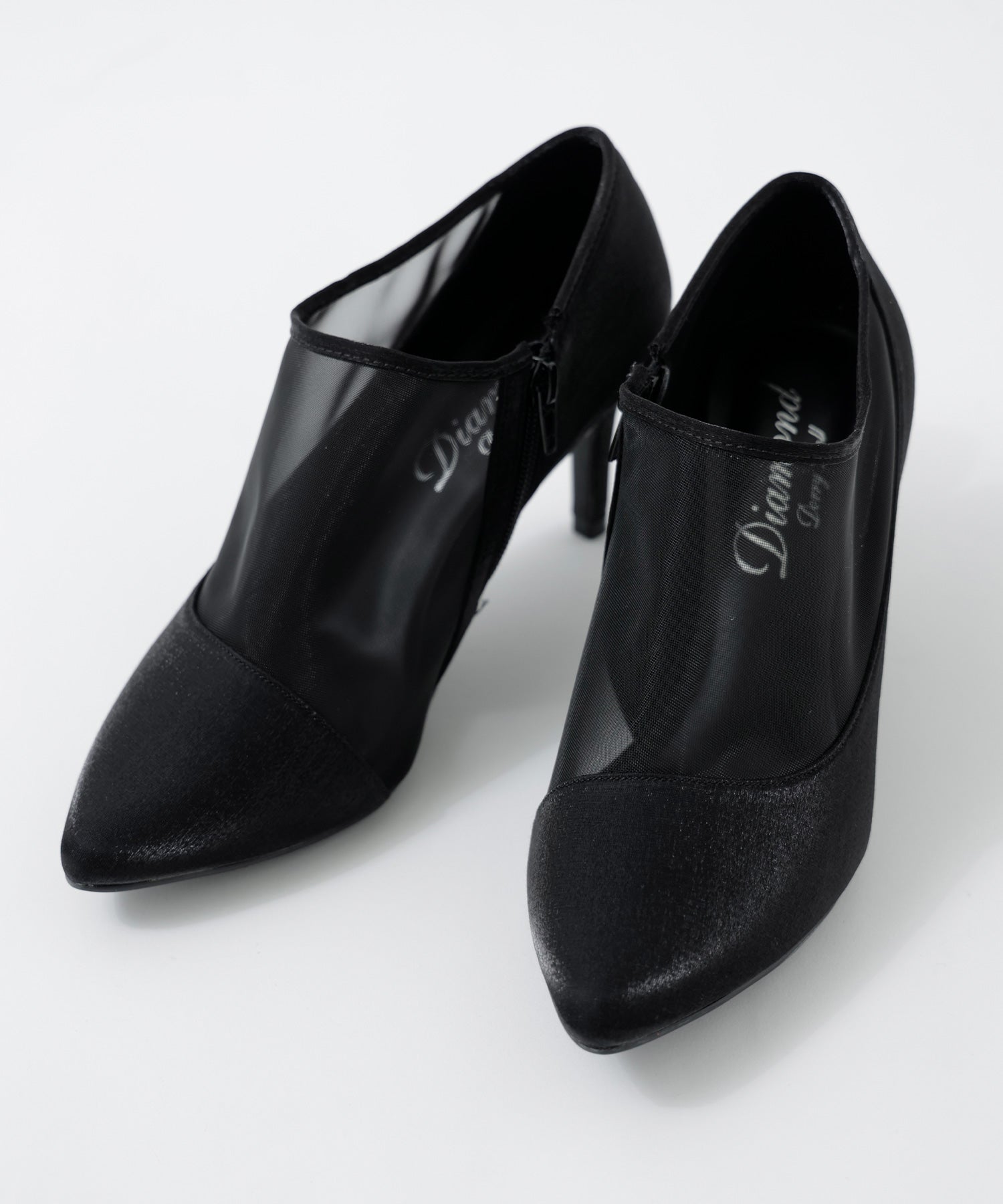 艶やかなサテンと透け感が美しいメッシュを組み合わせたブーティーパンプス。