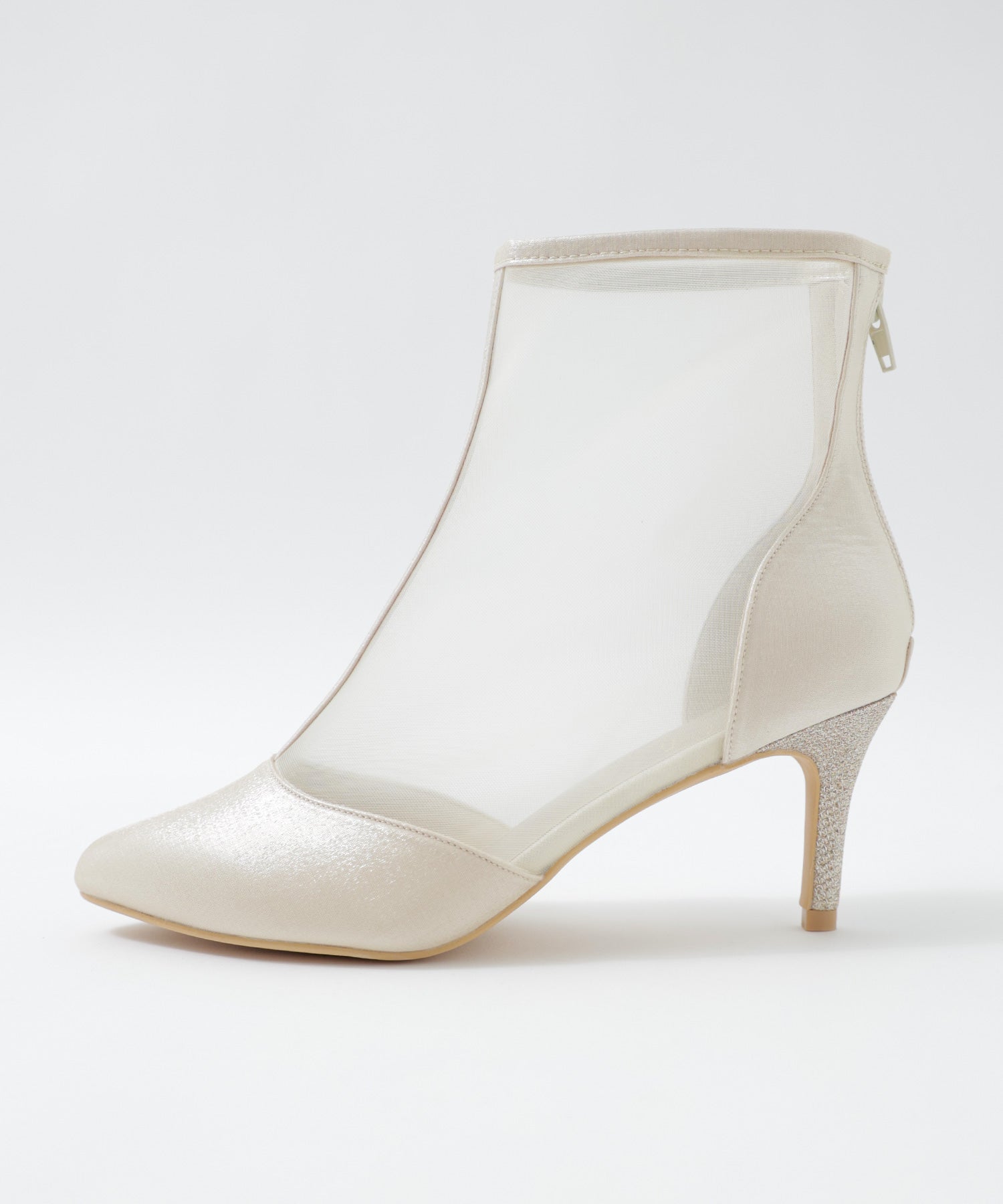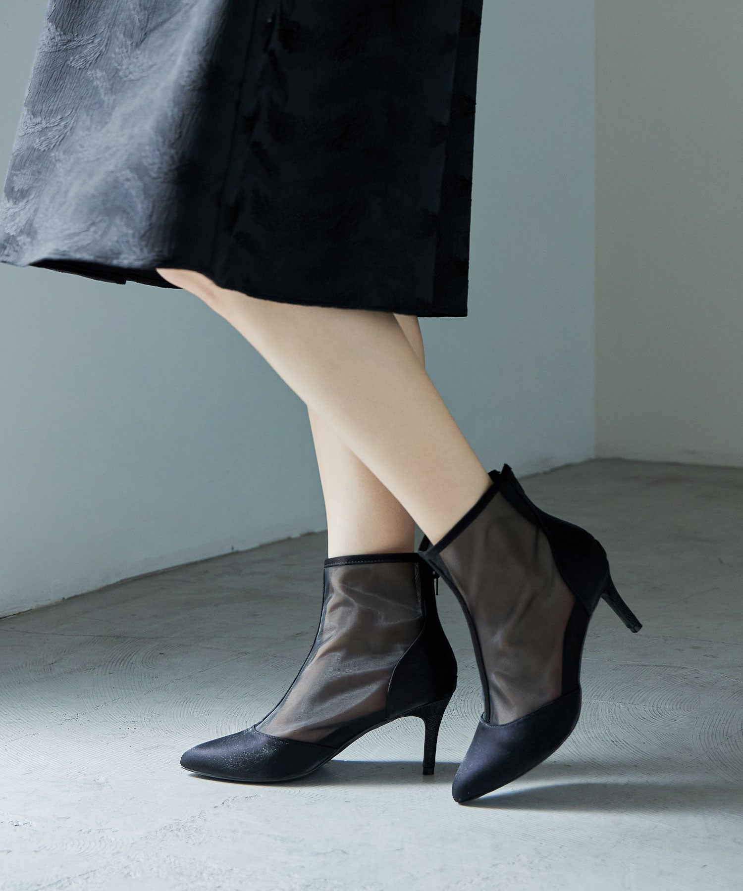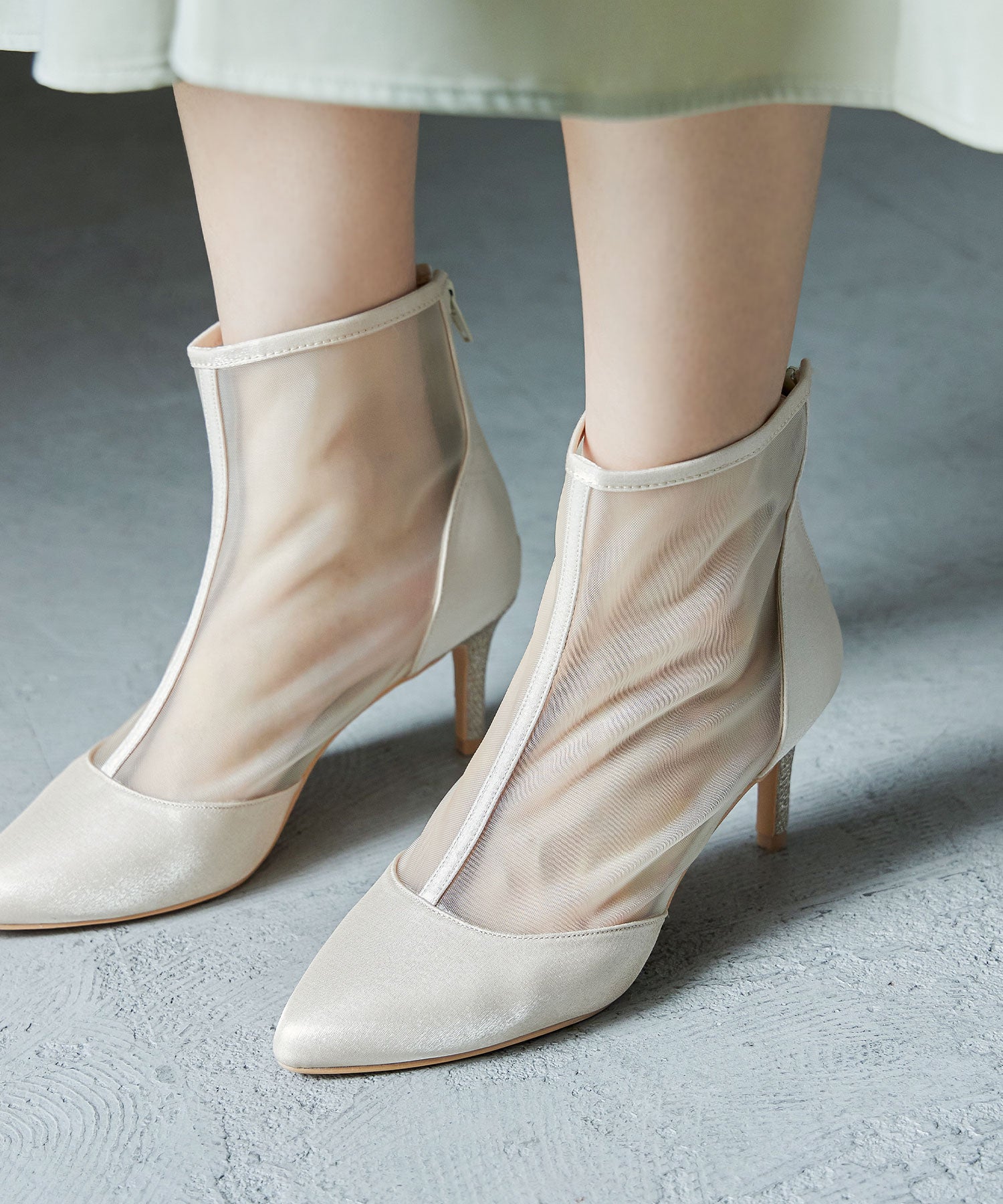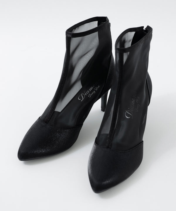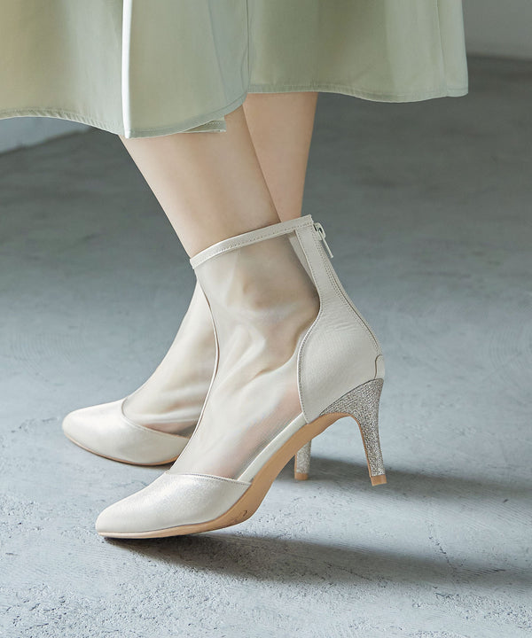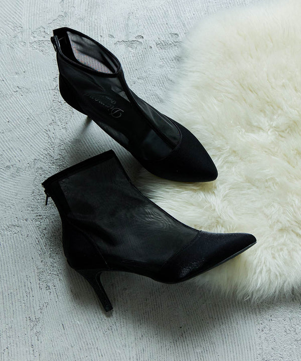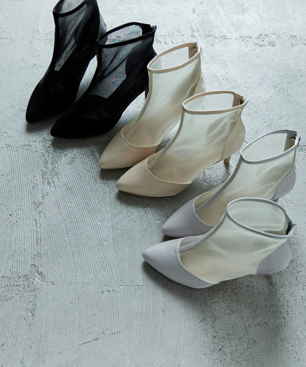 艶やかなサテンと透け感が美しいメッシュを組み合わせたショートブーツ。