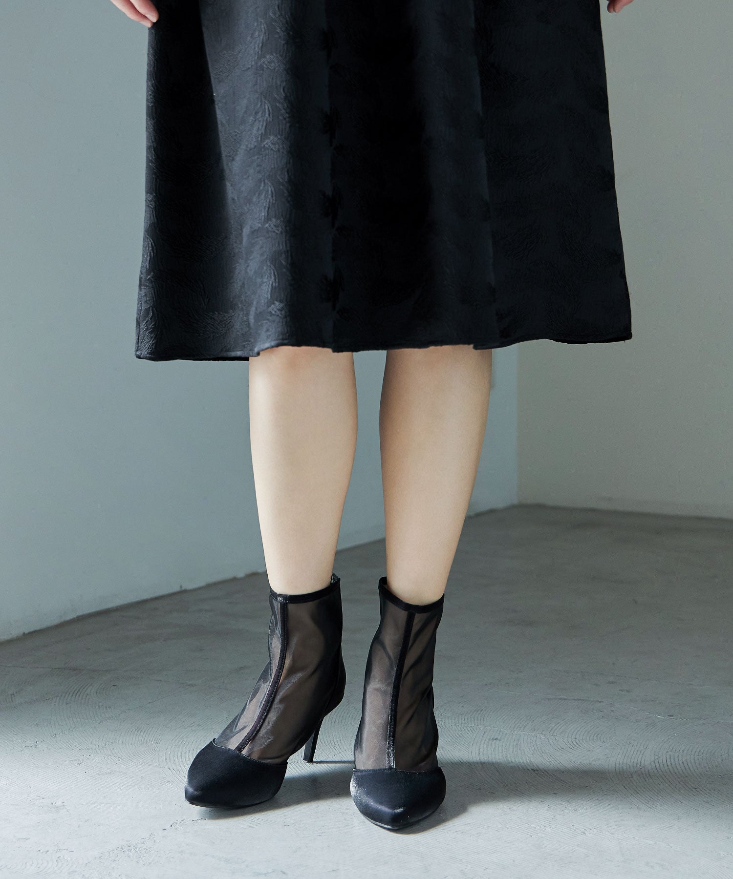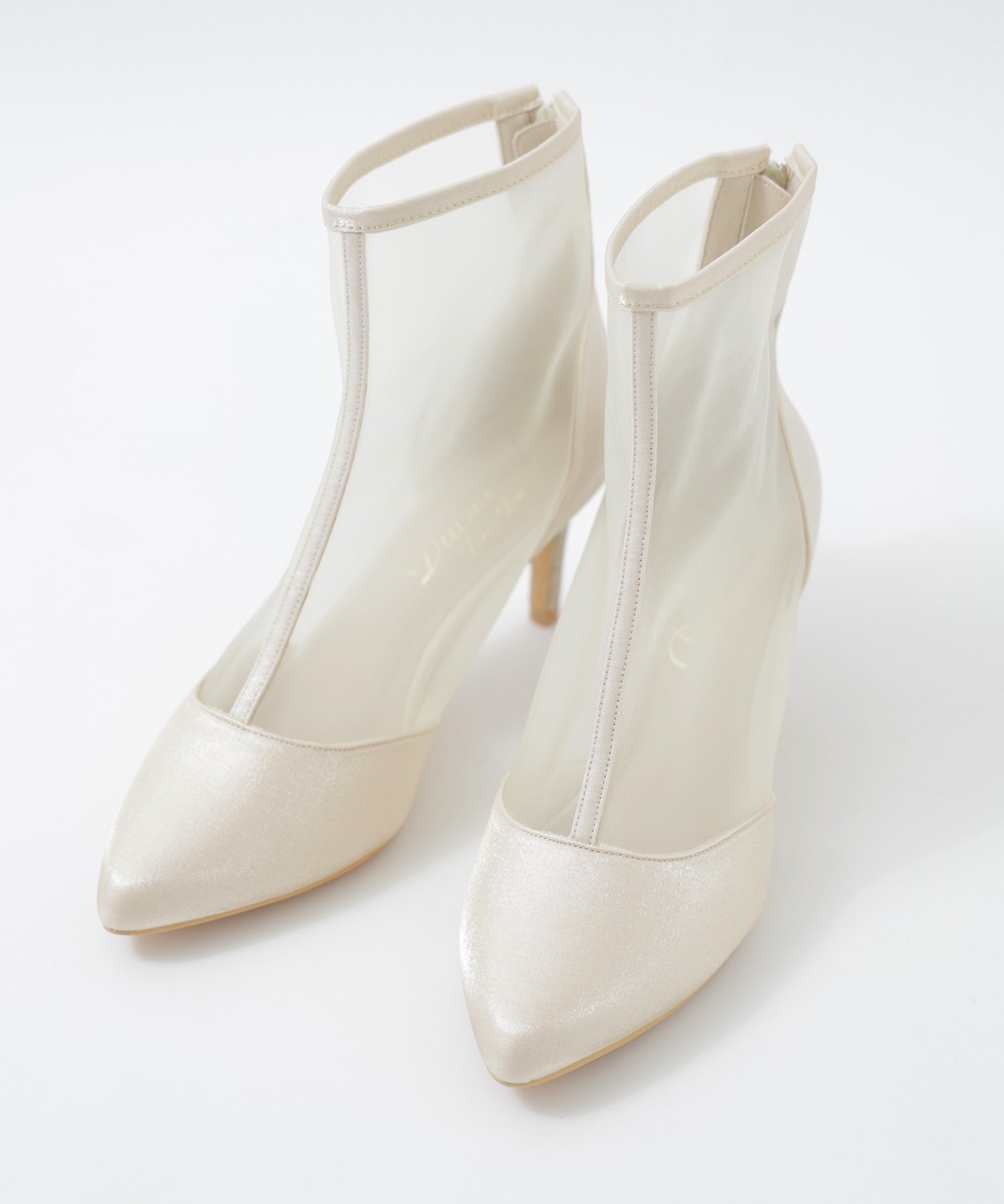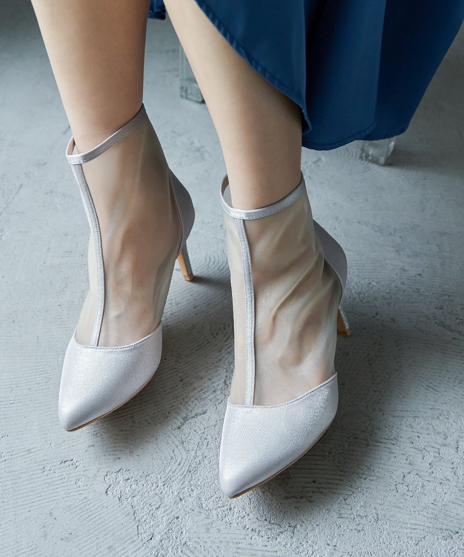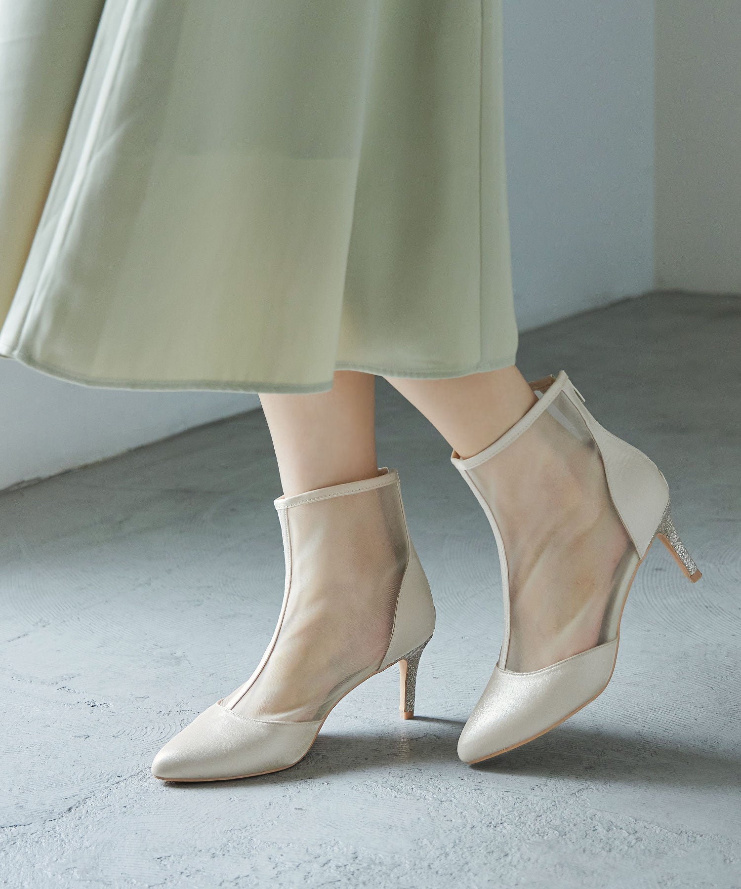 艶やかなサテンと透け感が美しいメッシュを組み合わせたショートブーツ。