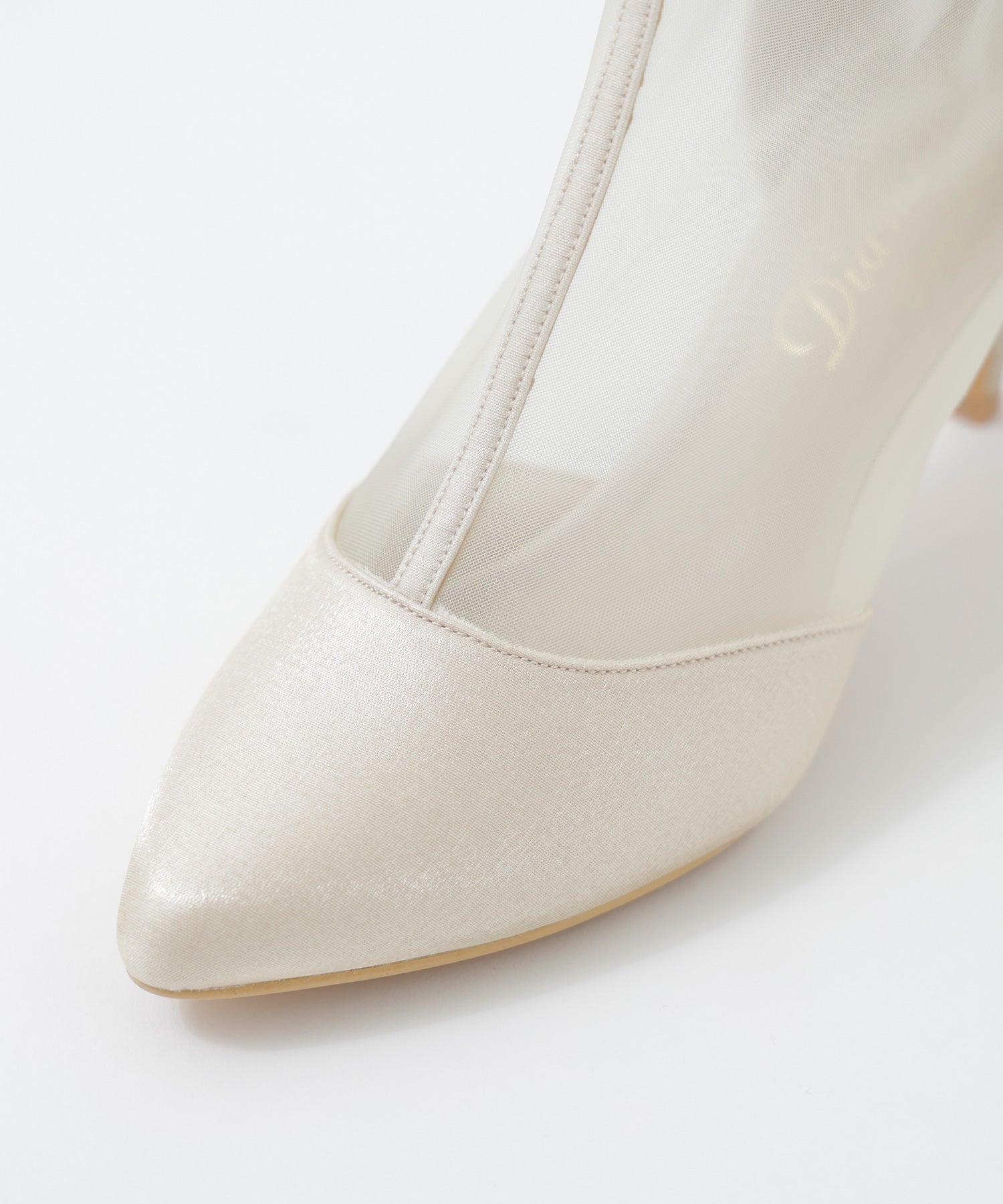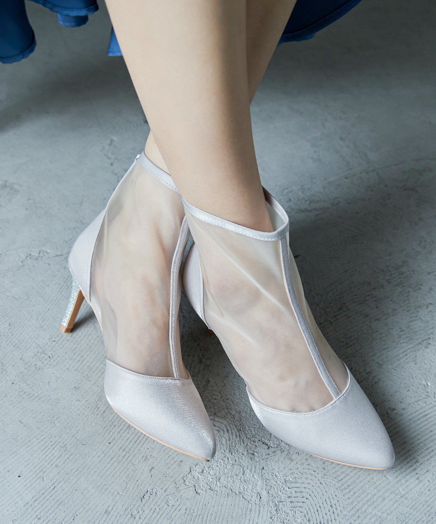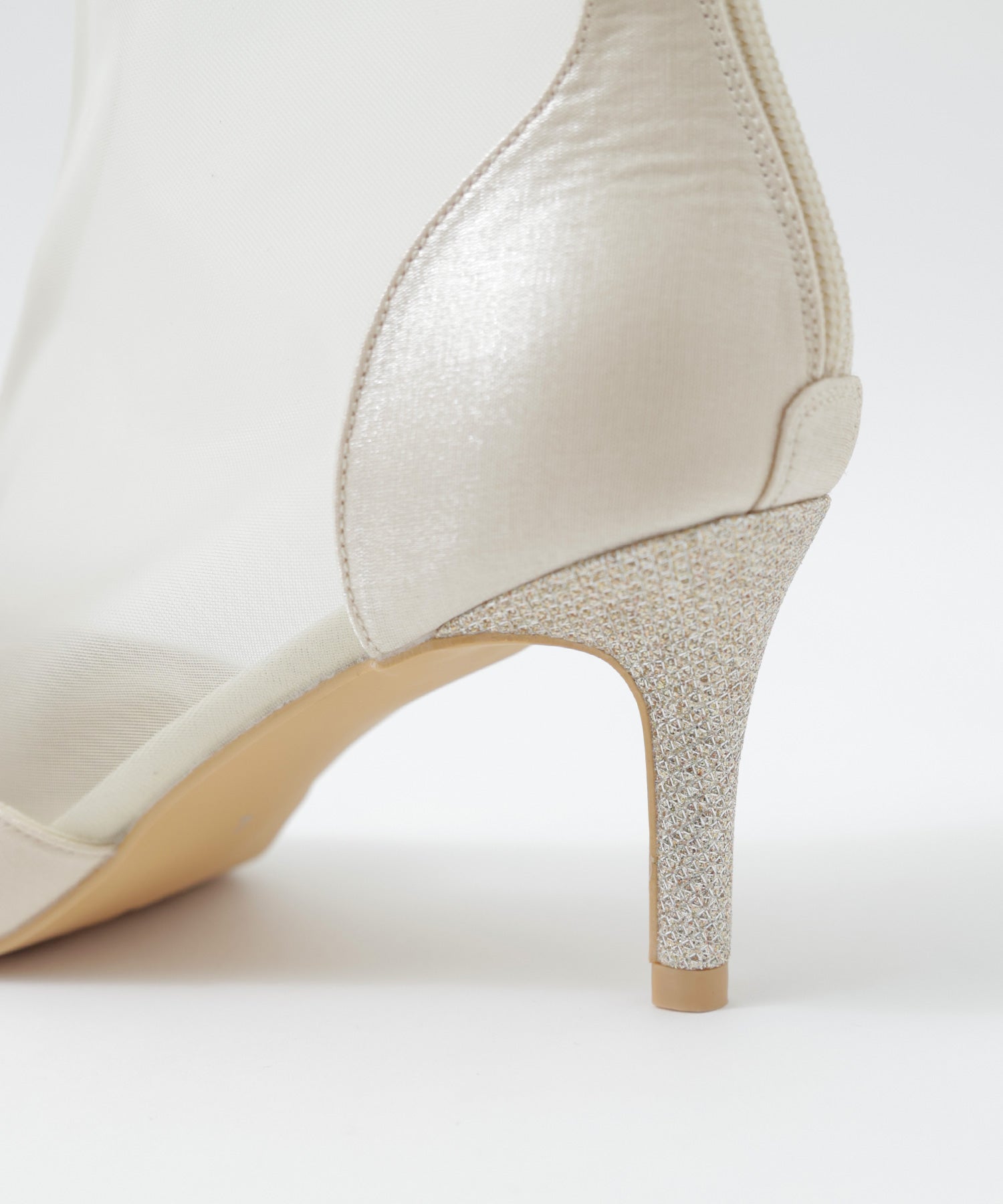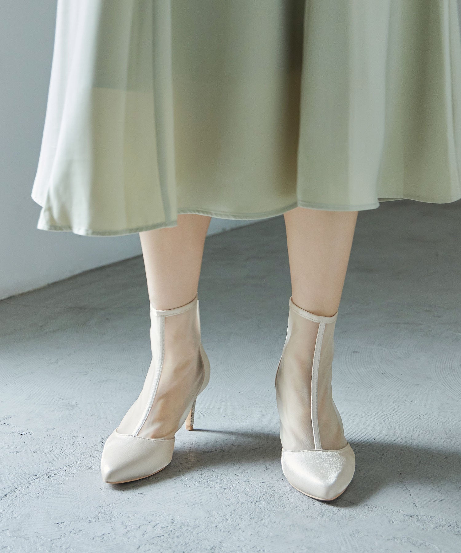 艶やかなサテンと透け感が美しいメッシュを組み合わせたショートブーツ。