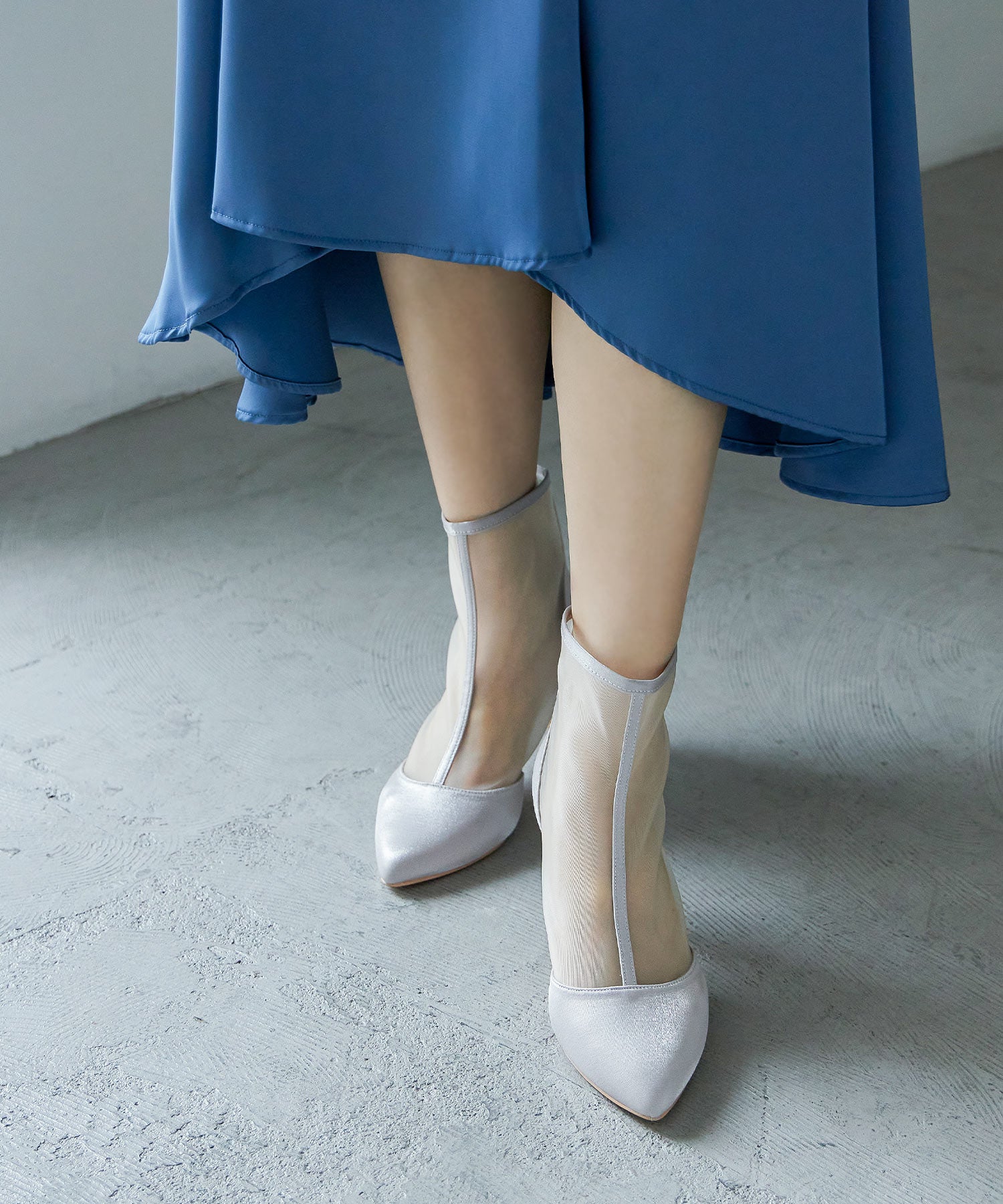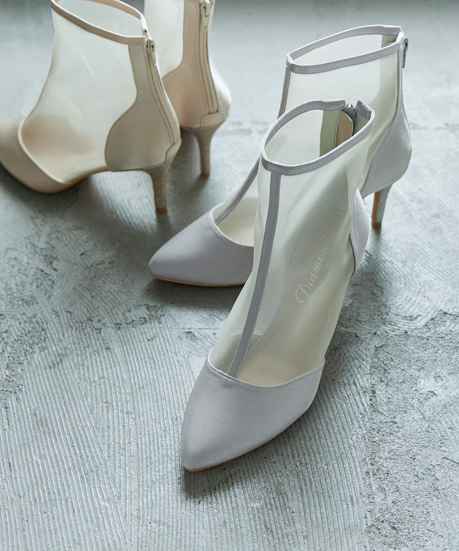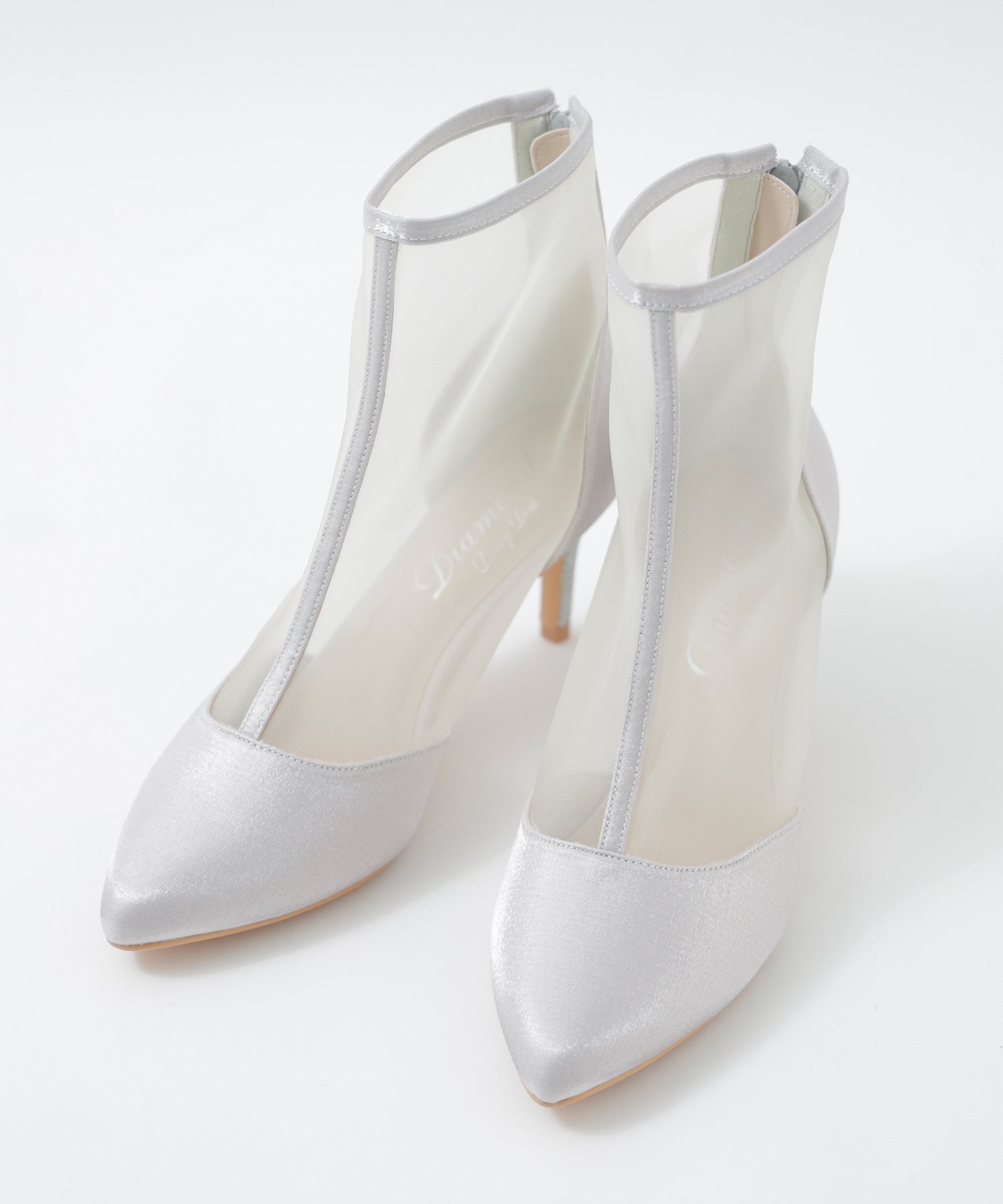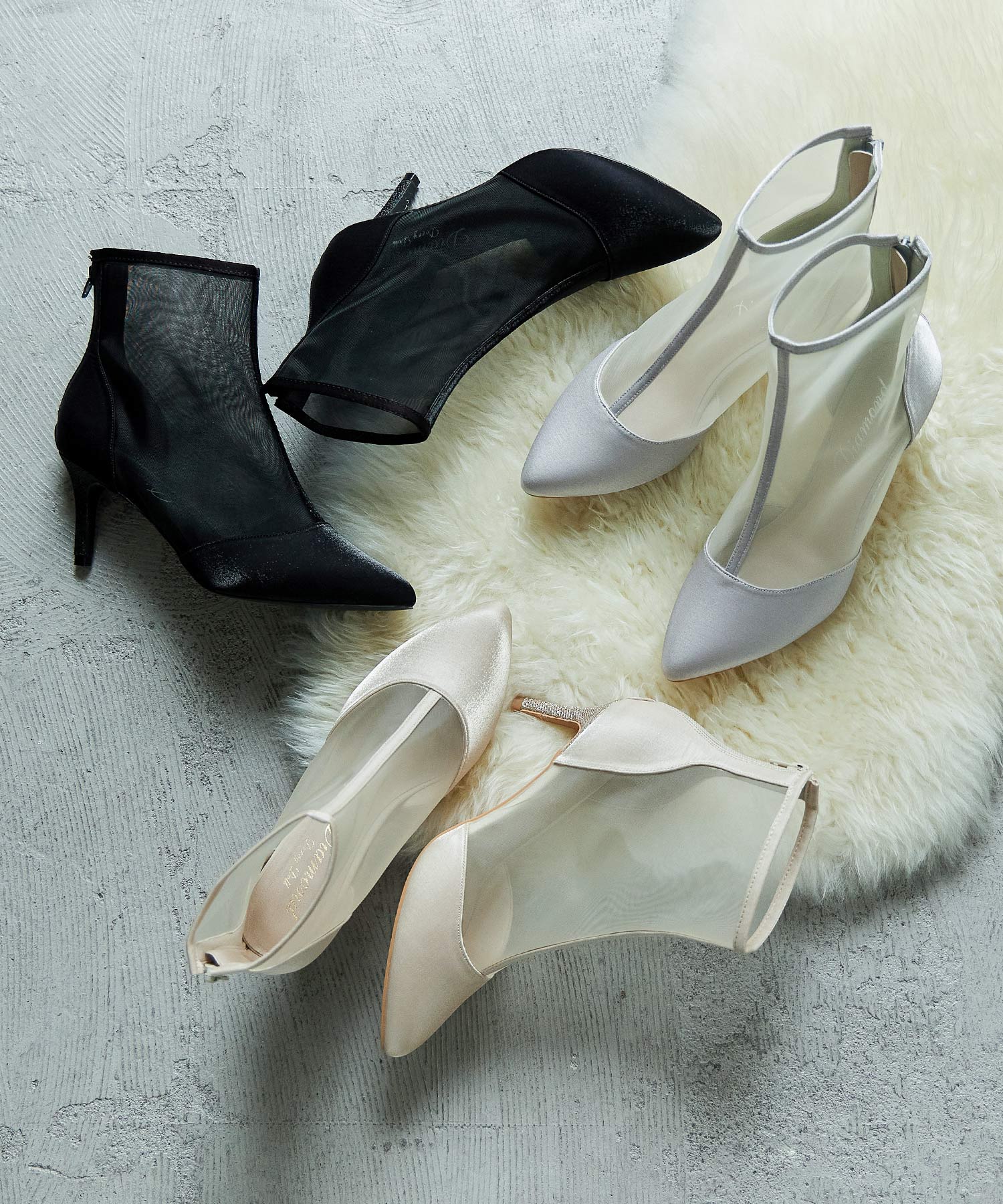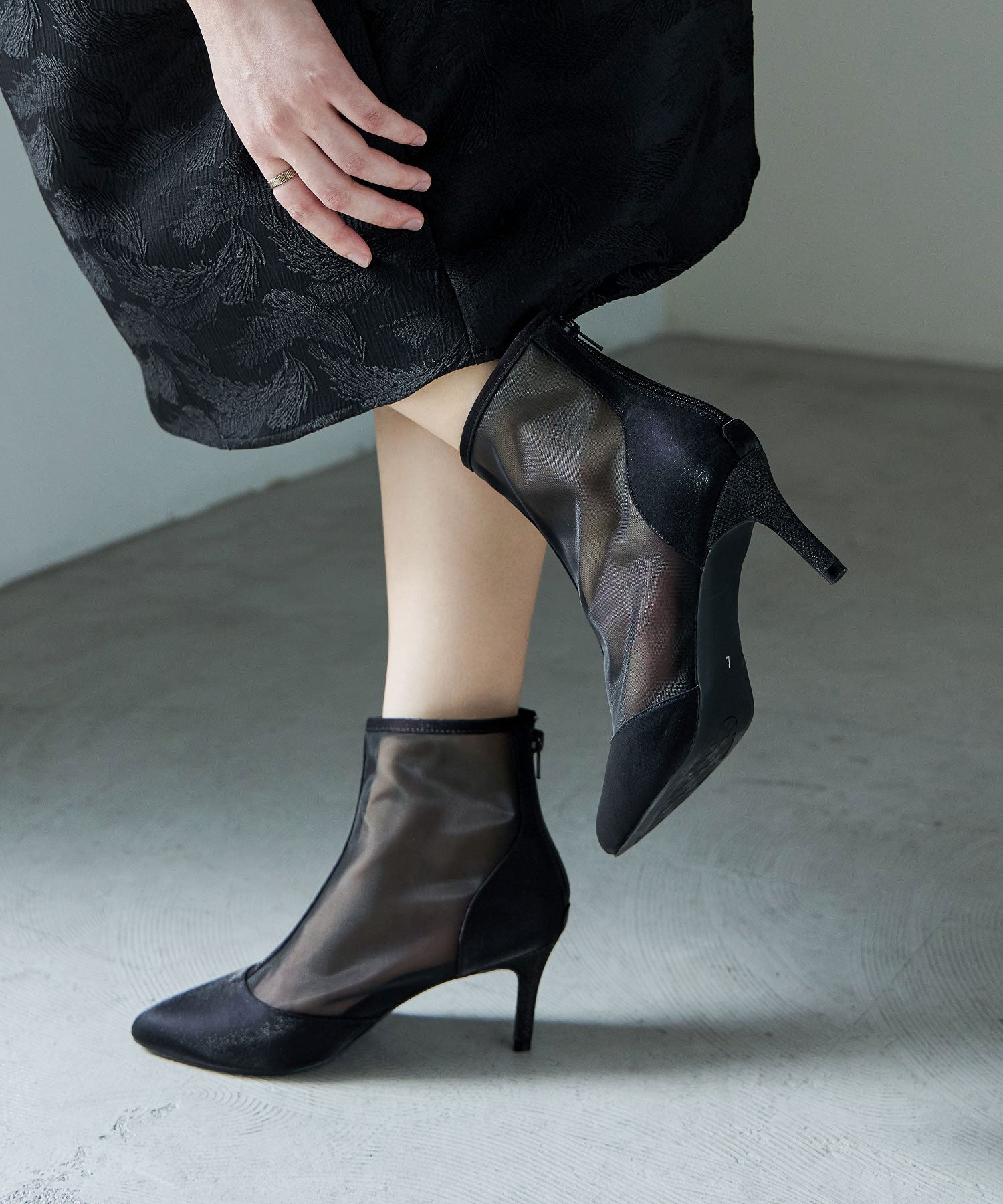 艶やかなサテンと透け感が美しいメッシュを組み合わせたショートブーツ。