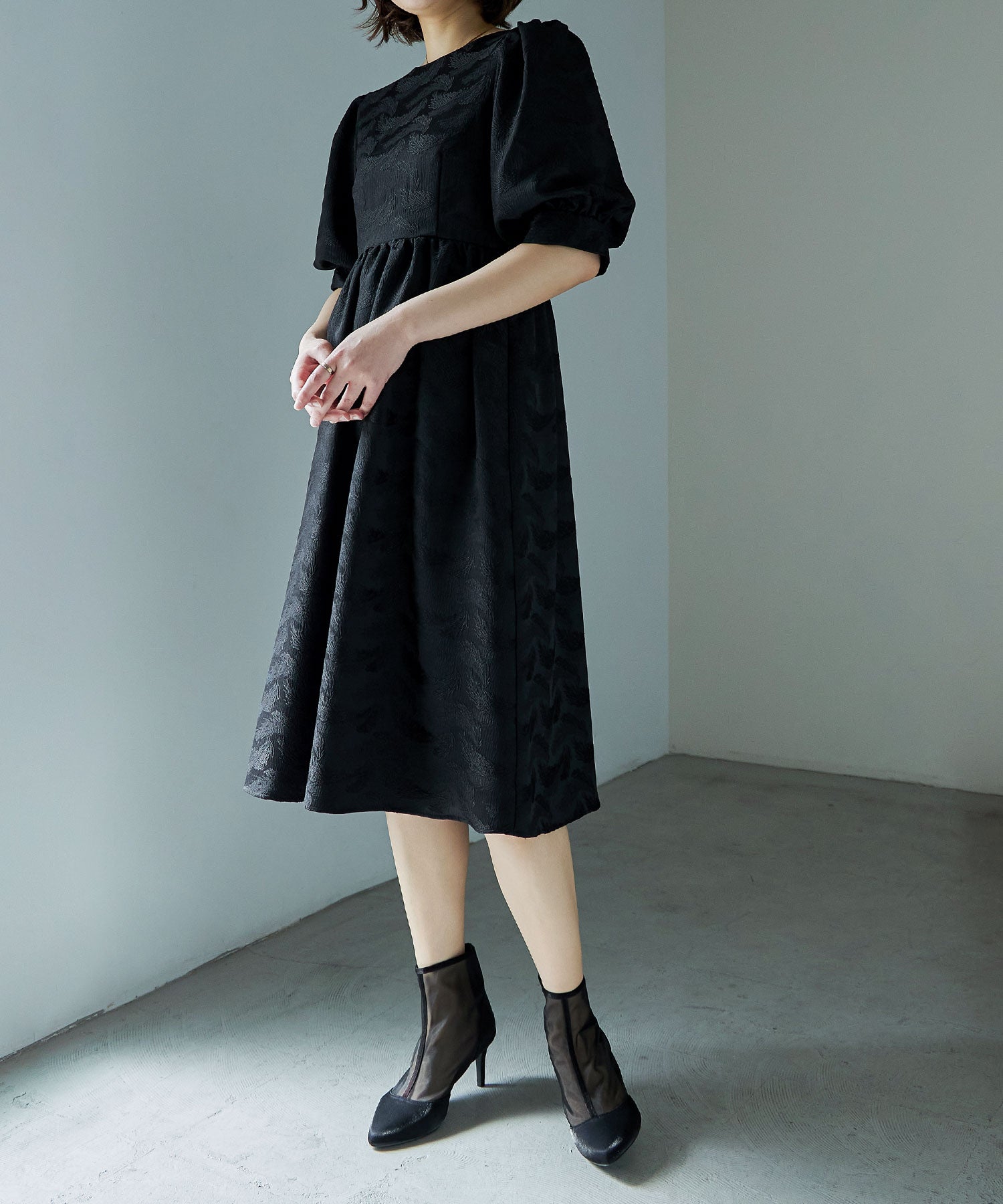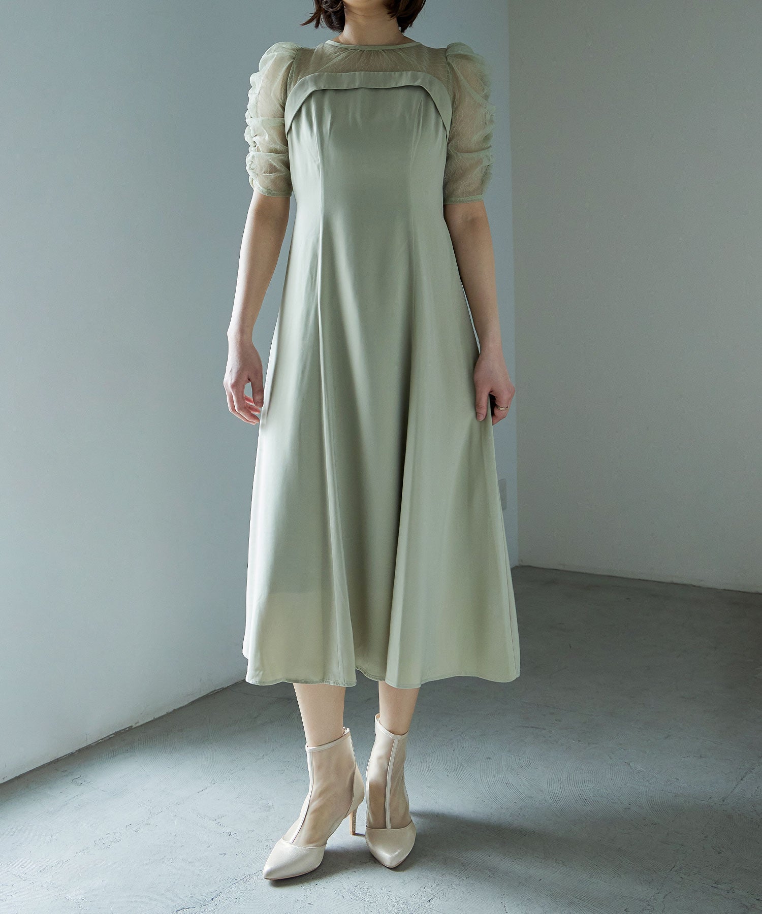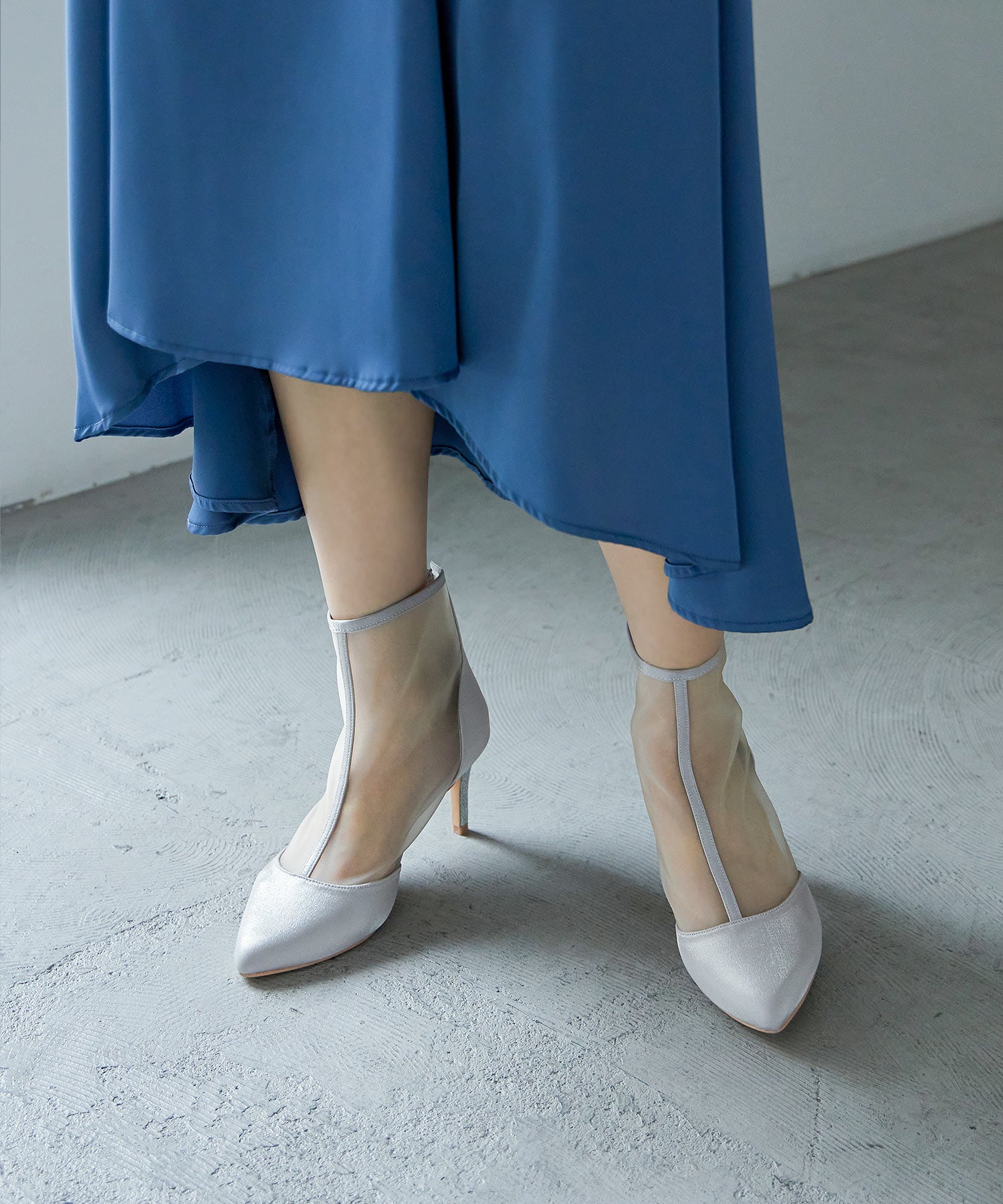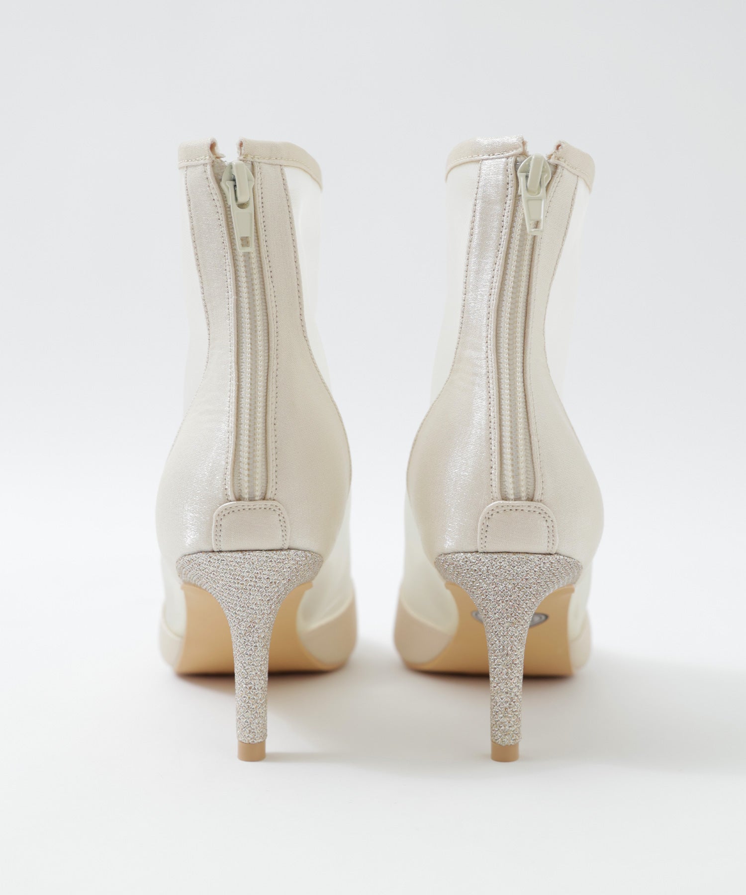 艶やかなサテンと透け感が美しいメッシュを組み合わせたショートブーツ。