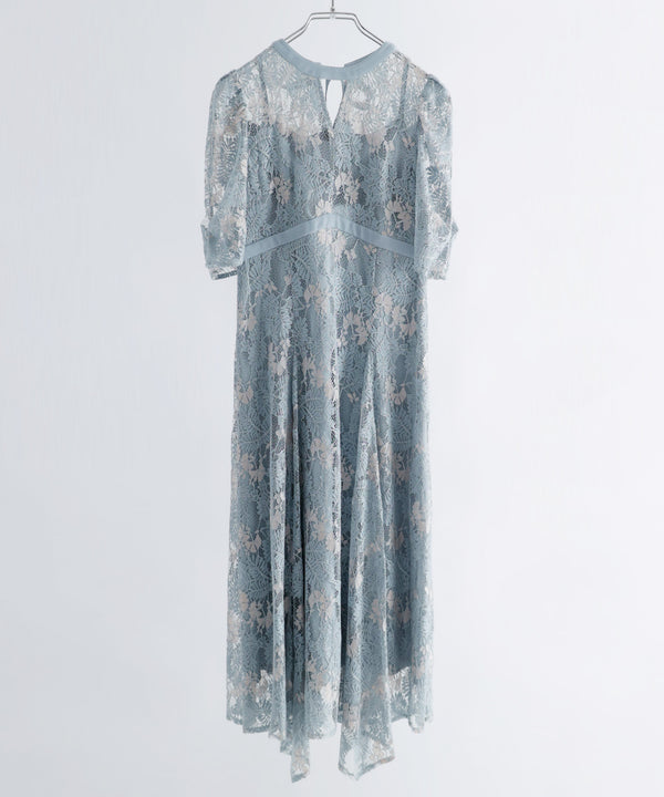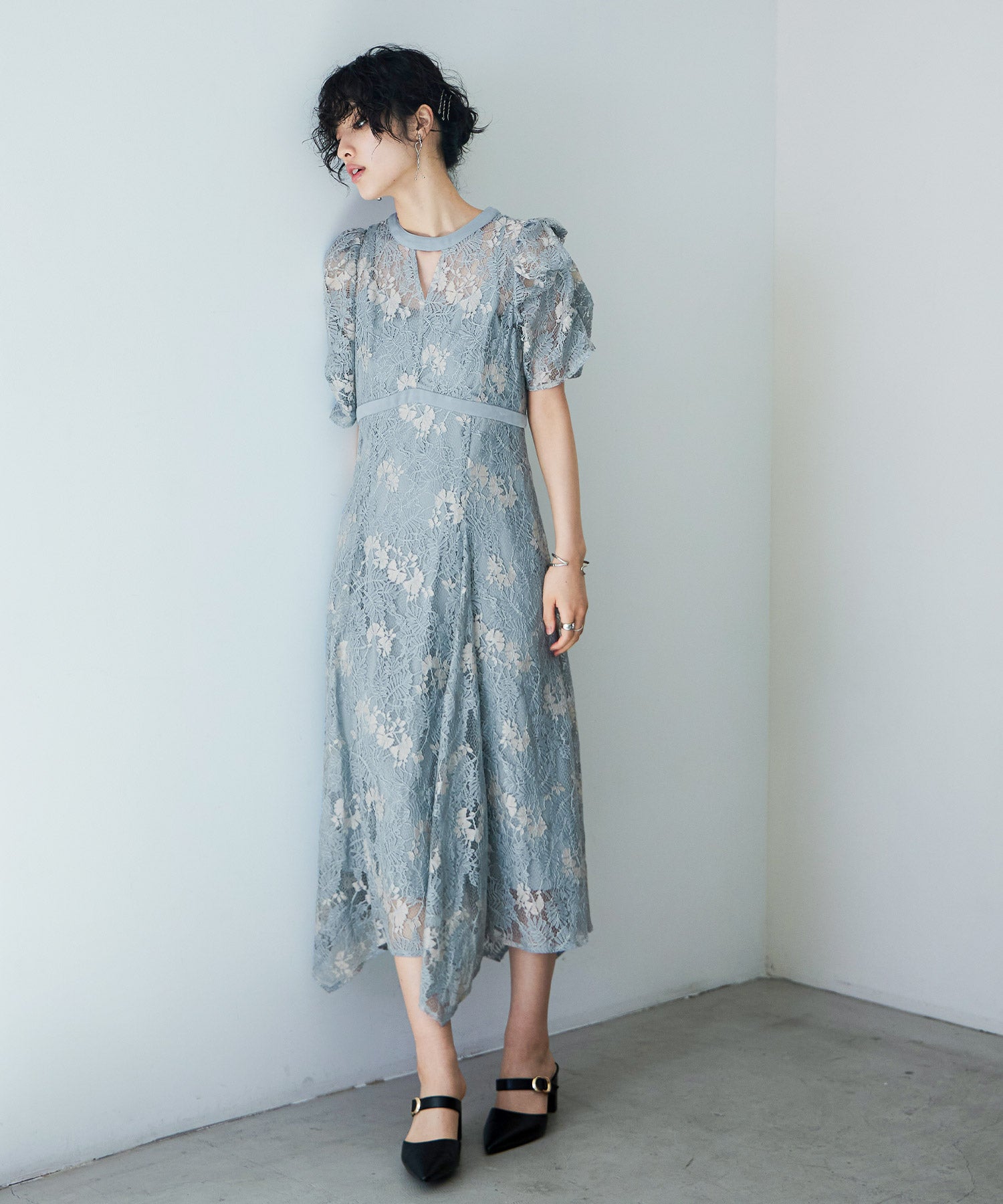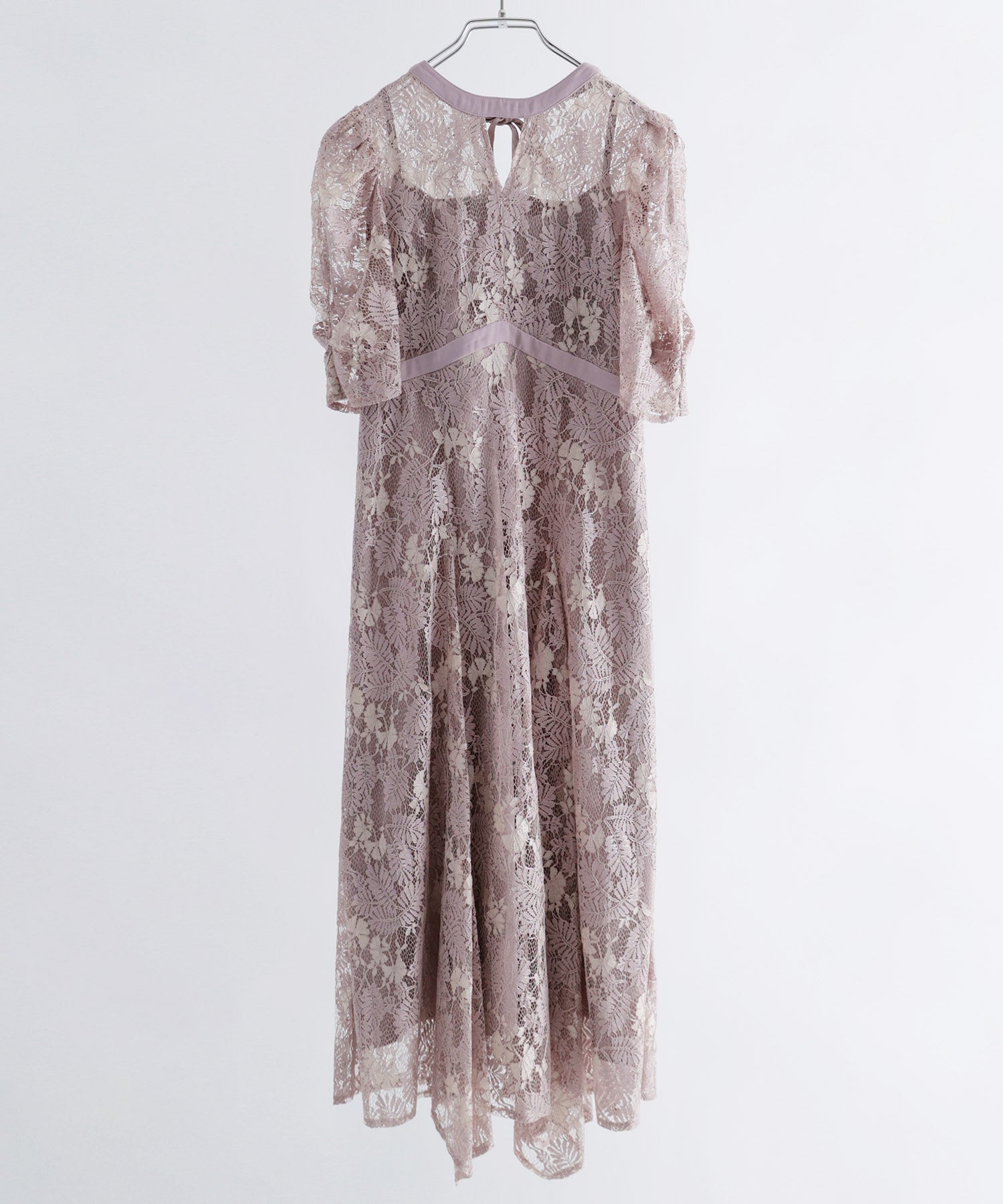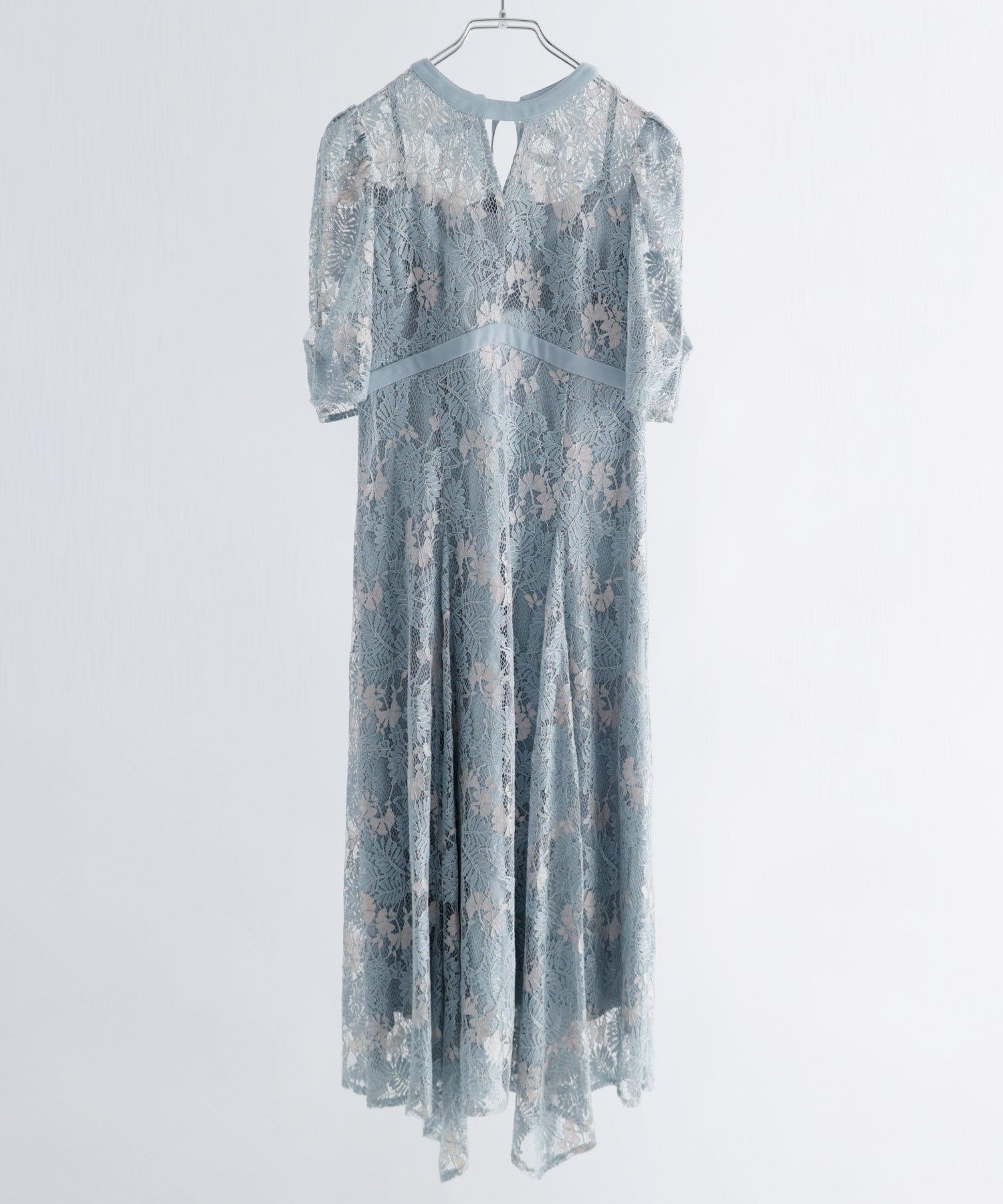 Rname 結婚式 ワンピース パーティードレス レース 総レース キーホールネック イレヘムスカート パワーショルダー ボリューム袖 フレア ロング丈 袖あり 半袖 ロングドレス パーティー オケージョン 1.5次会 春夏 二次会 謝恩会 成人式 同窓会 女子会 お呼ばれ 入学式 卒業式