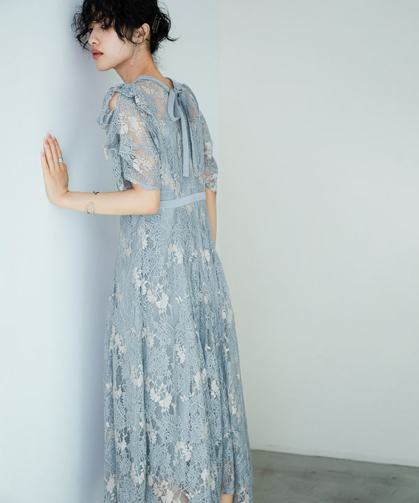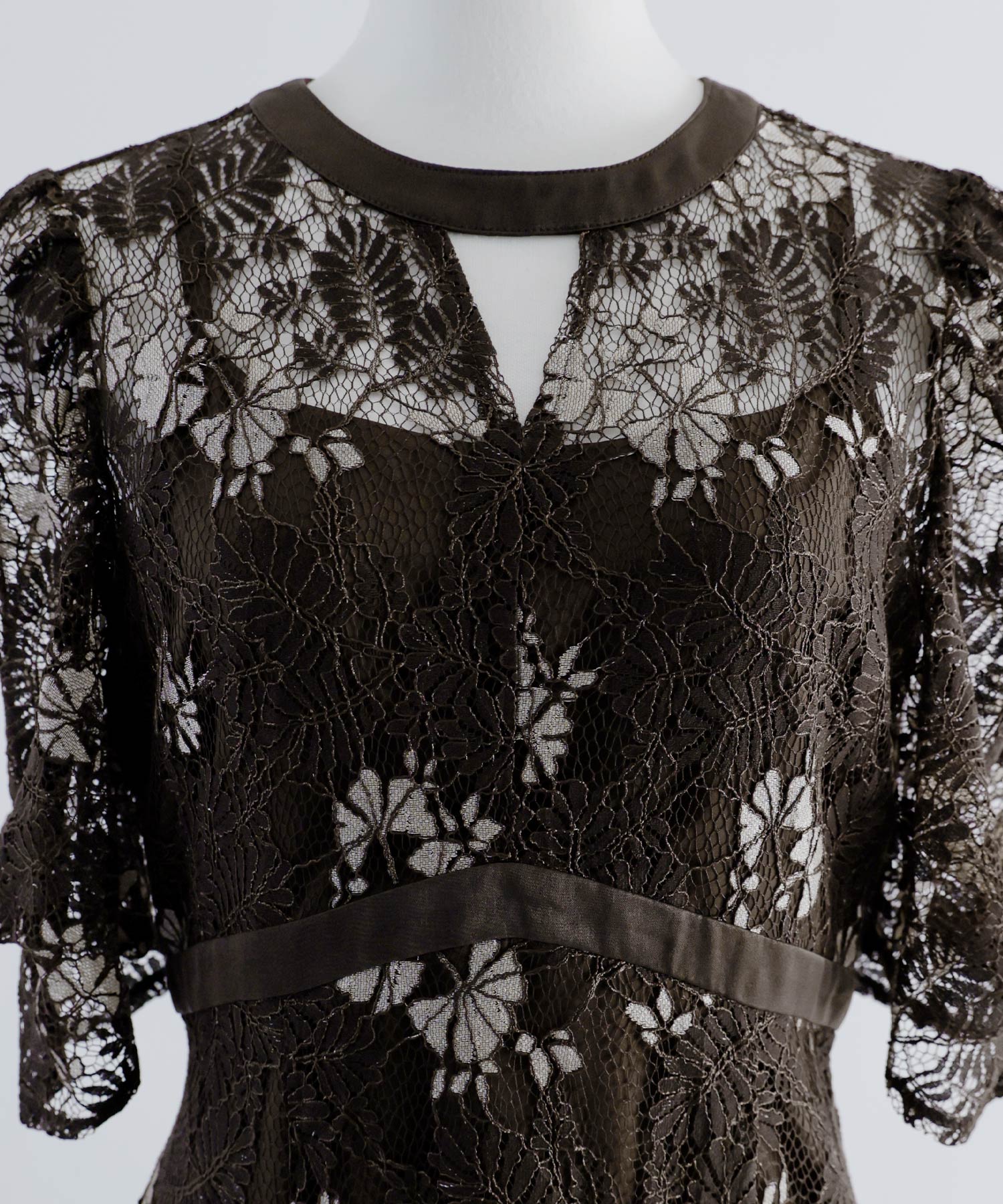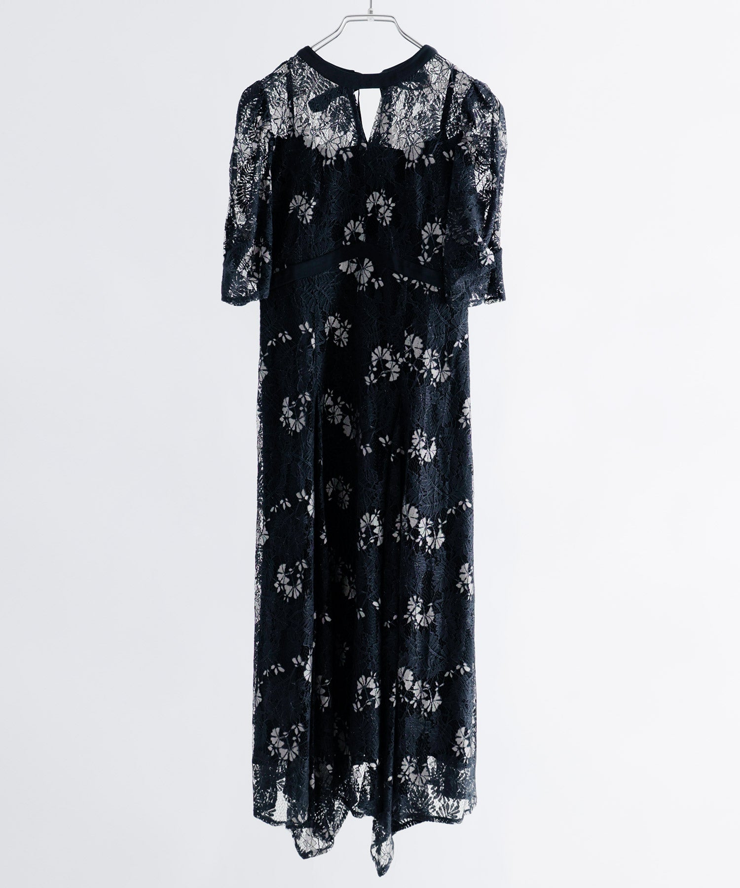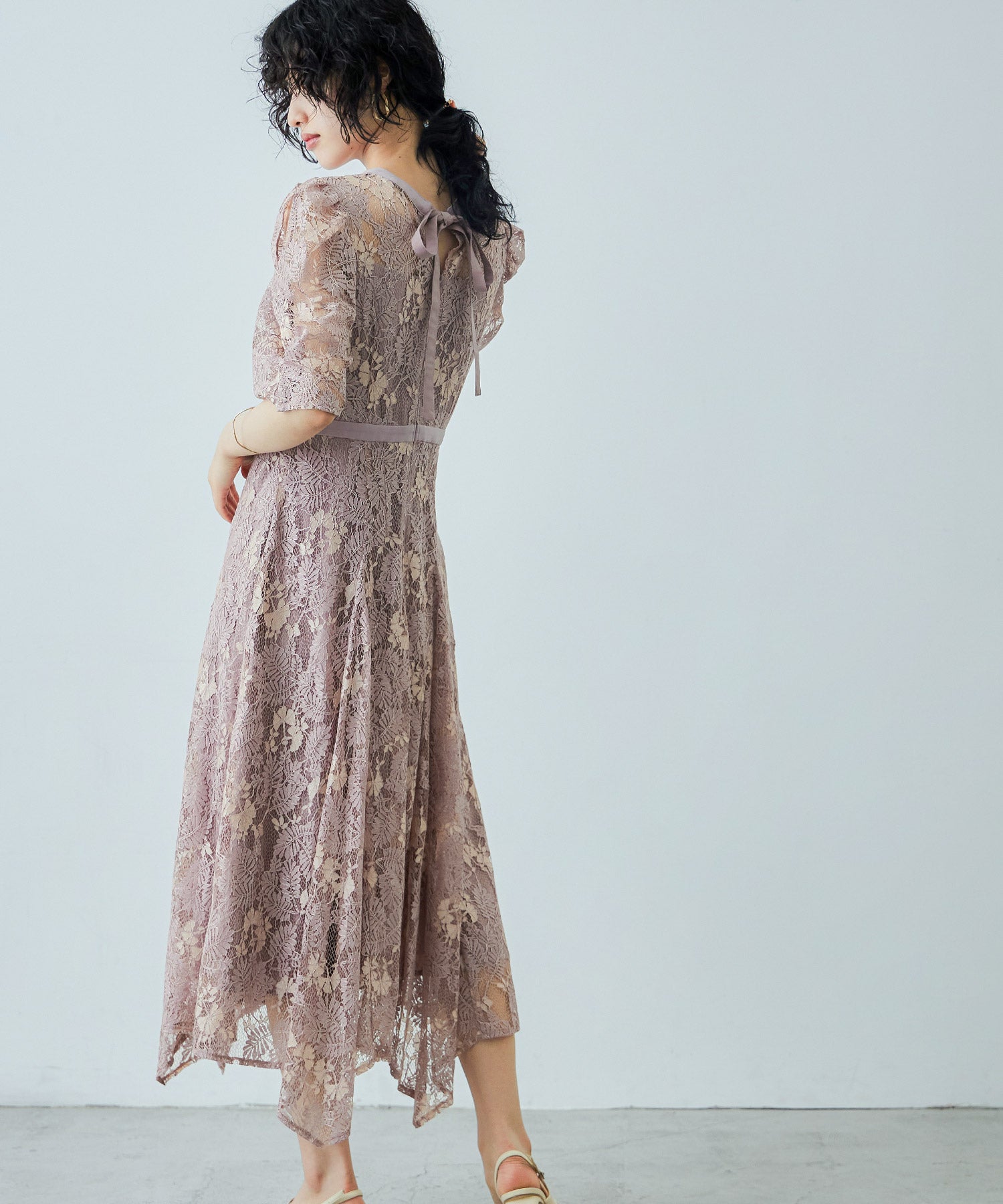 Rname 結婚式 ワンピース パーティードレス レース 総レース キーホールネック イレヘムスカート パワーショルダー ボリューム袖 フレア ロング丈 袖あり 半袖 ロングドレス パーティー オケージョン 1.5次会 春夏 二次会 謝恩会 成人式 同窓会 女子会 お呼ばれ 入学式 卒業式