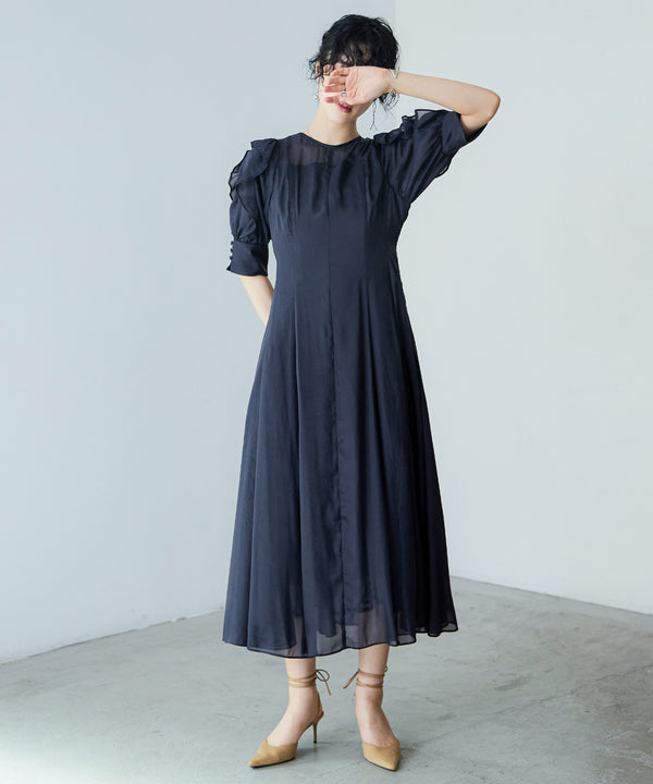 くるみボタンを飾り付けたボリューム感あるフリル袖が目を惹きます。