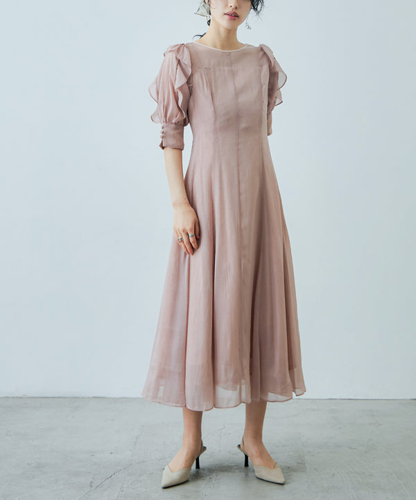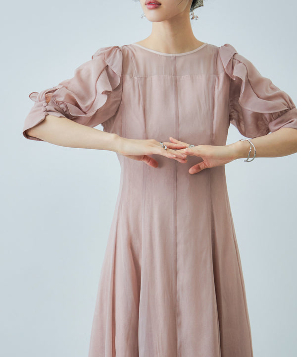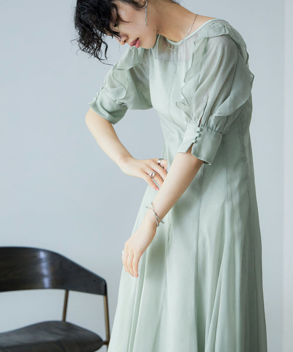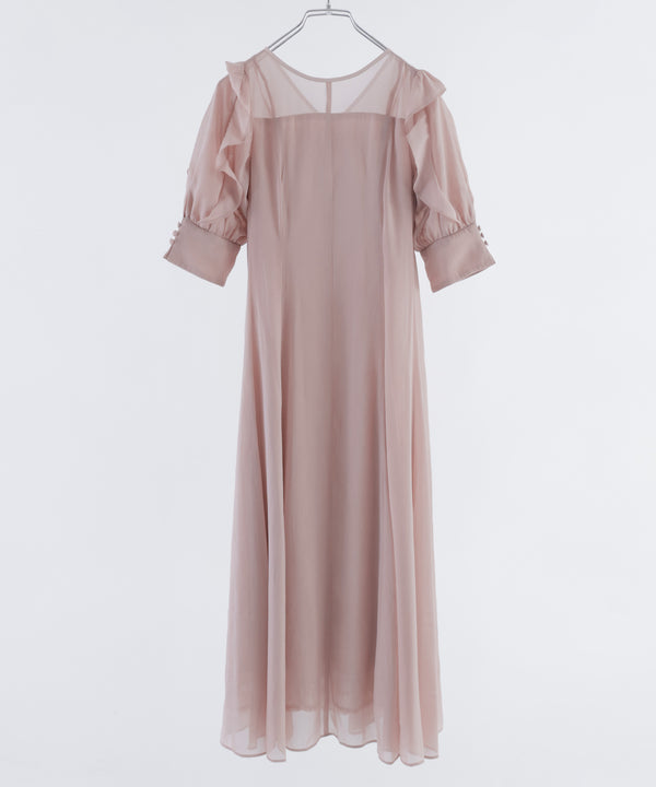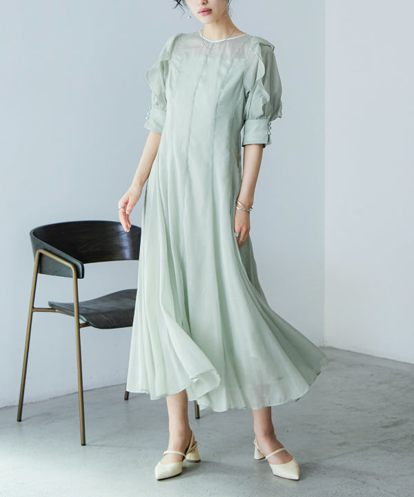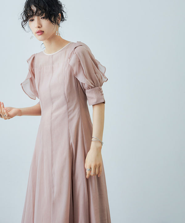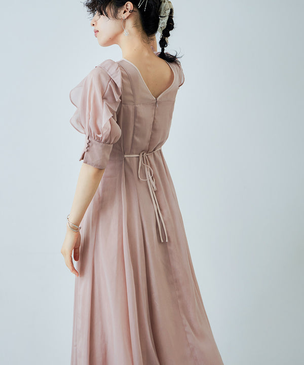 Rname 結婚式 ワンピース パーティードレス レース シフォン レイヤード フリル袖 ボリューム袖 フレア バックリボン ロング丈 袖あり 半袖 五分袖 シンプル ロングドレス オケージョン 1.5次会 春夏 秋冬 二次会 謝恩会 成人式 同窓会 女子会 お呼ばれ 二の腕カバー 入学式 卒業式