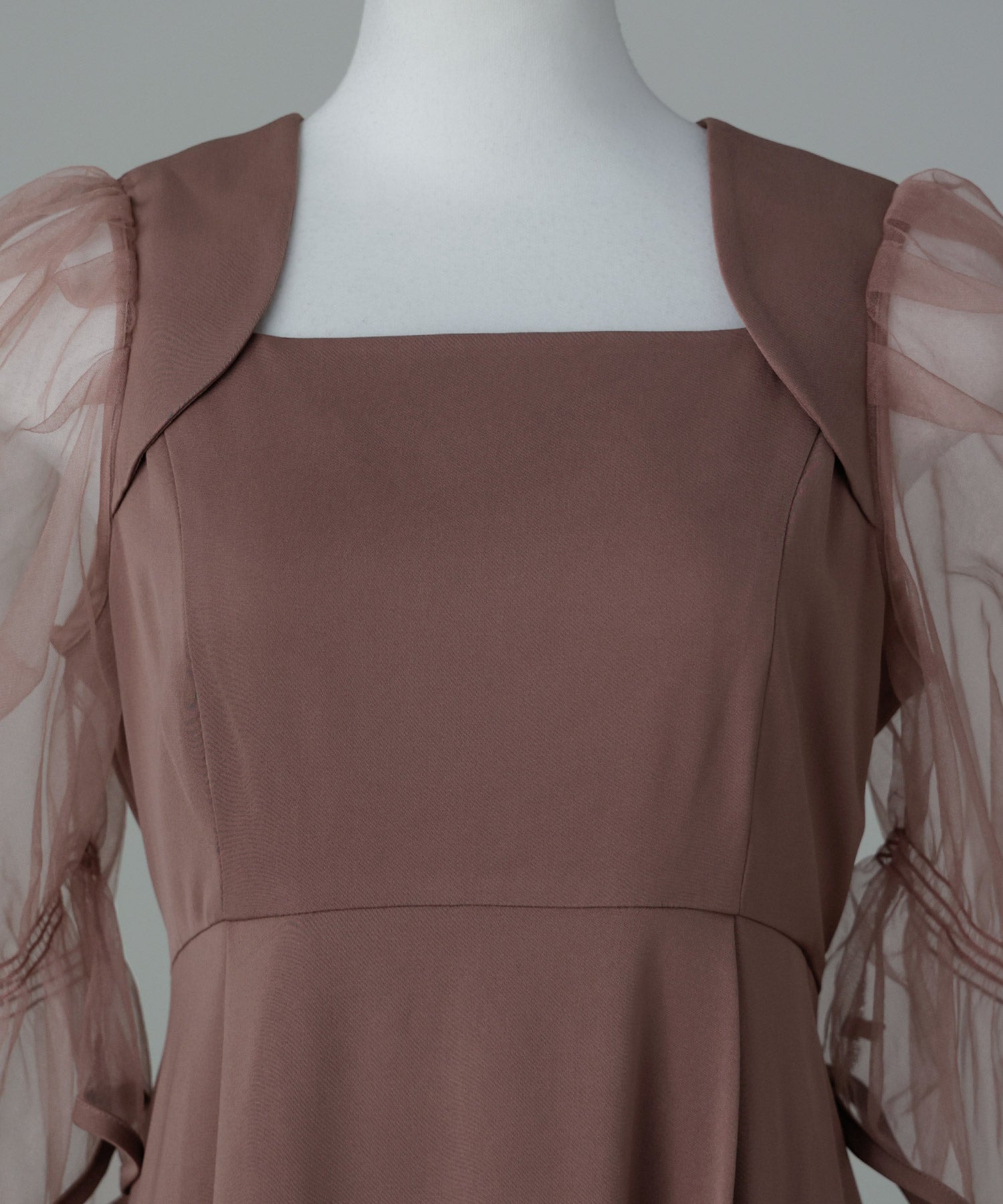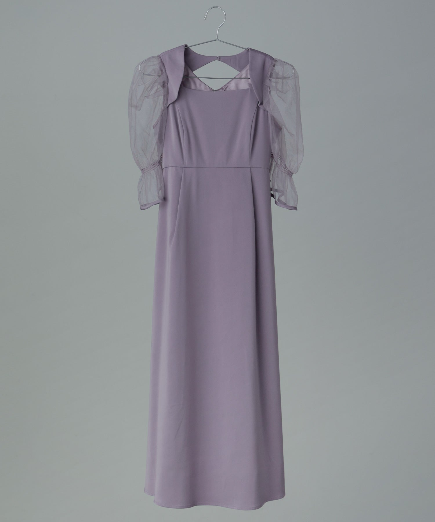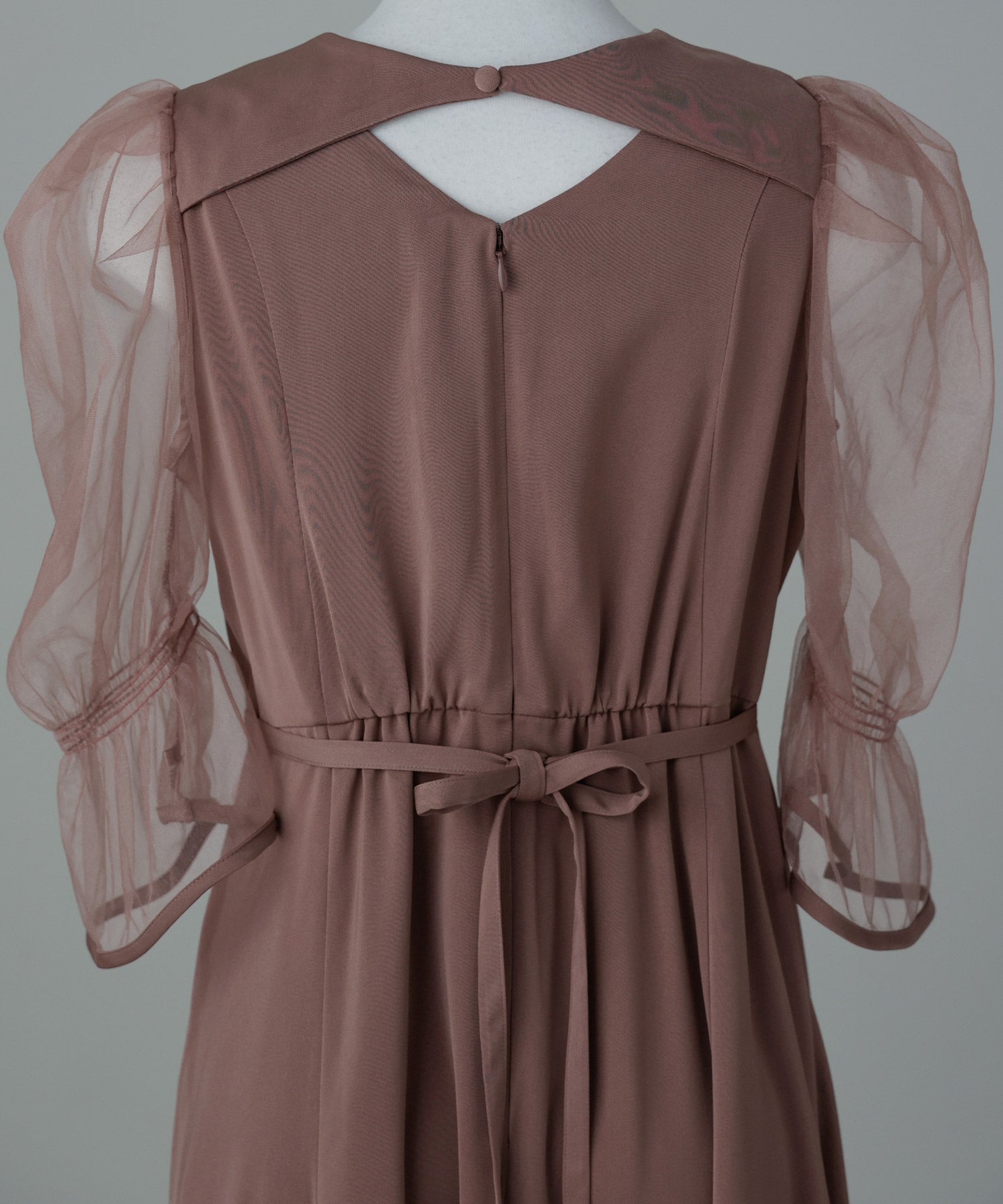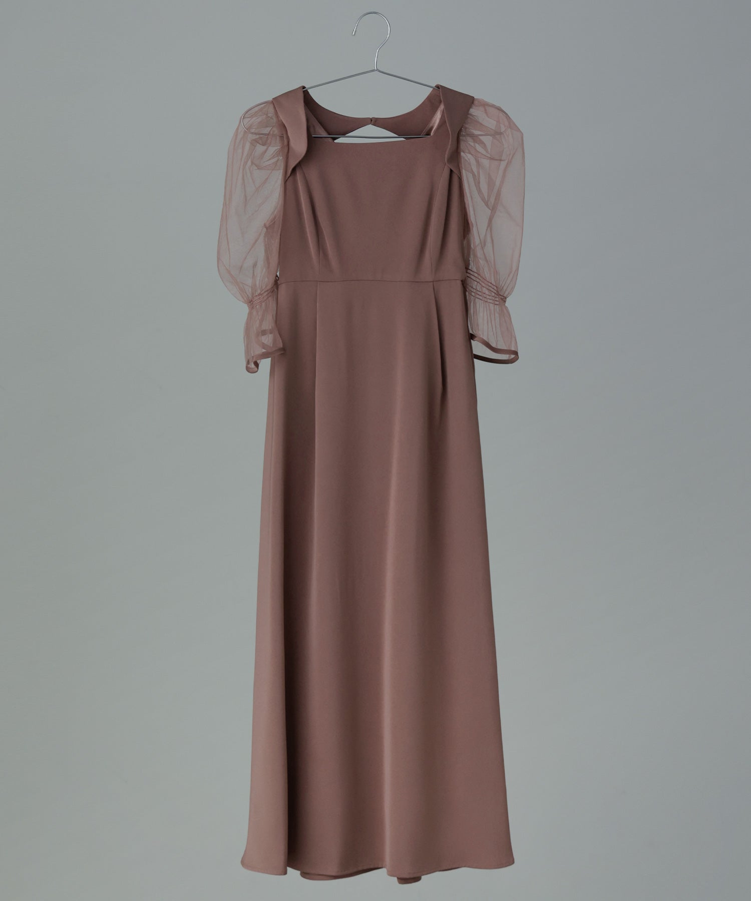 艶やかなサテン風生地にお袖はチュール生地を切り替えたドレス。