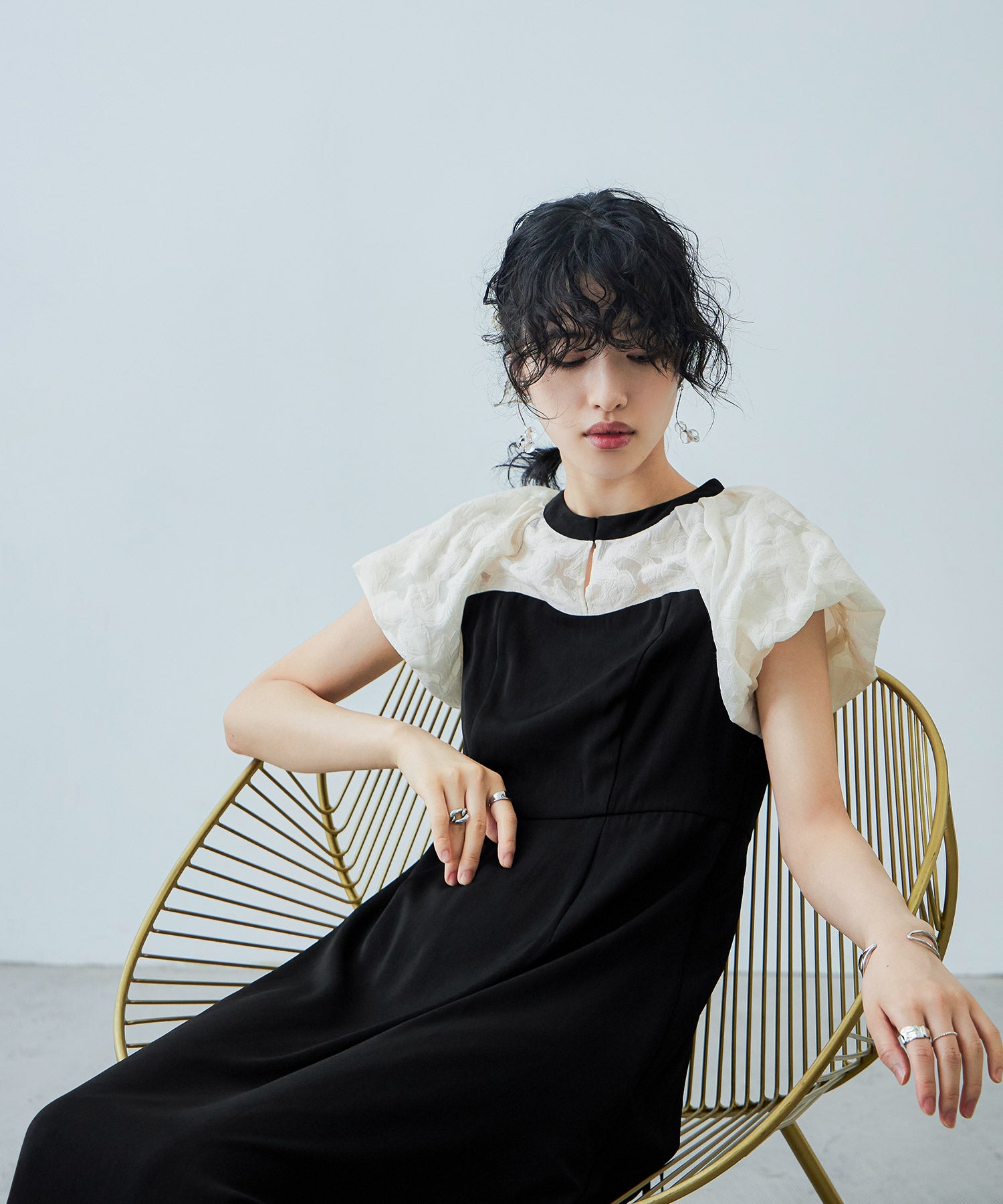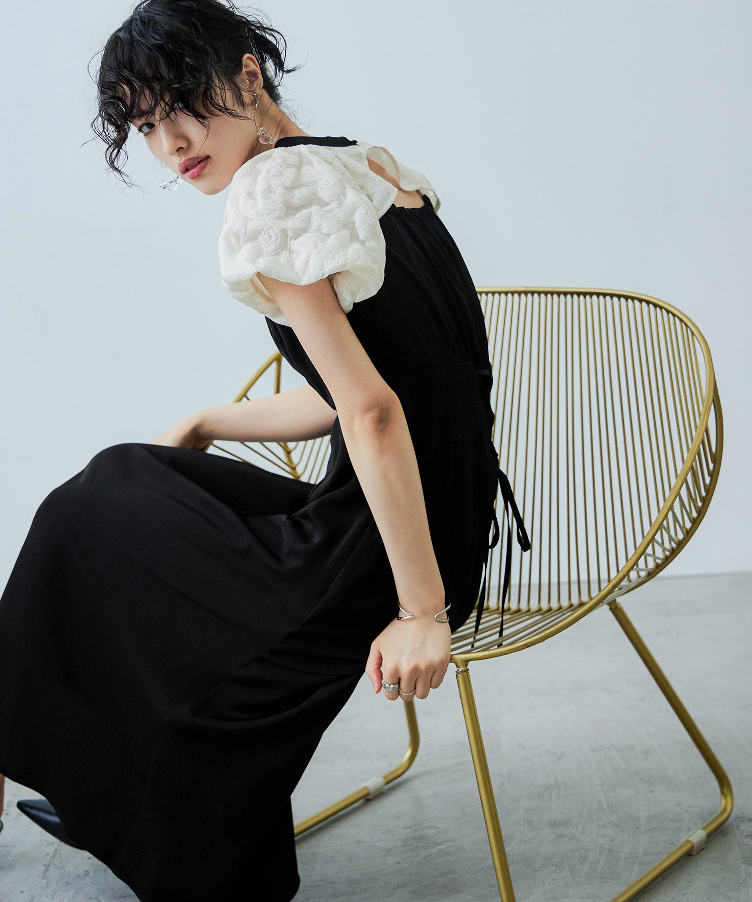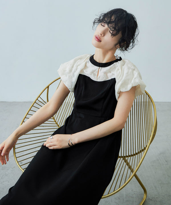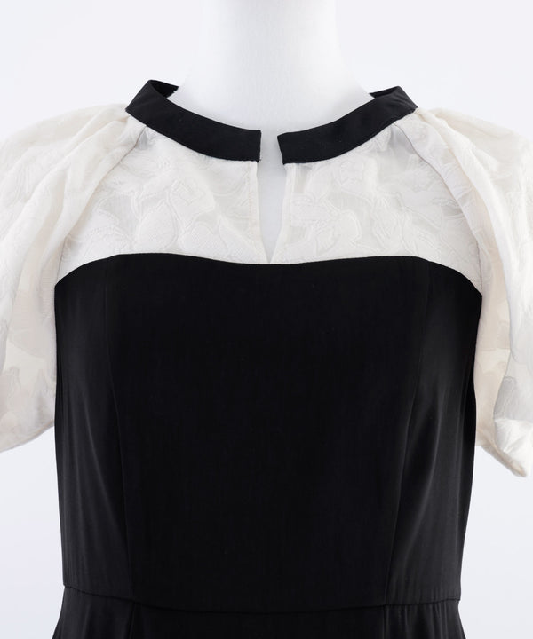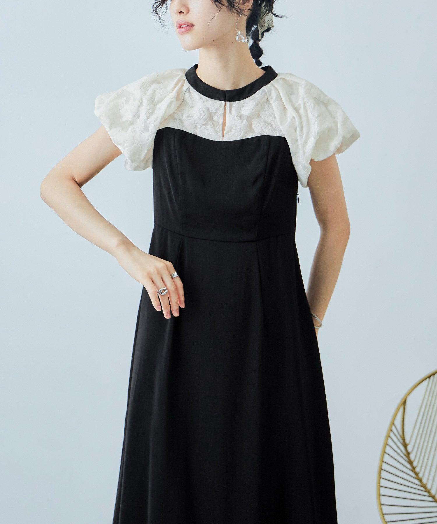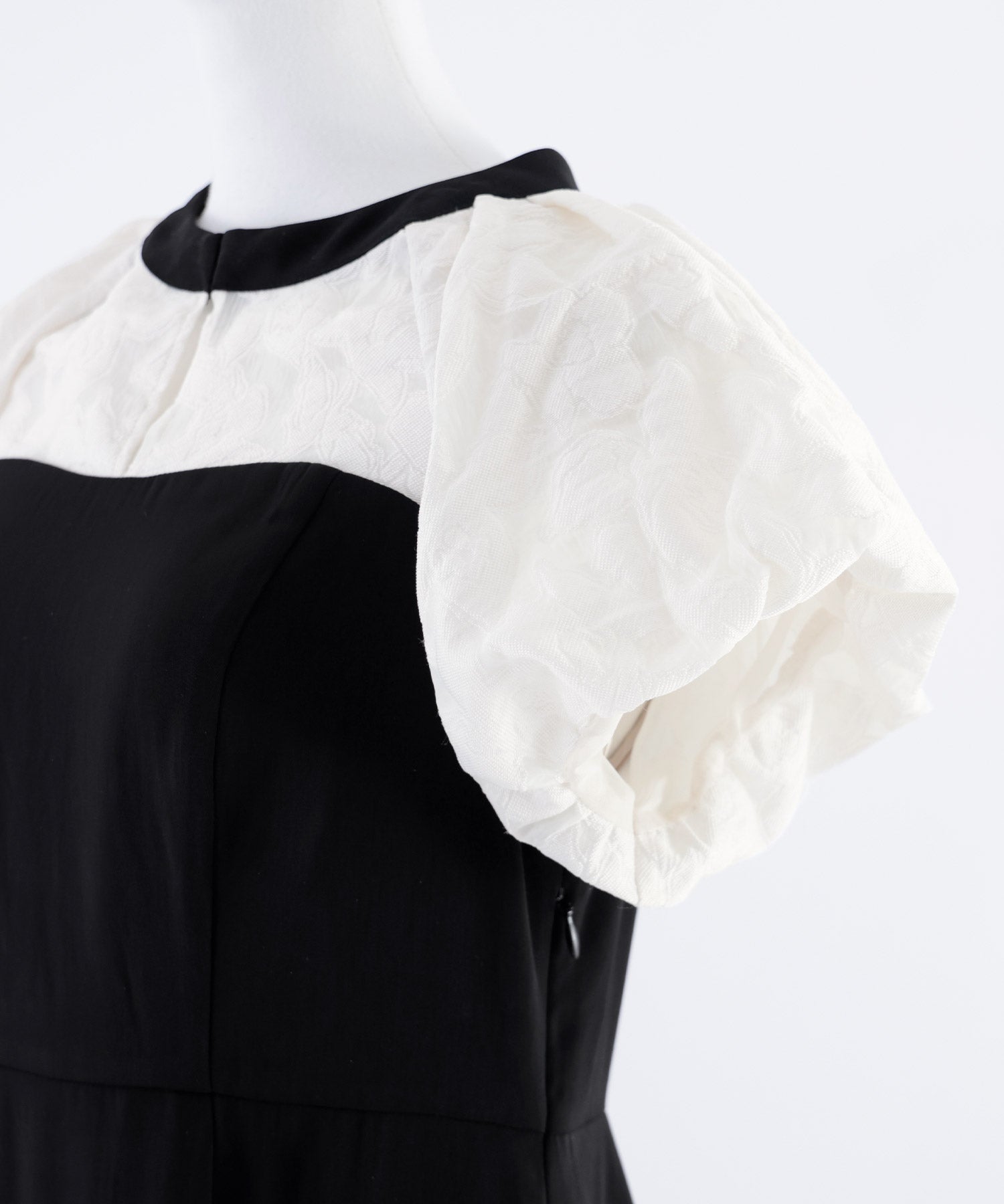 存在感ある花柄ジャガードのバルーンスリーブ切替ドレス。