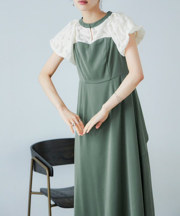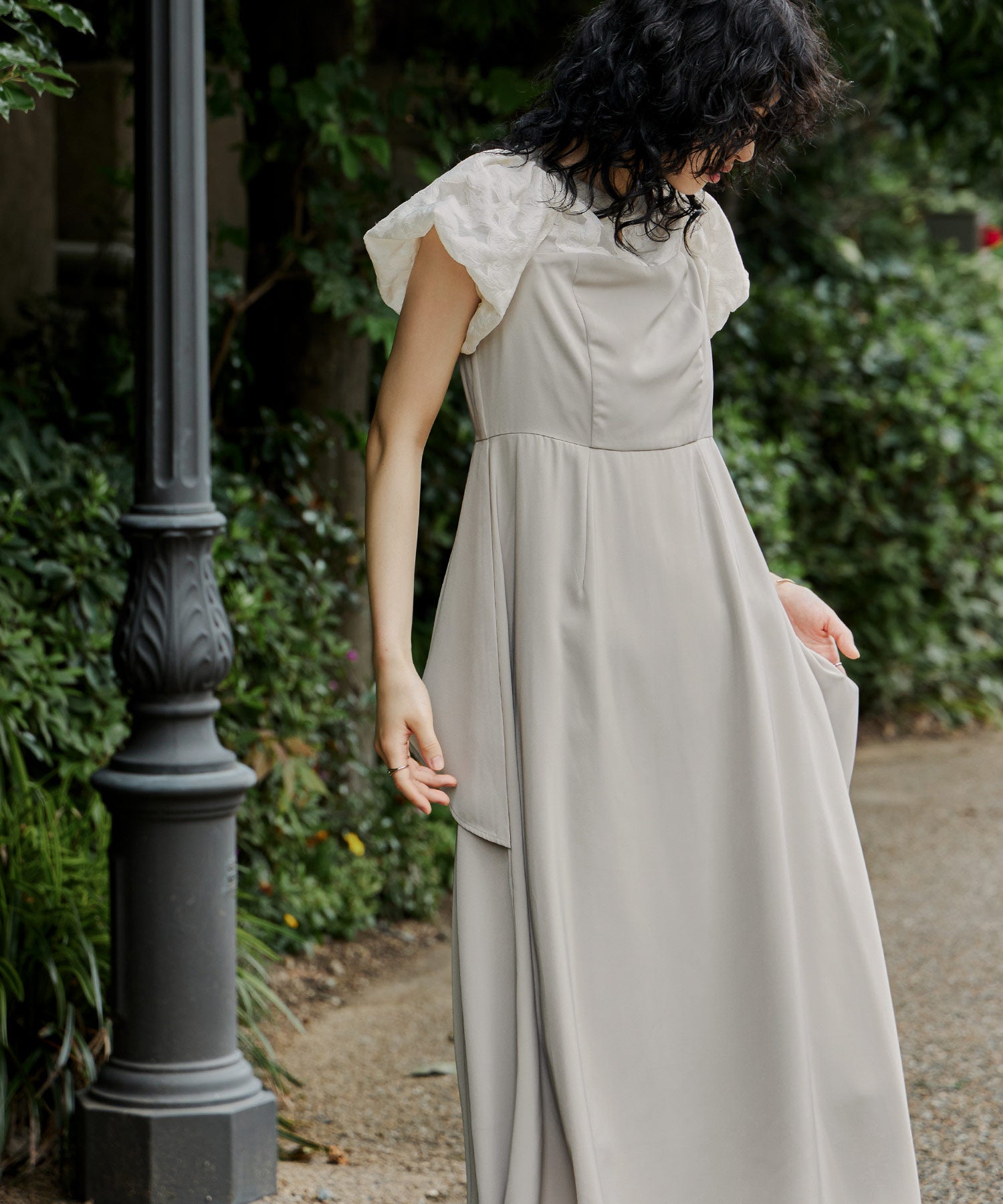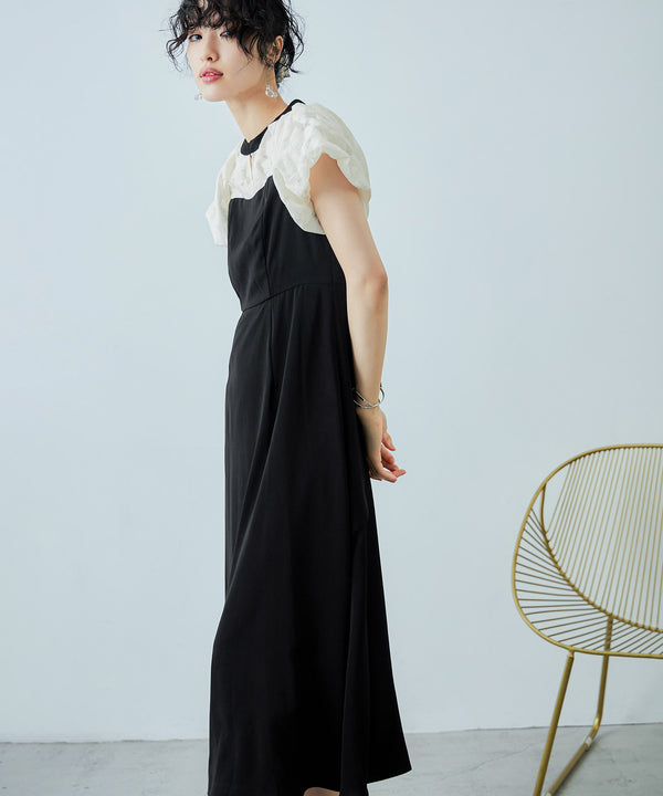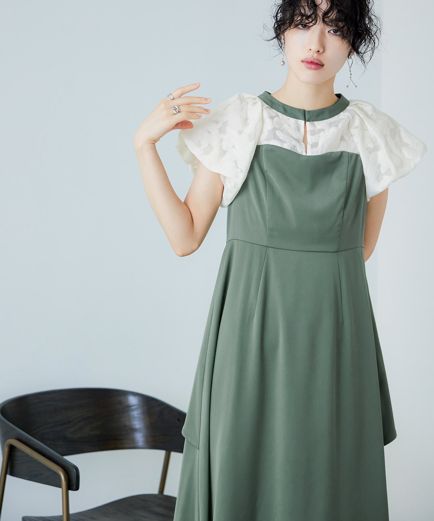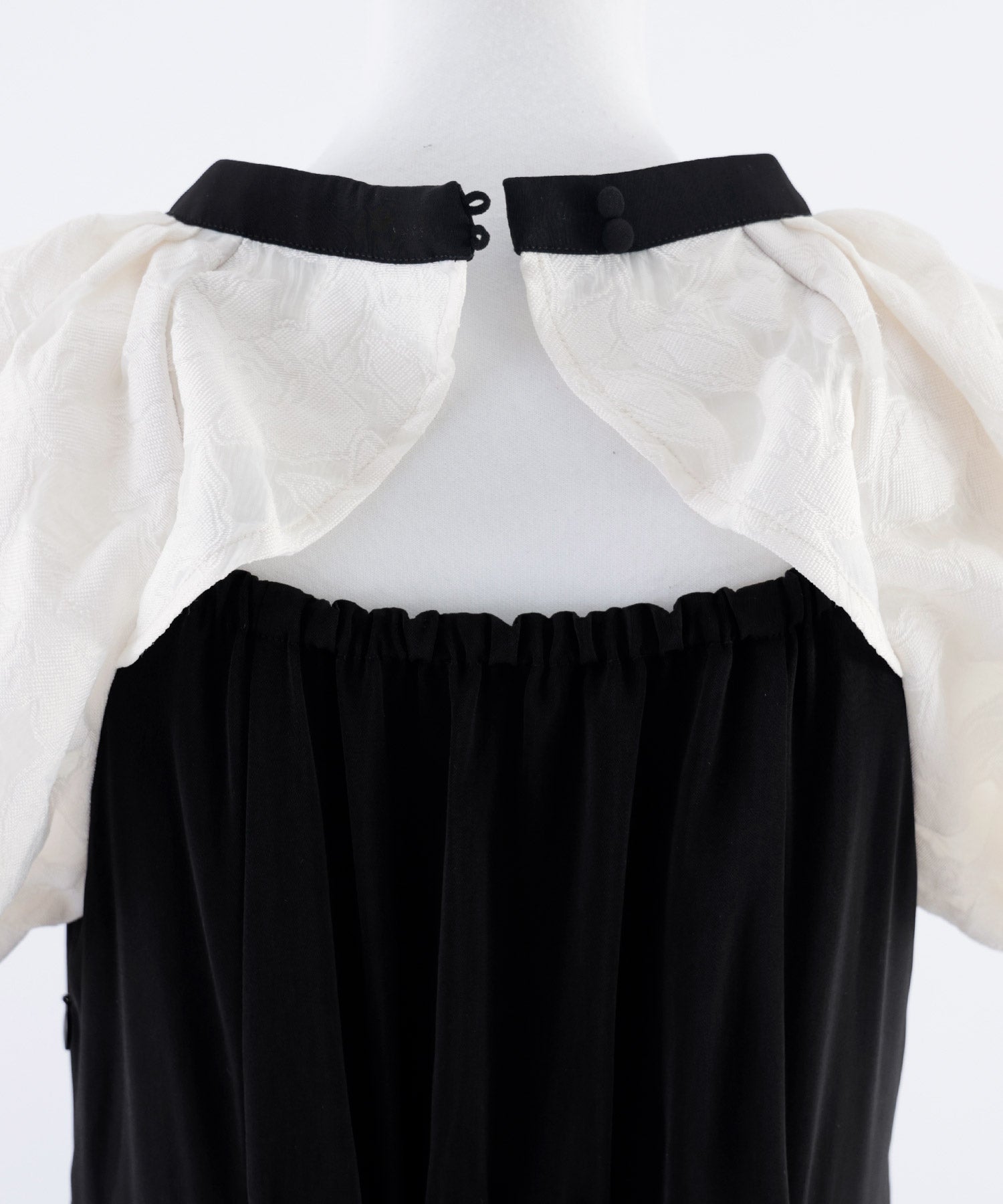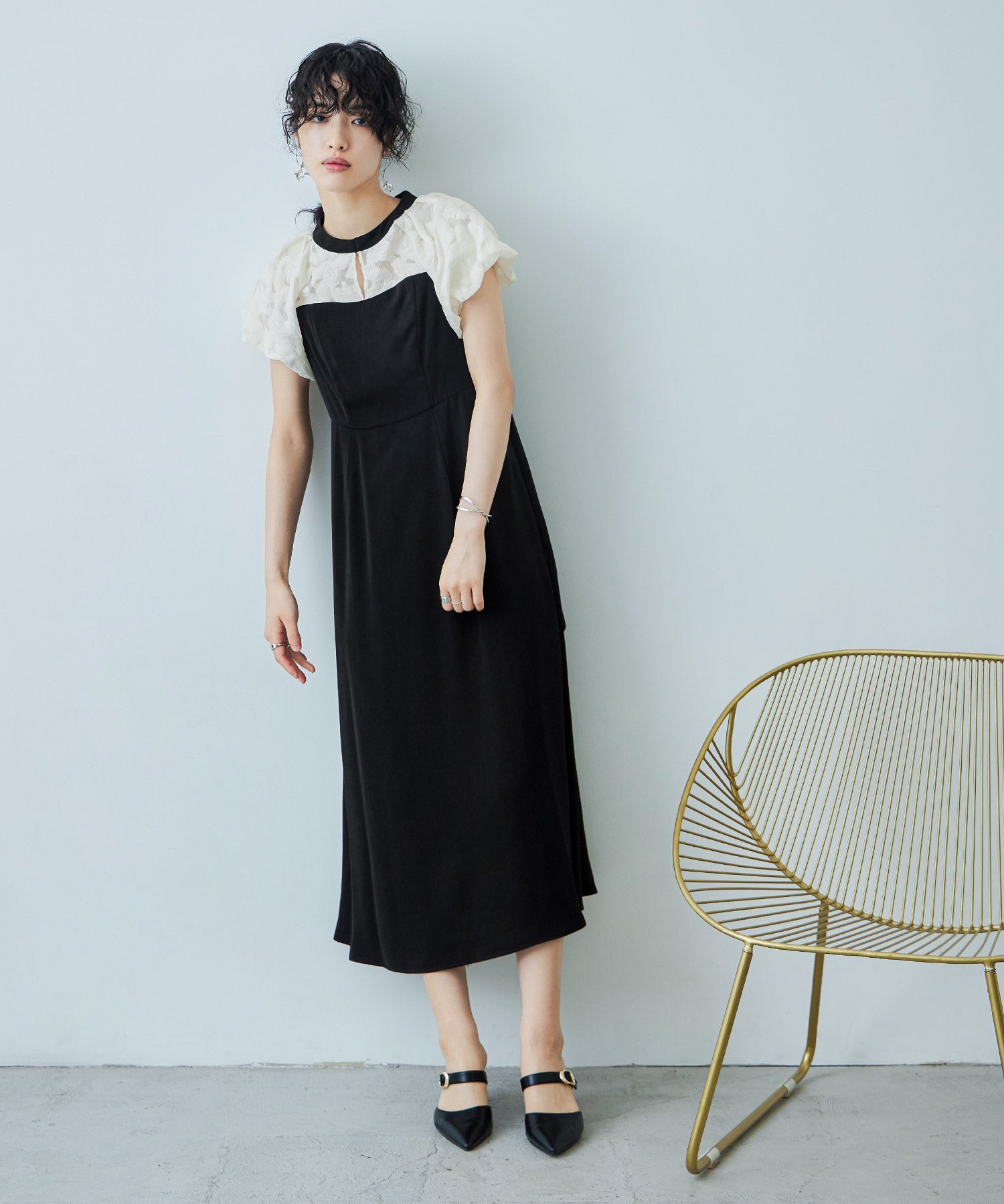 存在感ある花柄ジャガードのバルーンスリーブ切替ドレス。