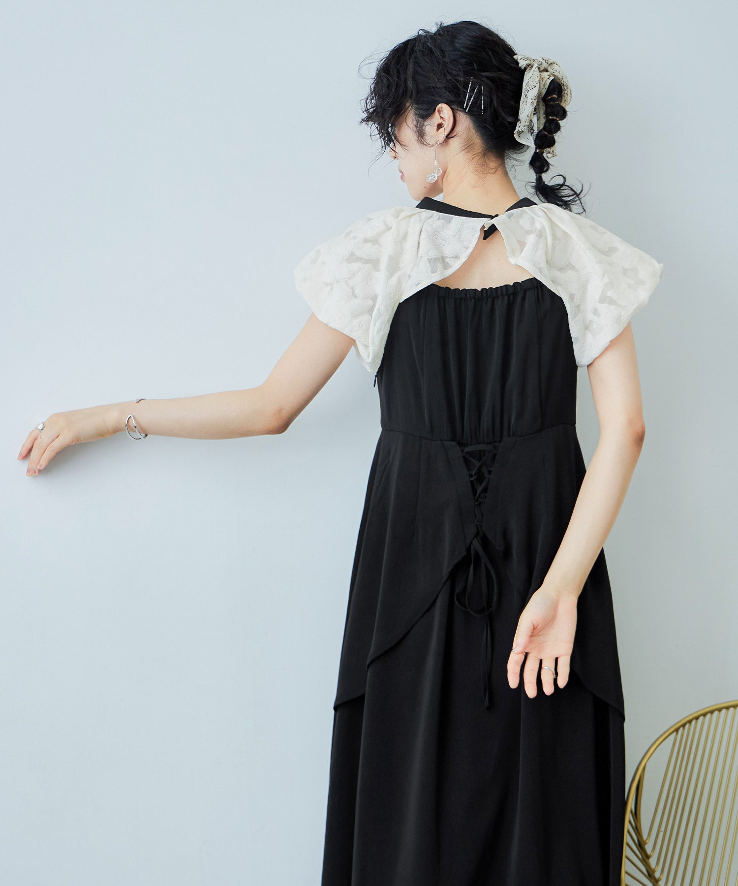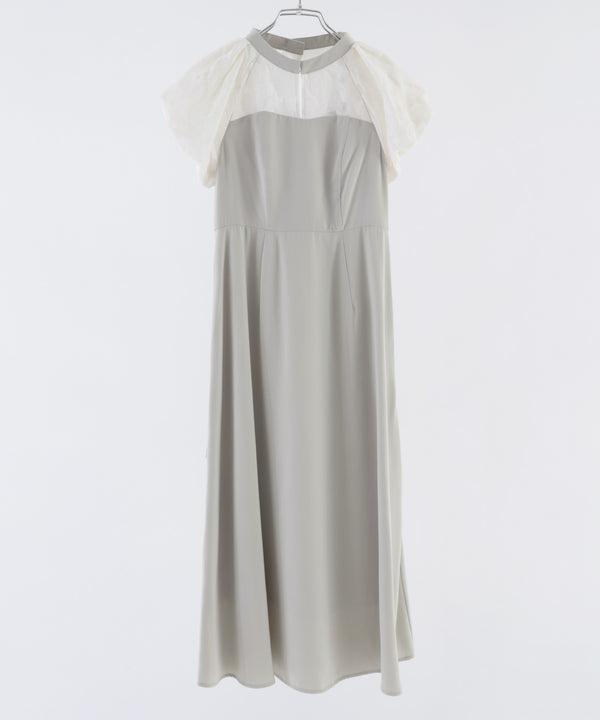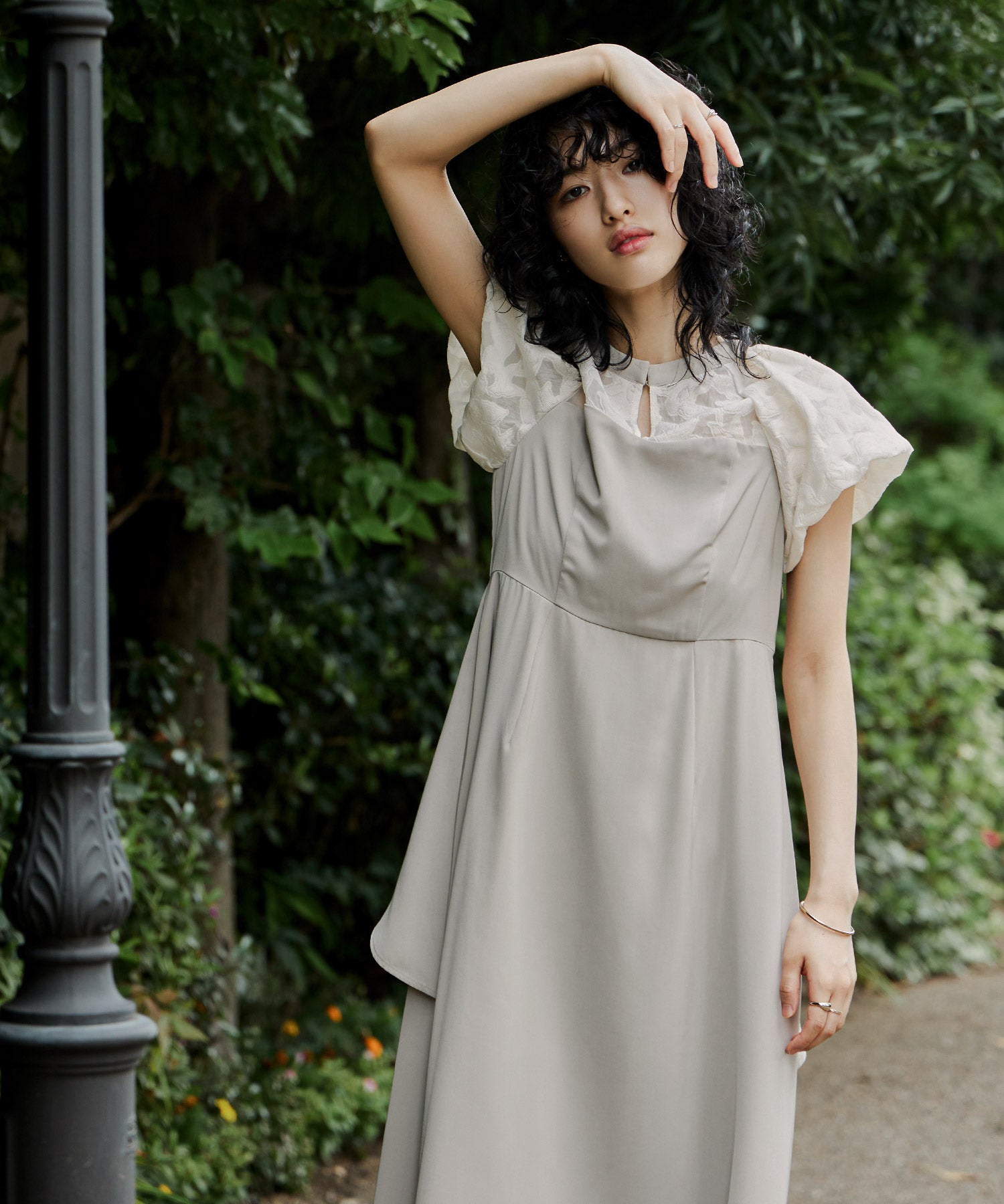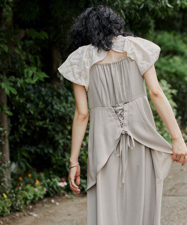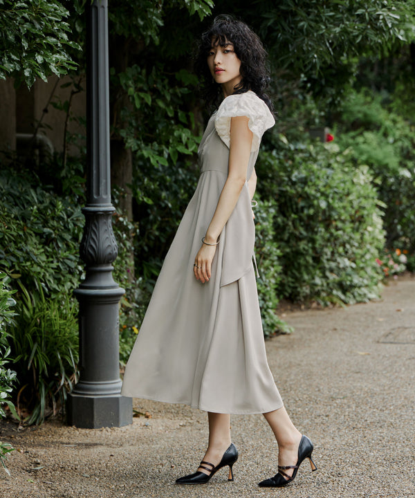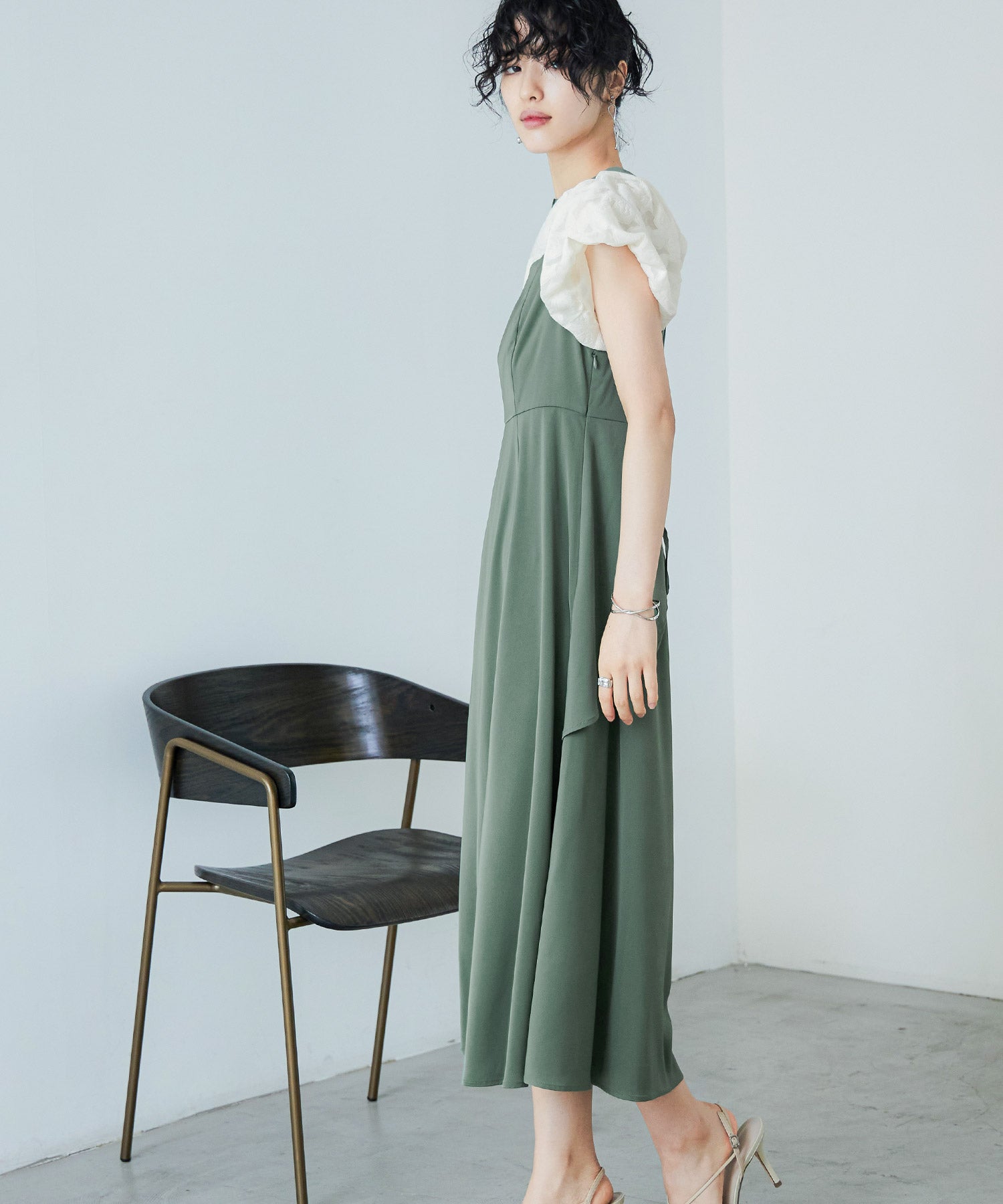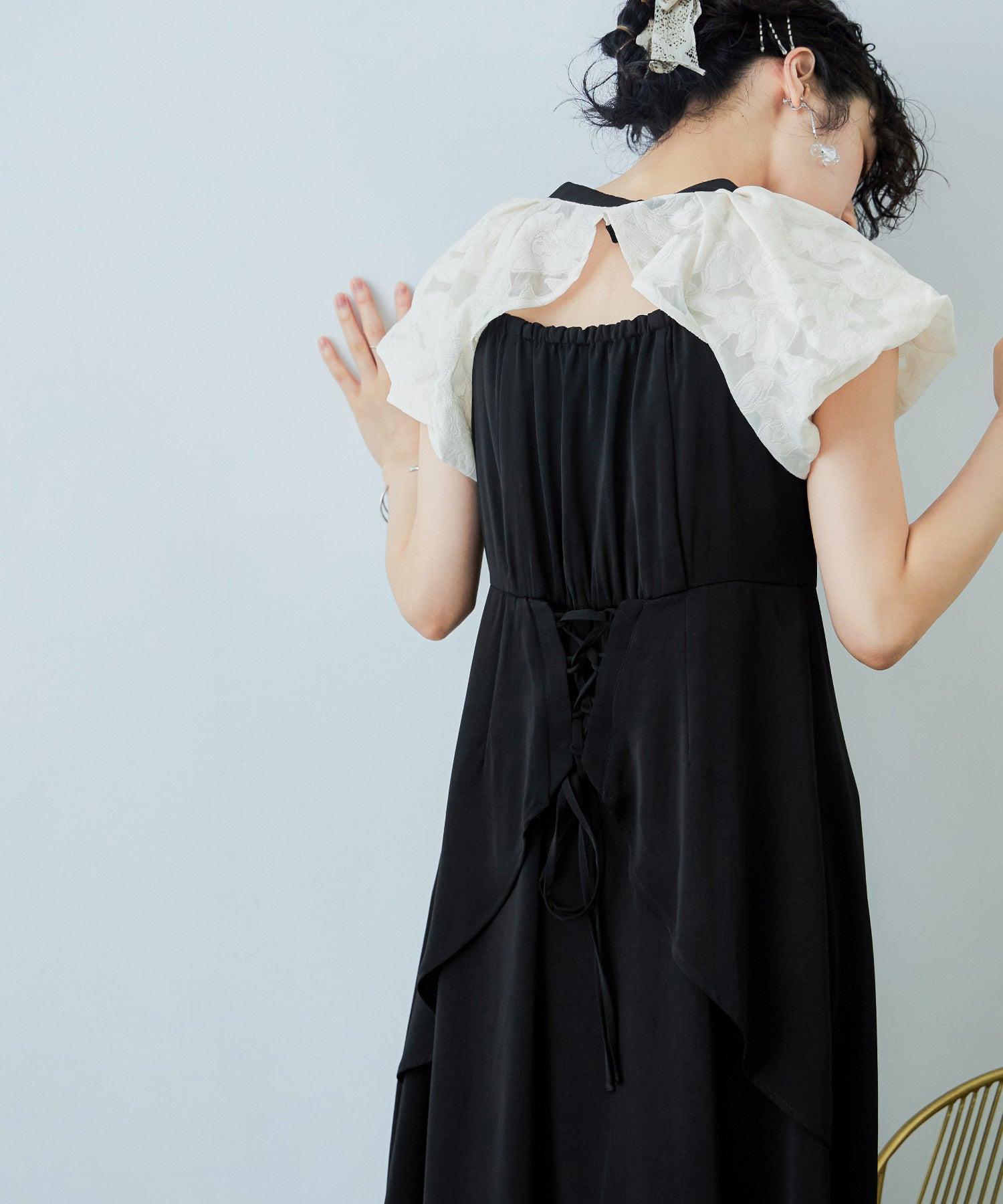 存在感ある花柄ジャガードのバルーンスリーブ切替ドレス。