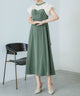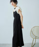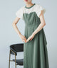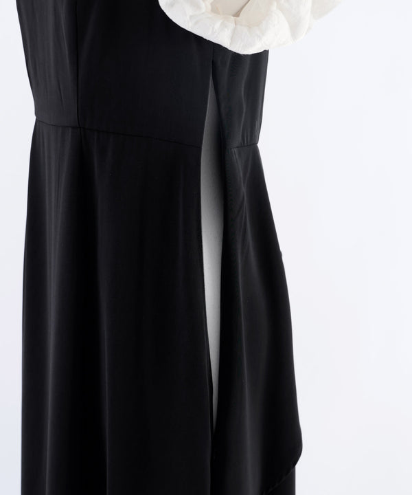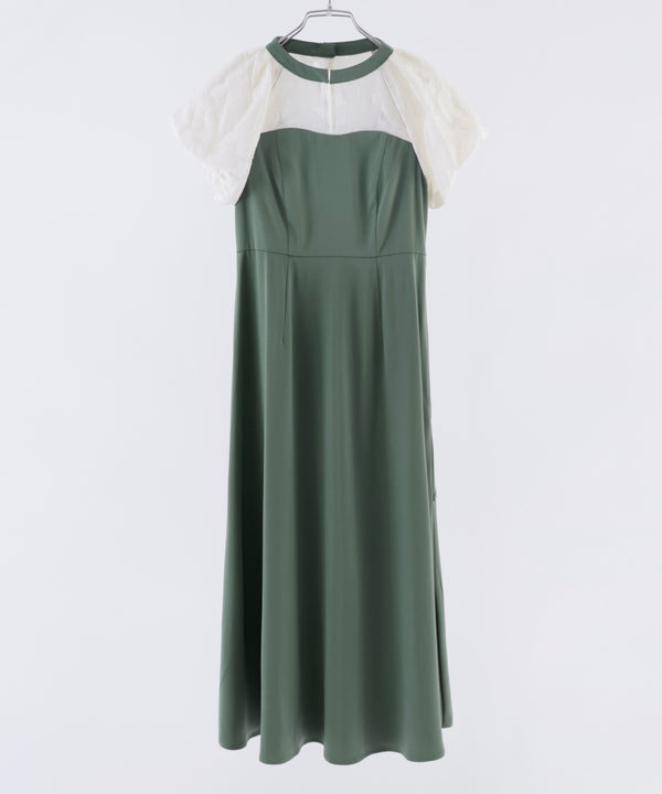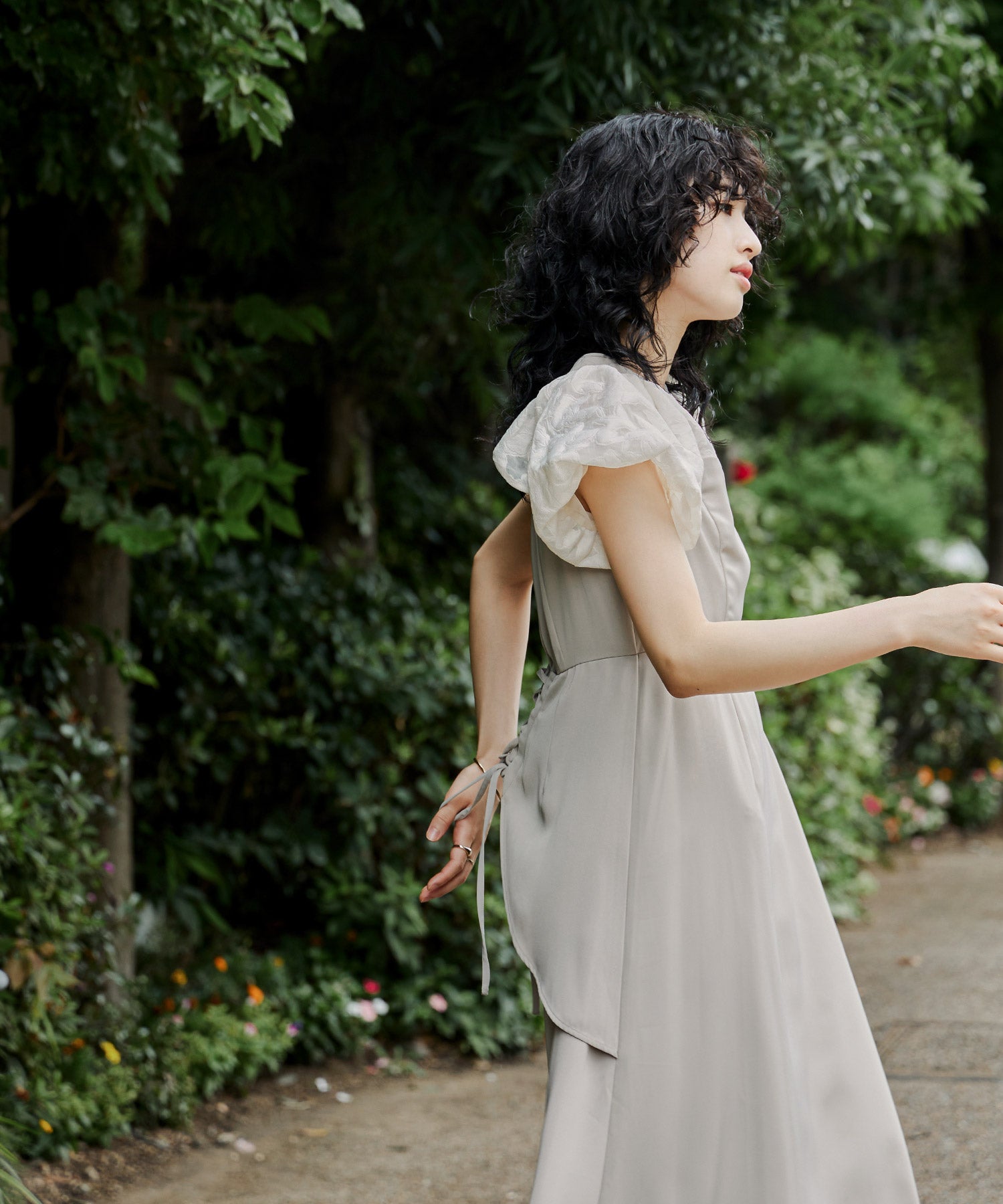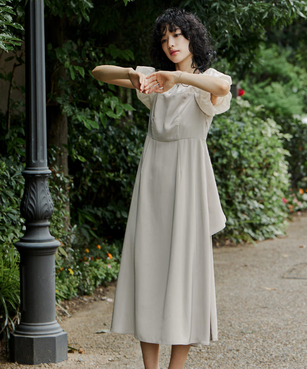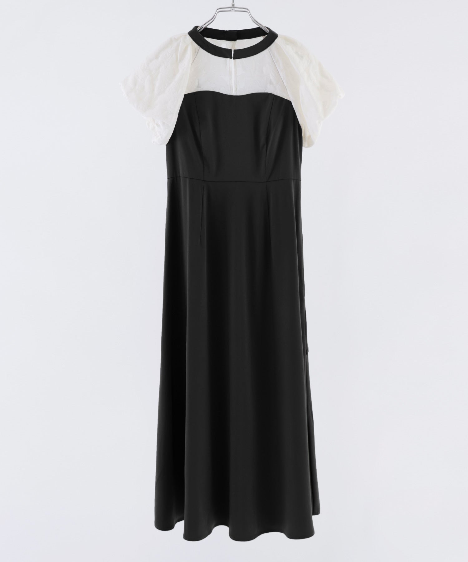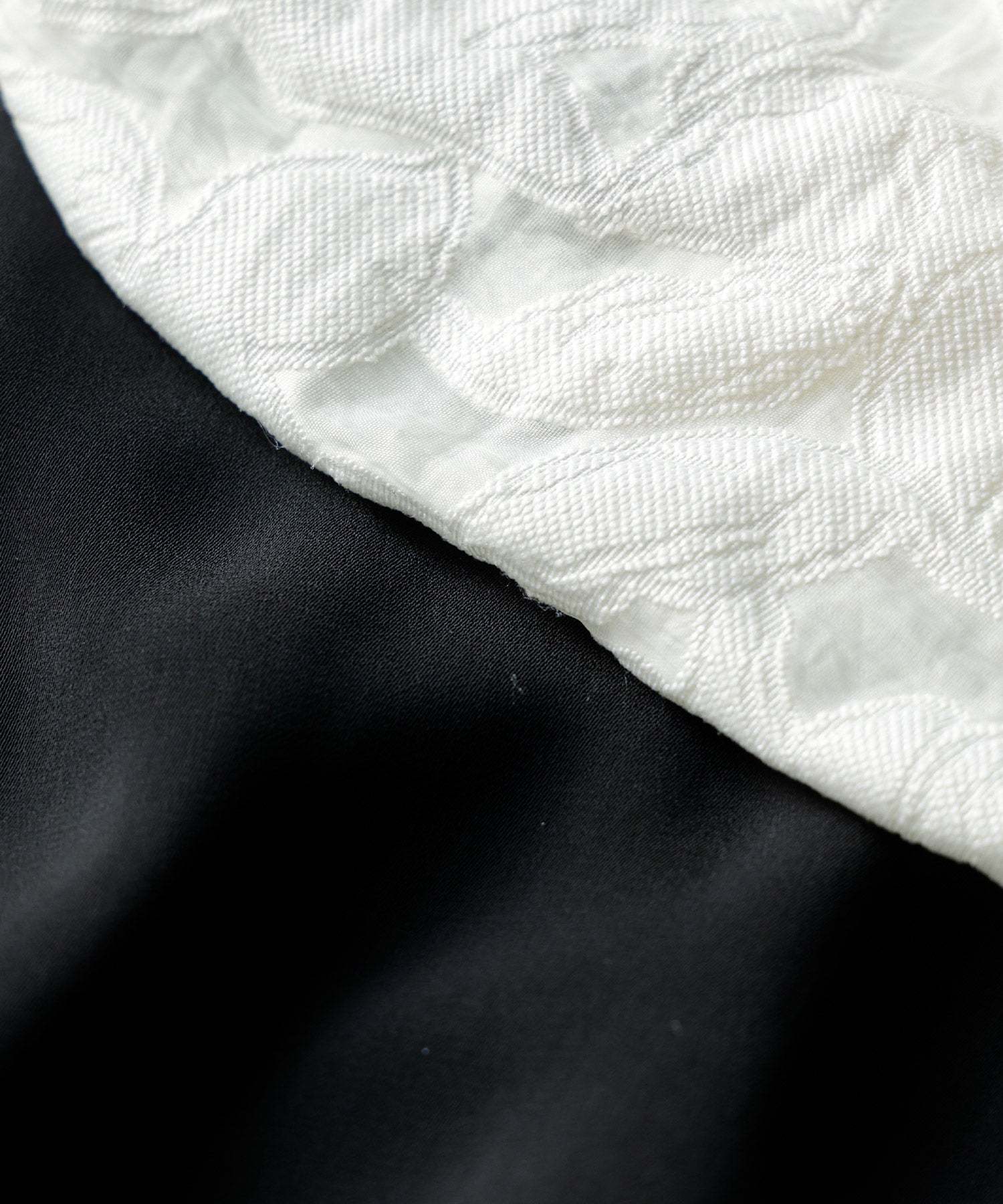 Zname 花柄ジャガードパフスリーブ切替サテンドレス