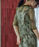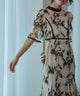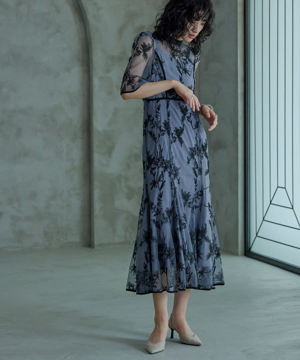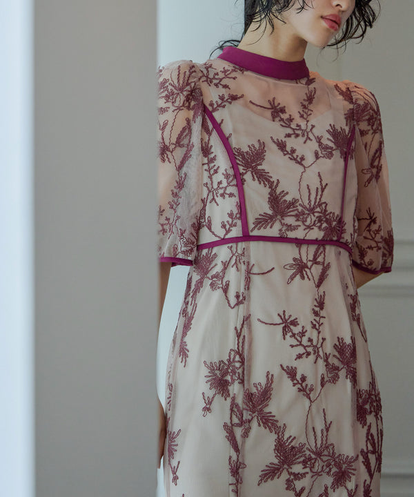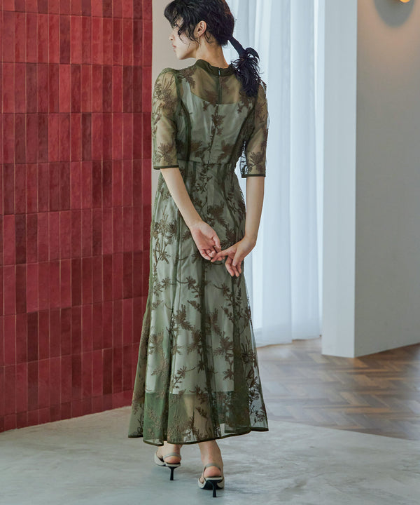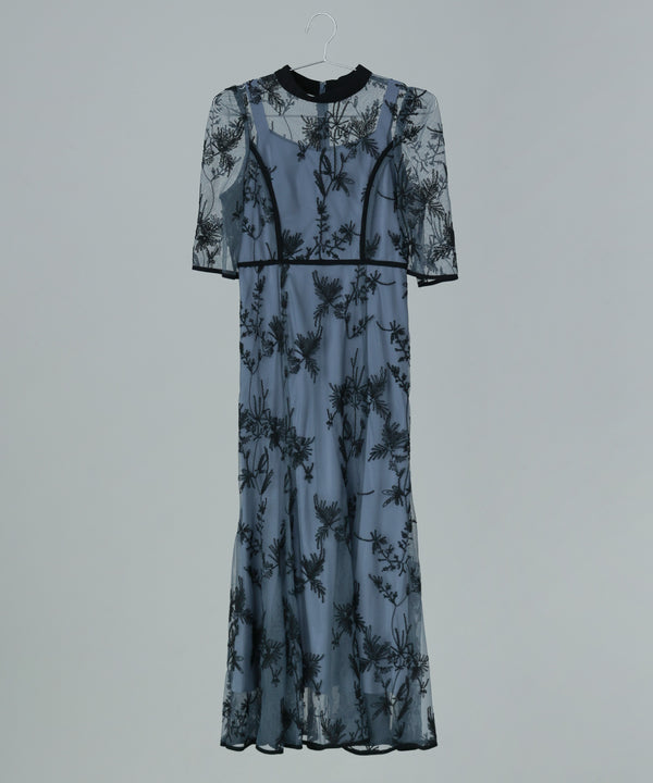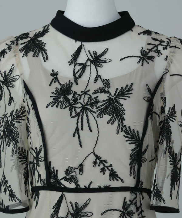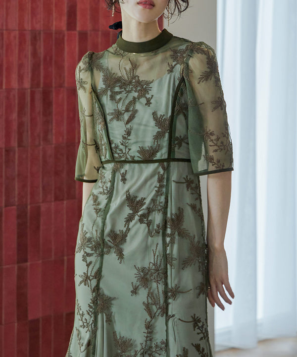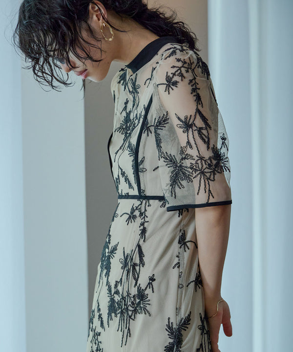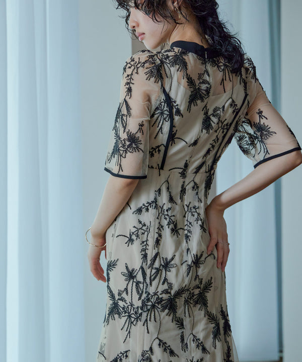 バイカラーの刺繍レースを使用したエレガントなドレス。