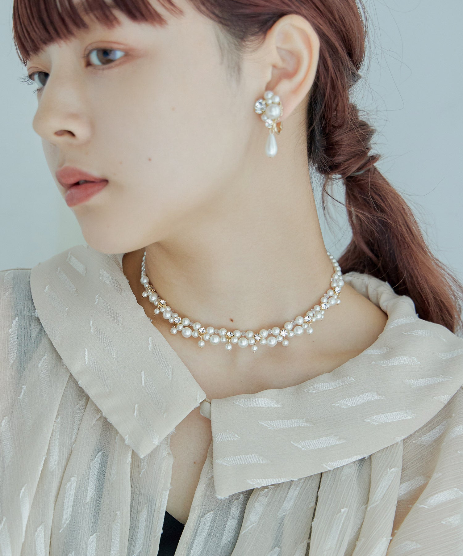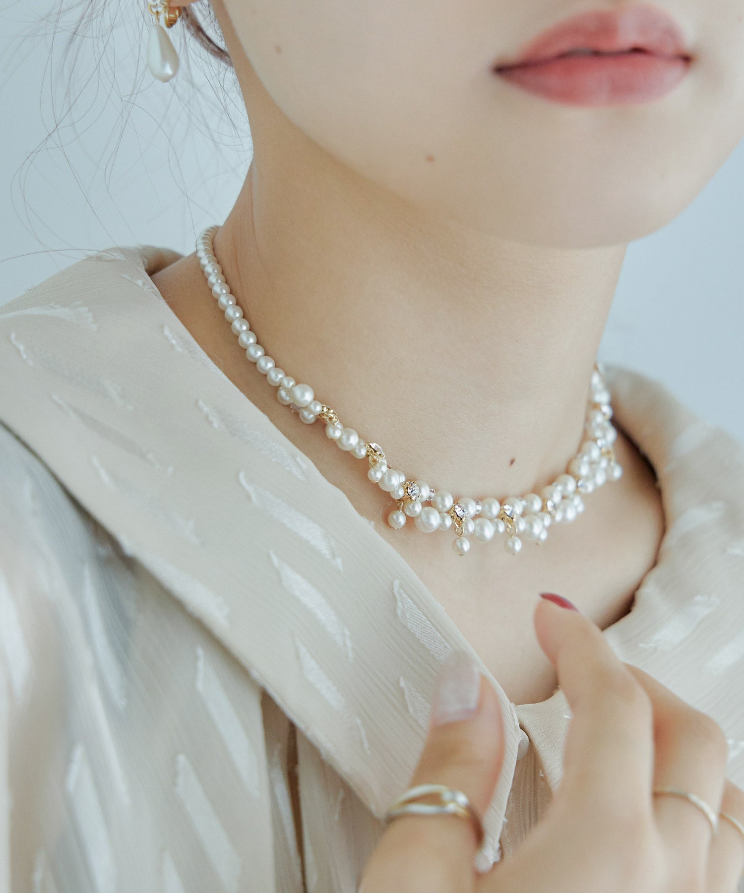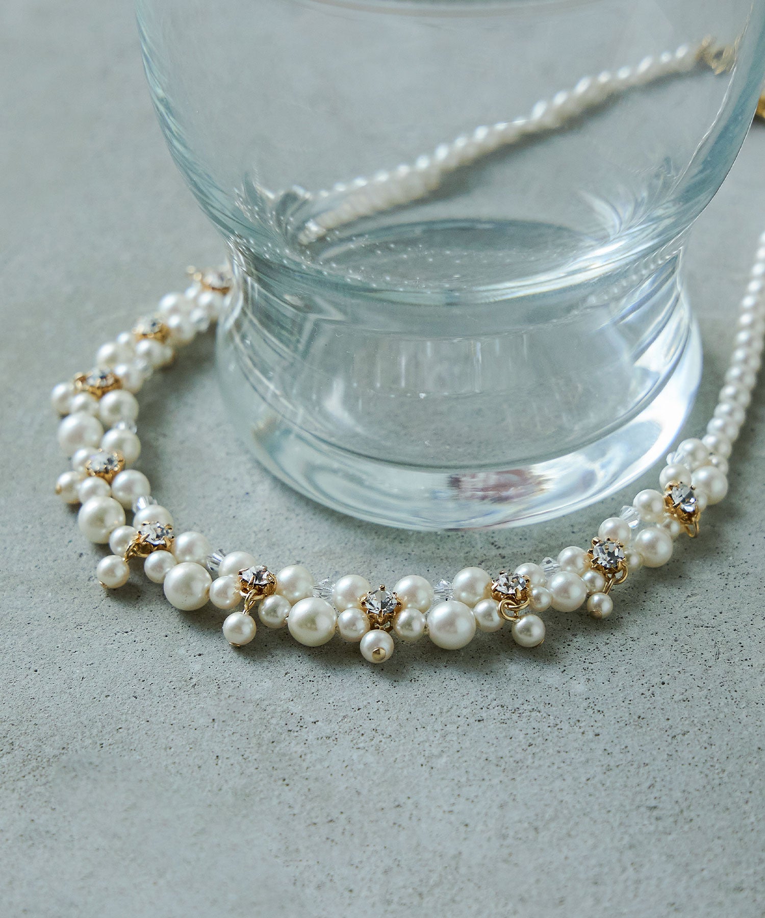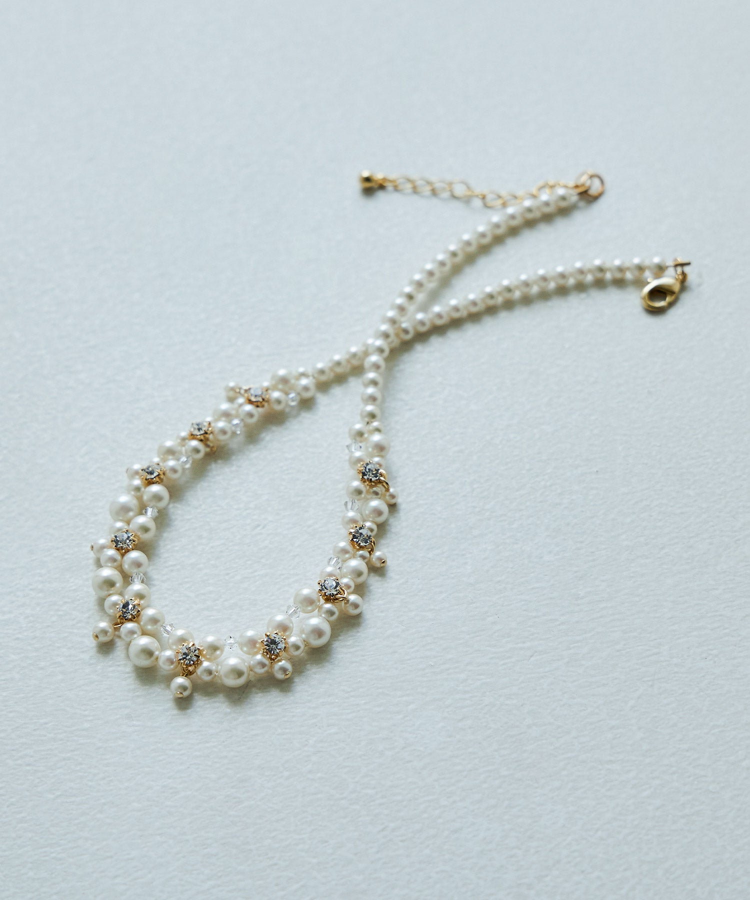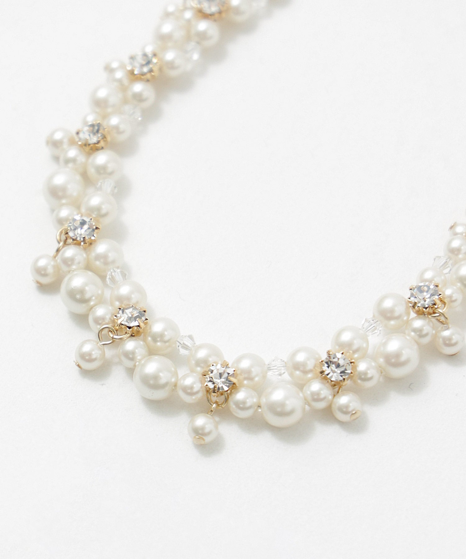 小粒パールとビジューを編んだエレガントなネックレス。