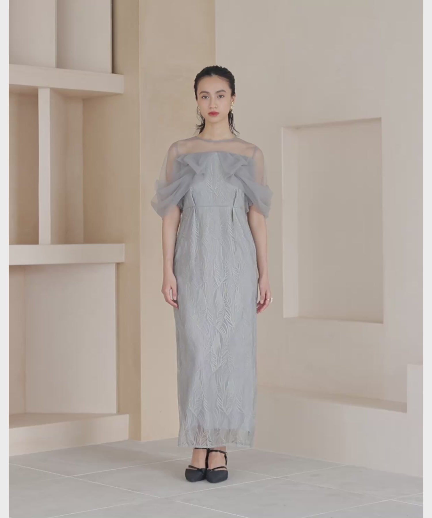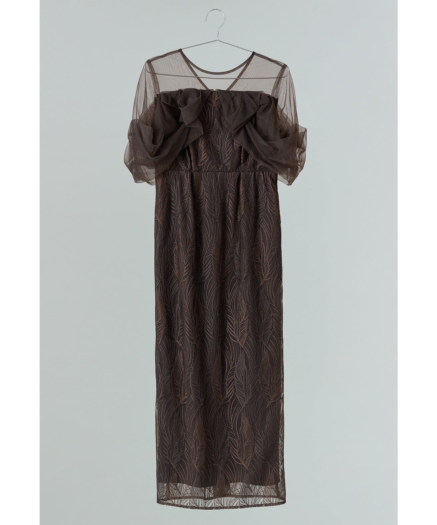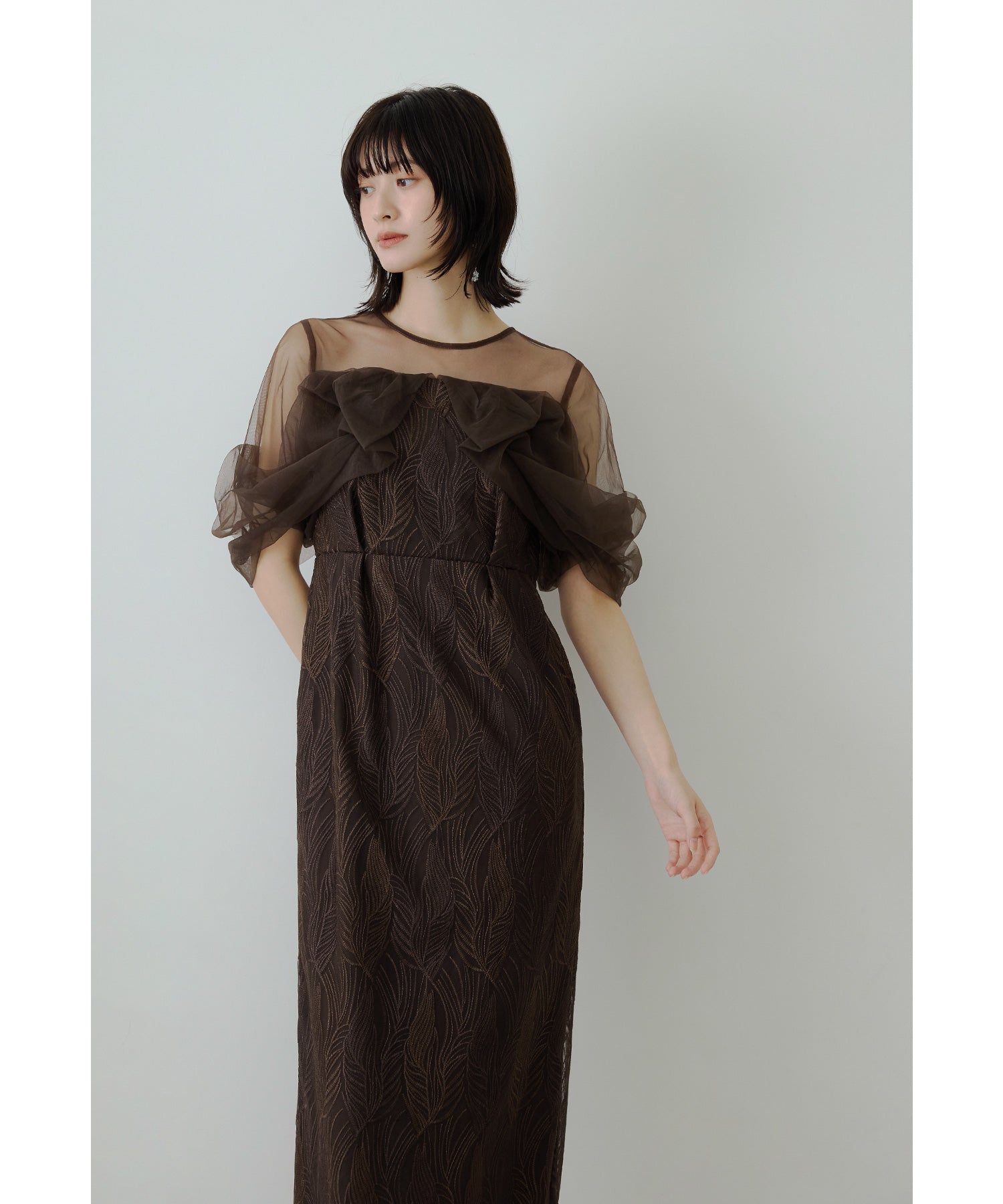 デコルテラインはシアー素材を使用し、ネックレスも映えるデザインに。