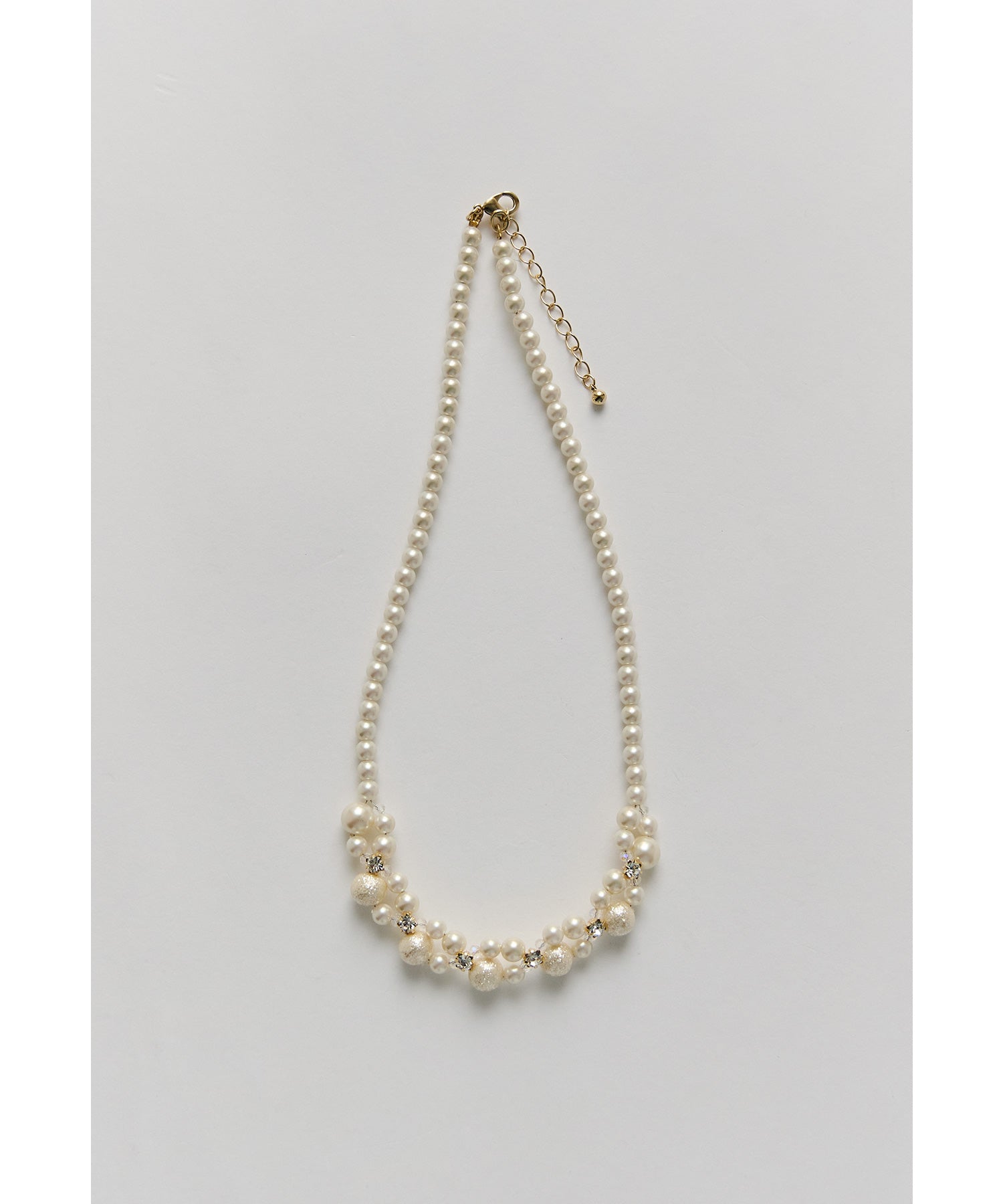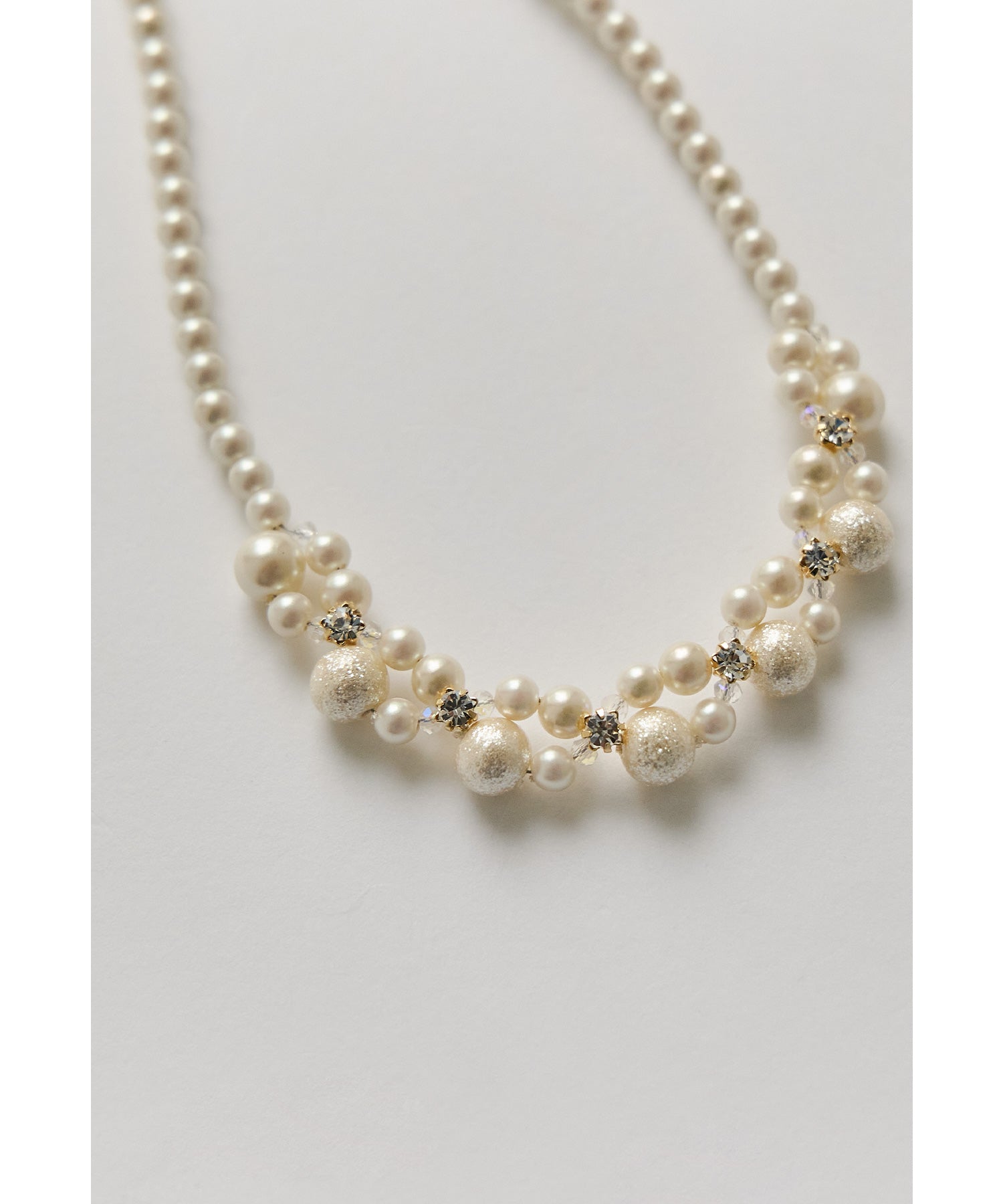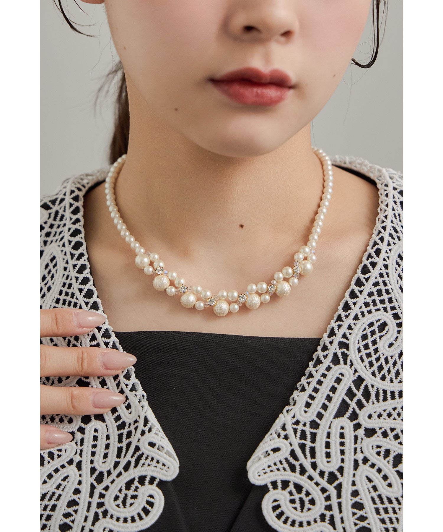 柔らかな輝きを放つパールとビジュー、オーロラビーズを組み合わせたショートネックレス。