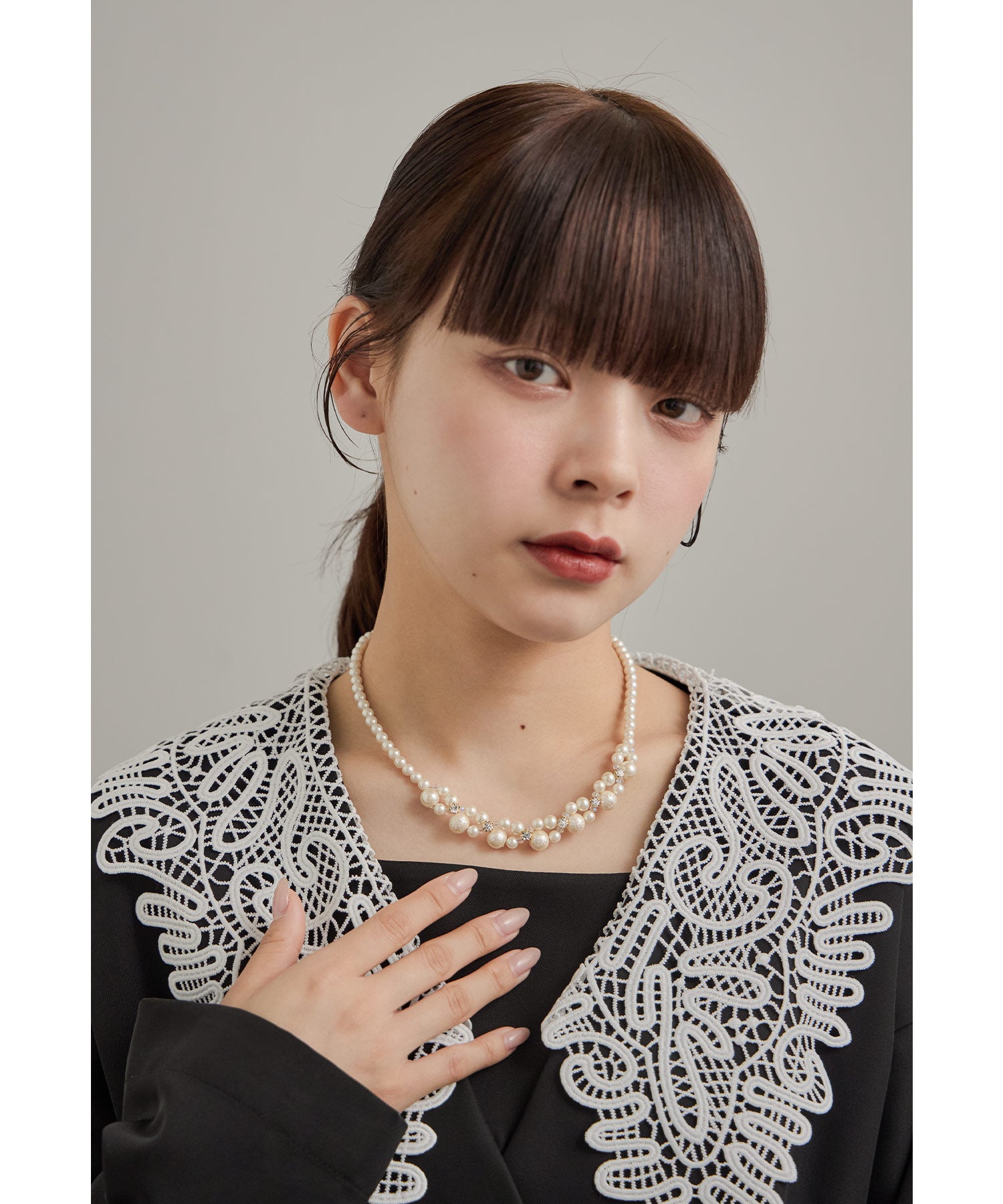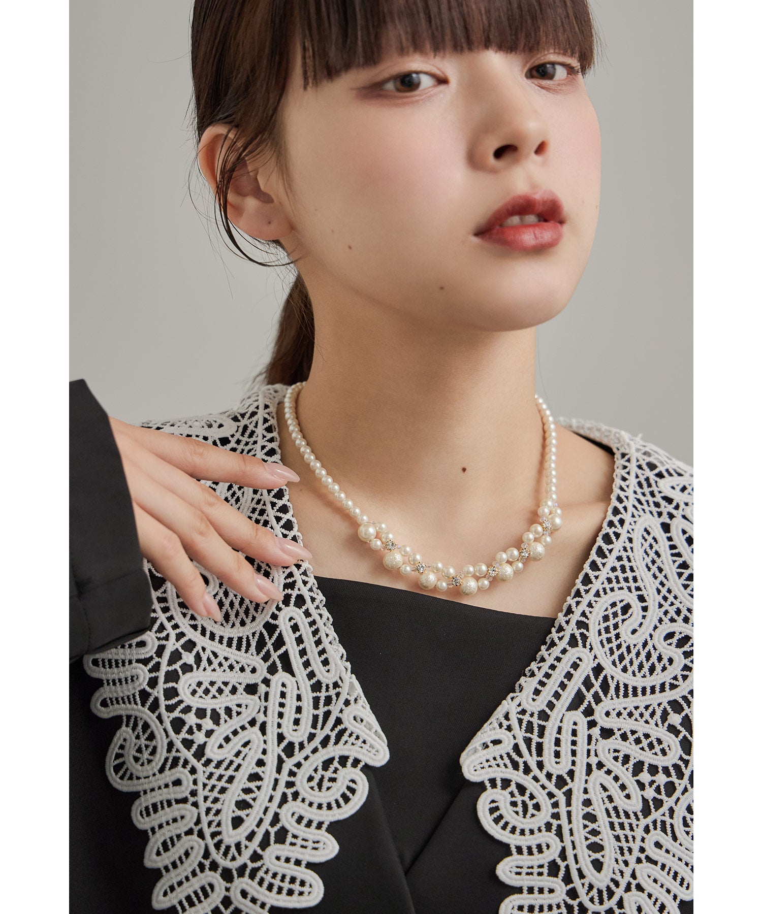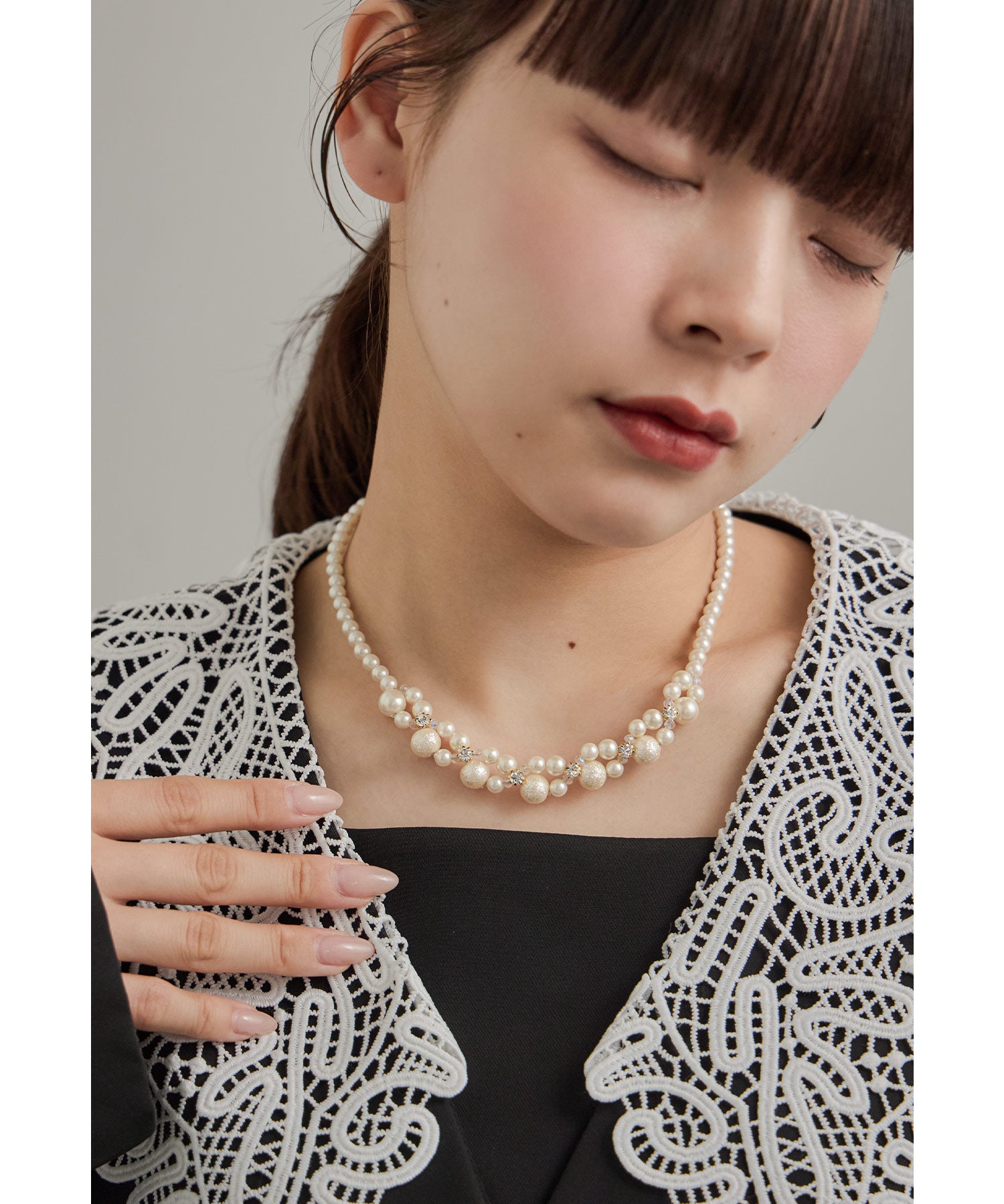 柔らかな輝きを放つパールとビジュー、オーロラビーズを組み合わせたショートネックレス。
