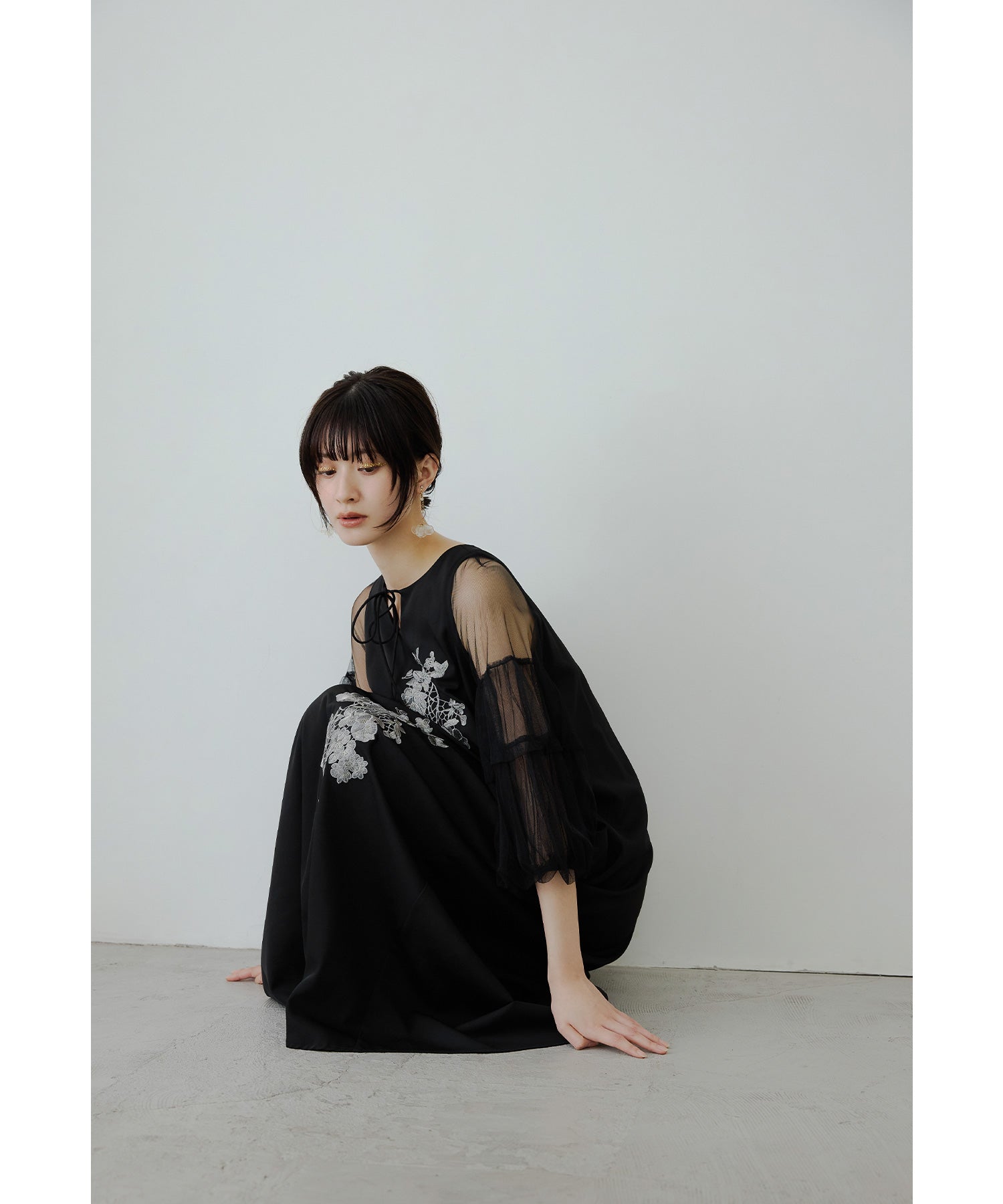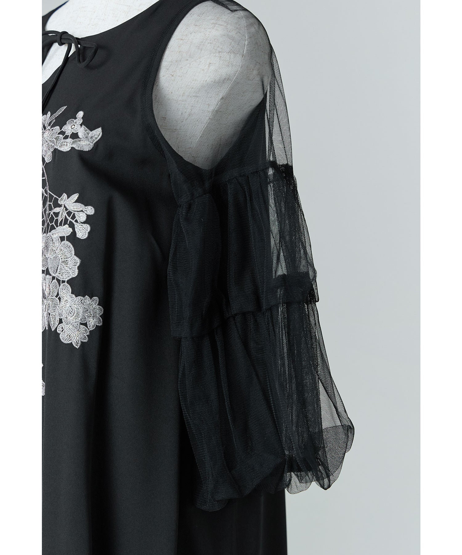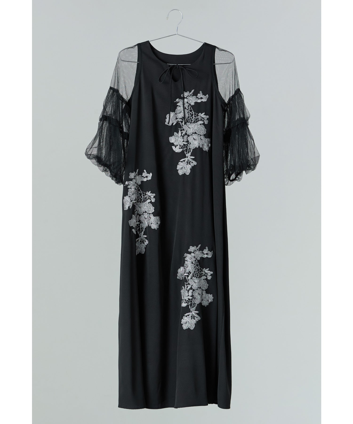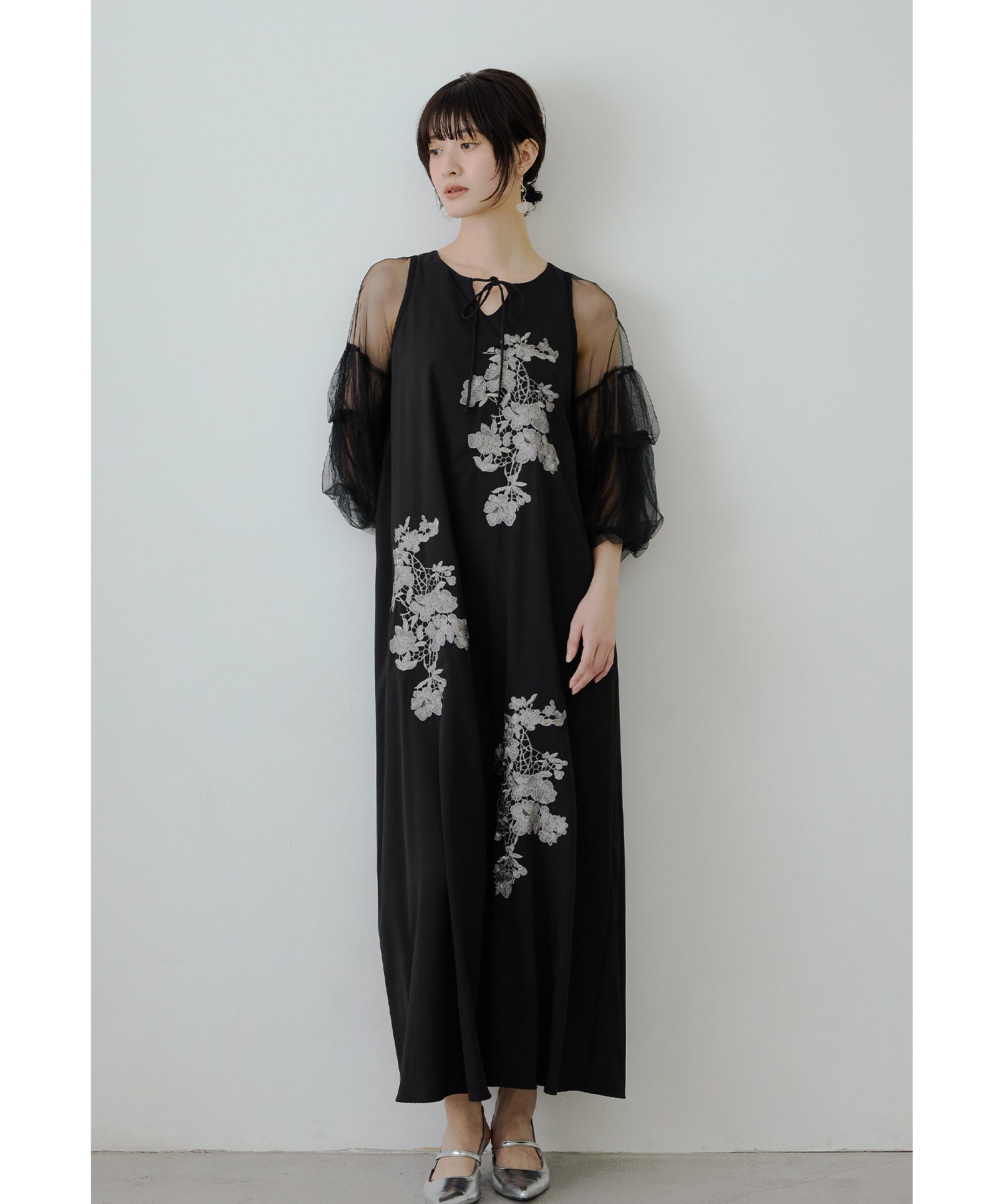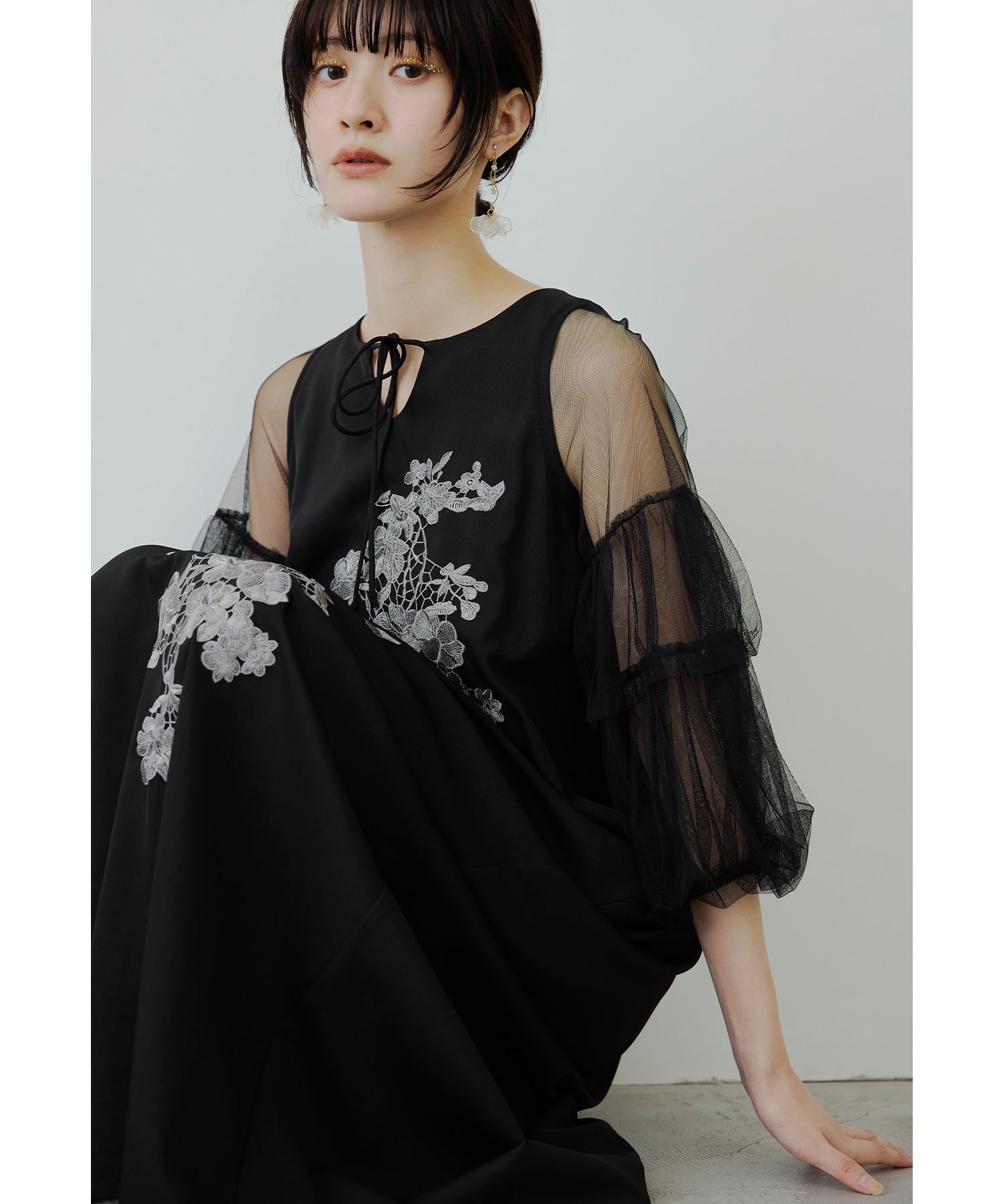 Rname フラワー刺繍Aラインドレス パーティードレス 結婚式 花柄 チュール リボン ボリューム袖 七分袖 妊婦 マタニティ Aライン 体型カバー 二の腕カバー お呼ばれ パーティー 二次会 披露宴 謝恩会 成人式 同窓会 卒業式 フォーマル オケージョンドレス デイリー 春 夏 秋 冬 黒
