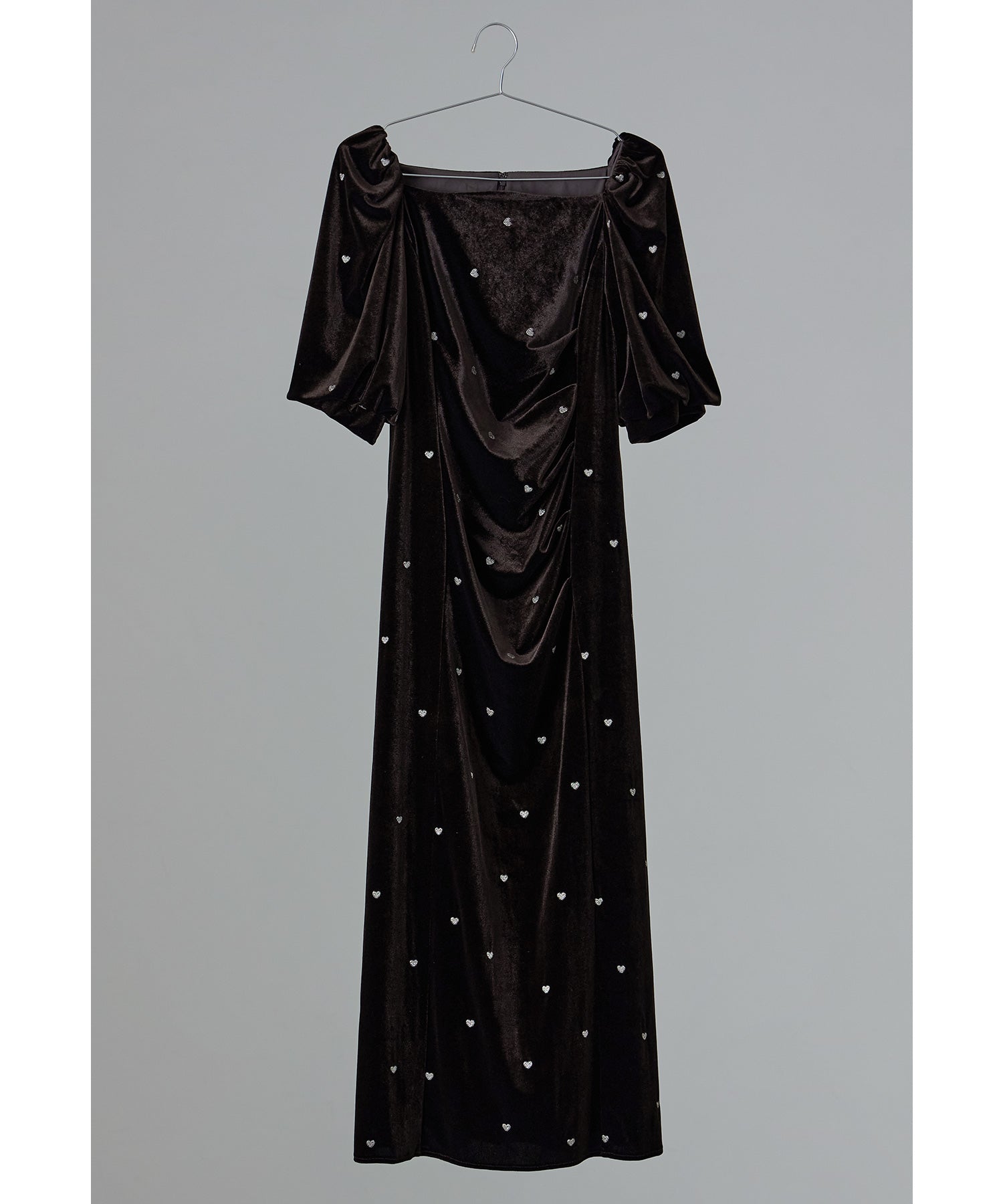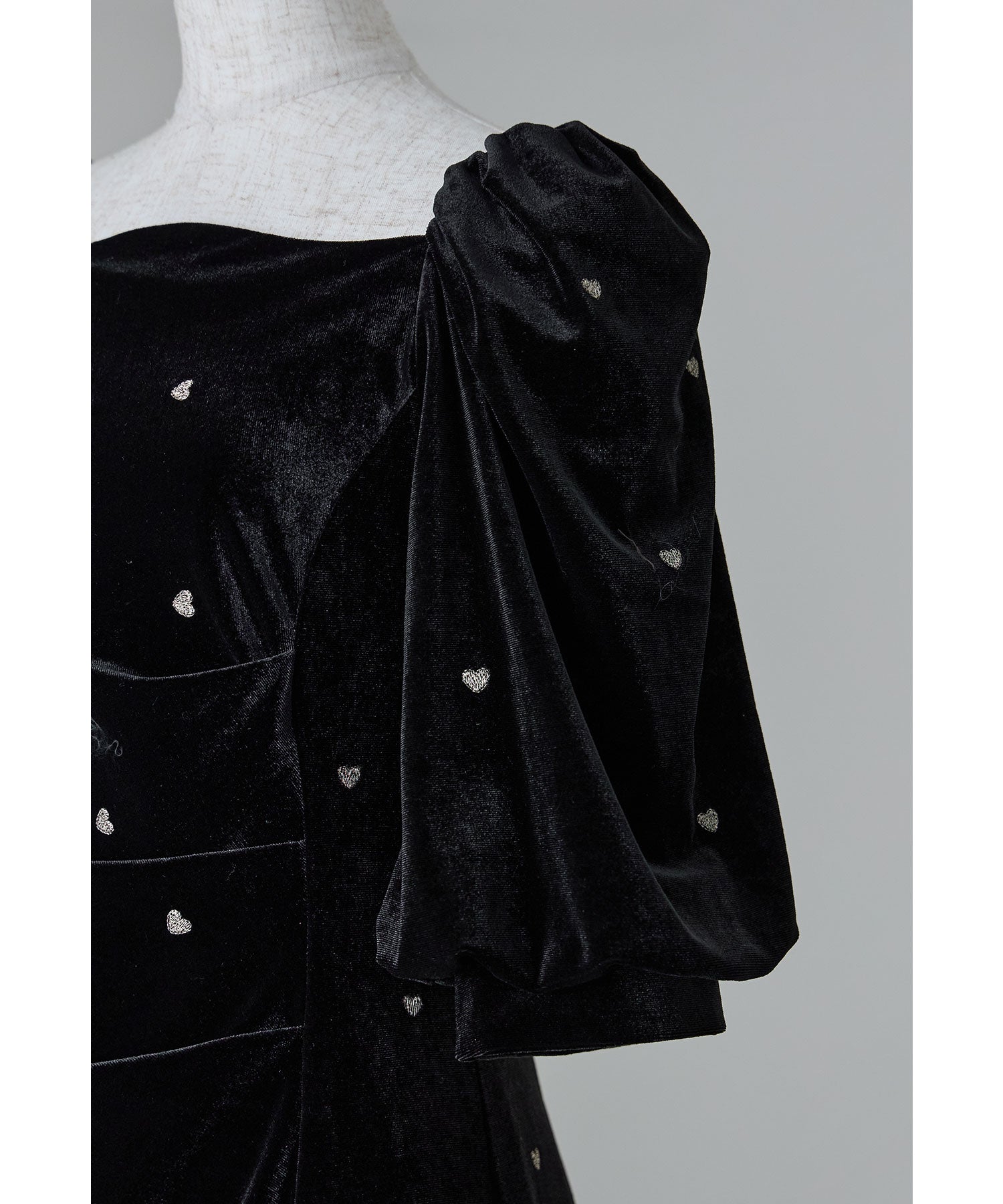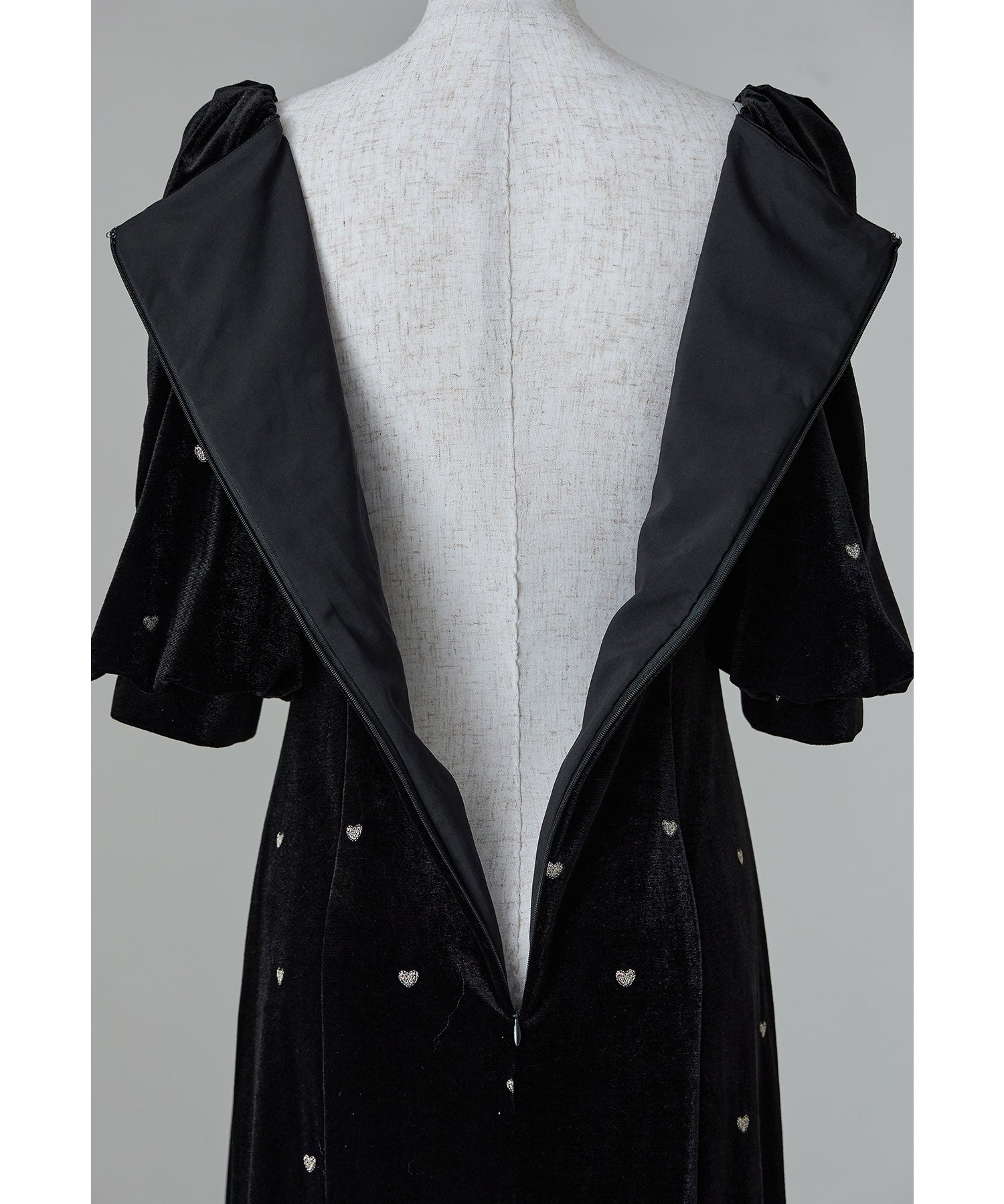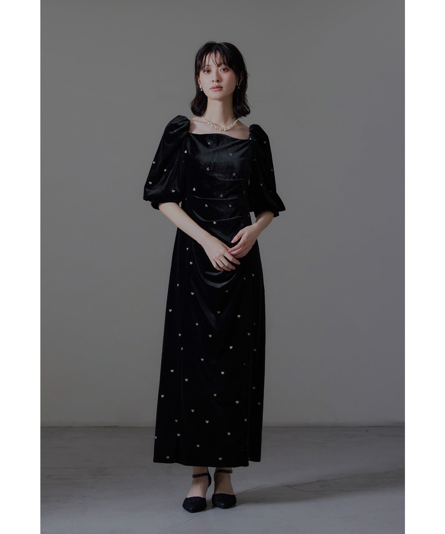 Rname スイートハートベロアドレス パーティードレス 結婚式 ドレープ パフスリーブ ボリューム袖 フレア ロング丈 袖あり 五分袖 お呼ばれ パーティー 二次会 披露宴 謝恩会 成人式 同窓会 卒業式 フォーマル オケージョンドレス 半袖 春 秋 冬 S M L 黒 ブラック ブラウン ブルー
