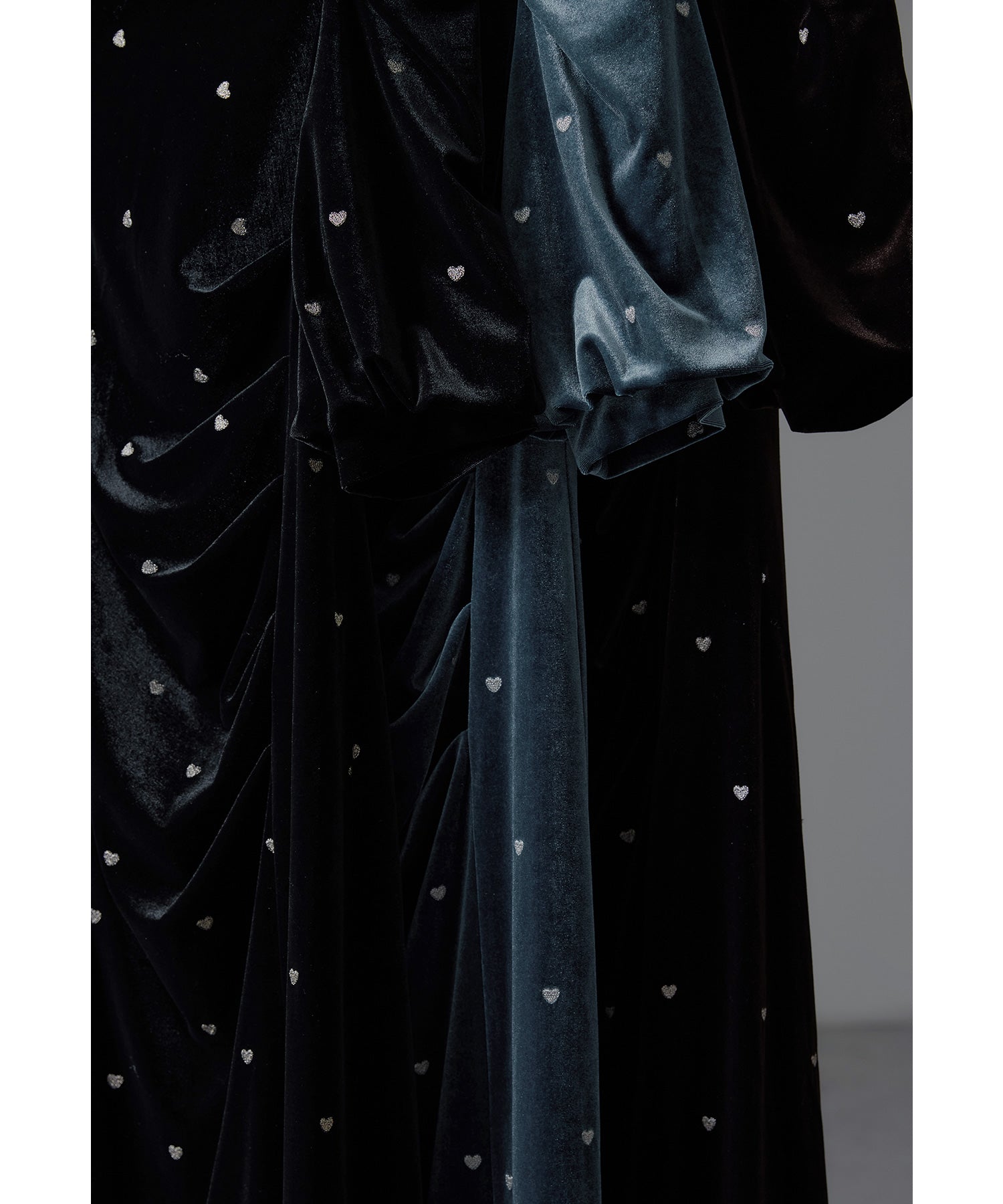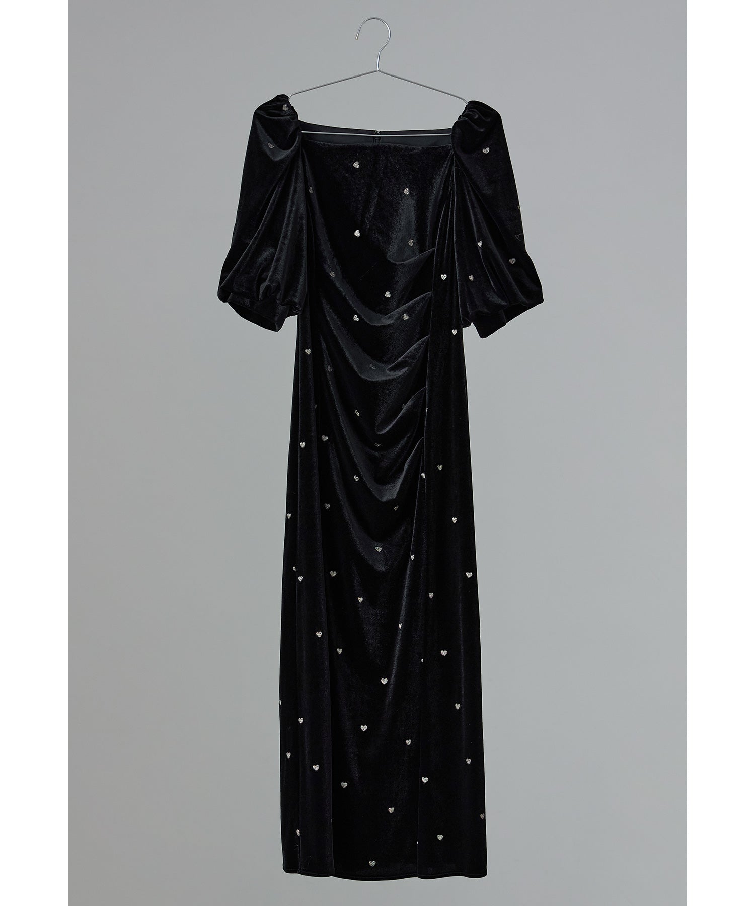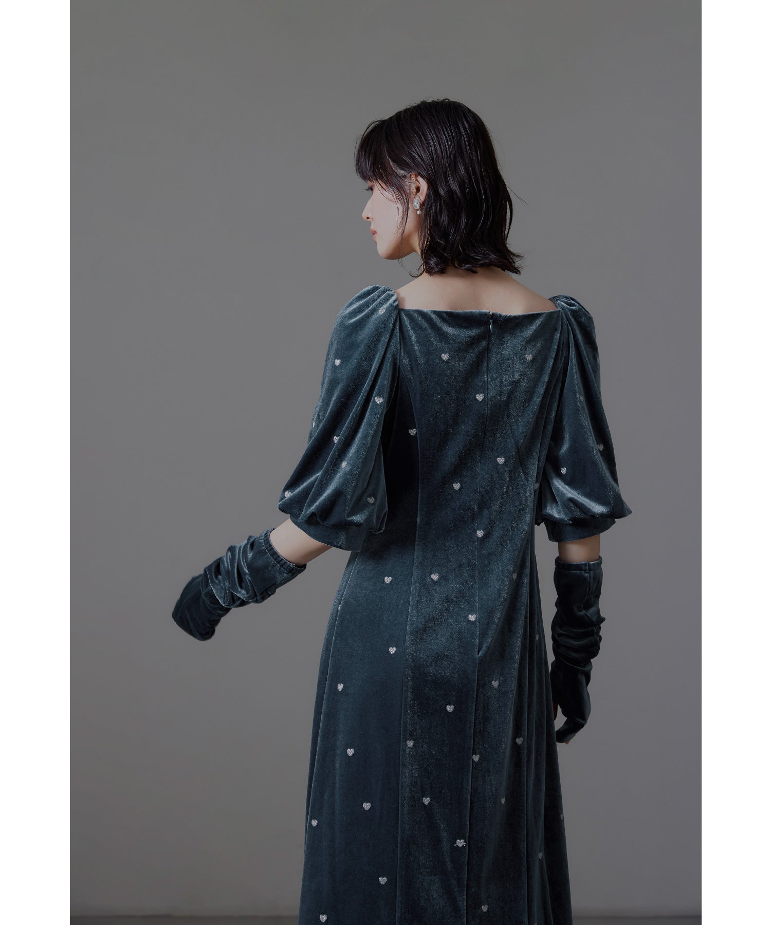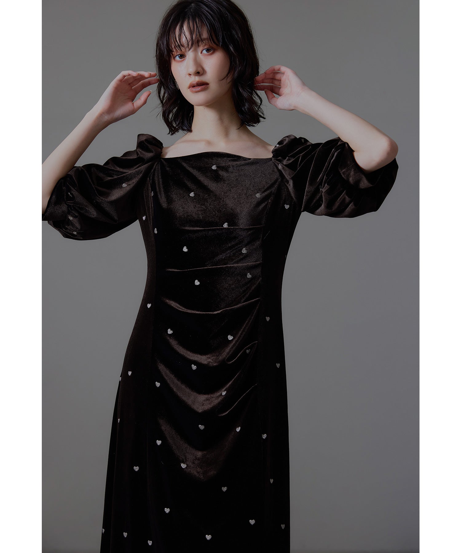 Rname スイートハートベロアドレス パーティードレス 結婚式 ドレープ パフスリーブ ボリューム袖 フレア ロング丈 袖あり 五分袖 お呼ばれ パーティー 二次会 披露宴 謝恩会 成人式 同窓会 卒業式 フォーマル オケージョンドレス 半袖 春 秋 冬 S M L 黒 ブラック ブラウン ブルー