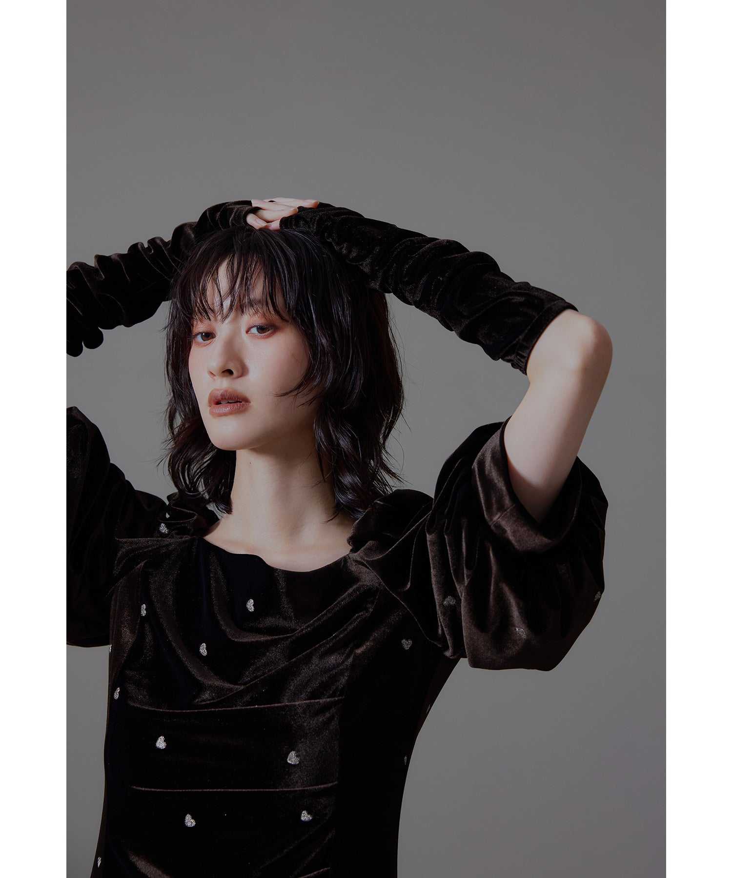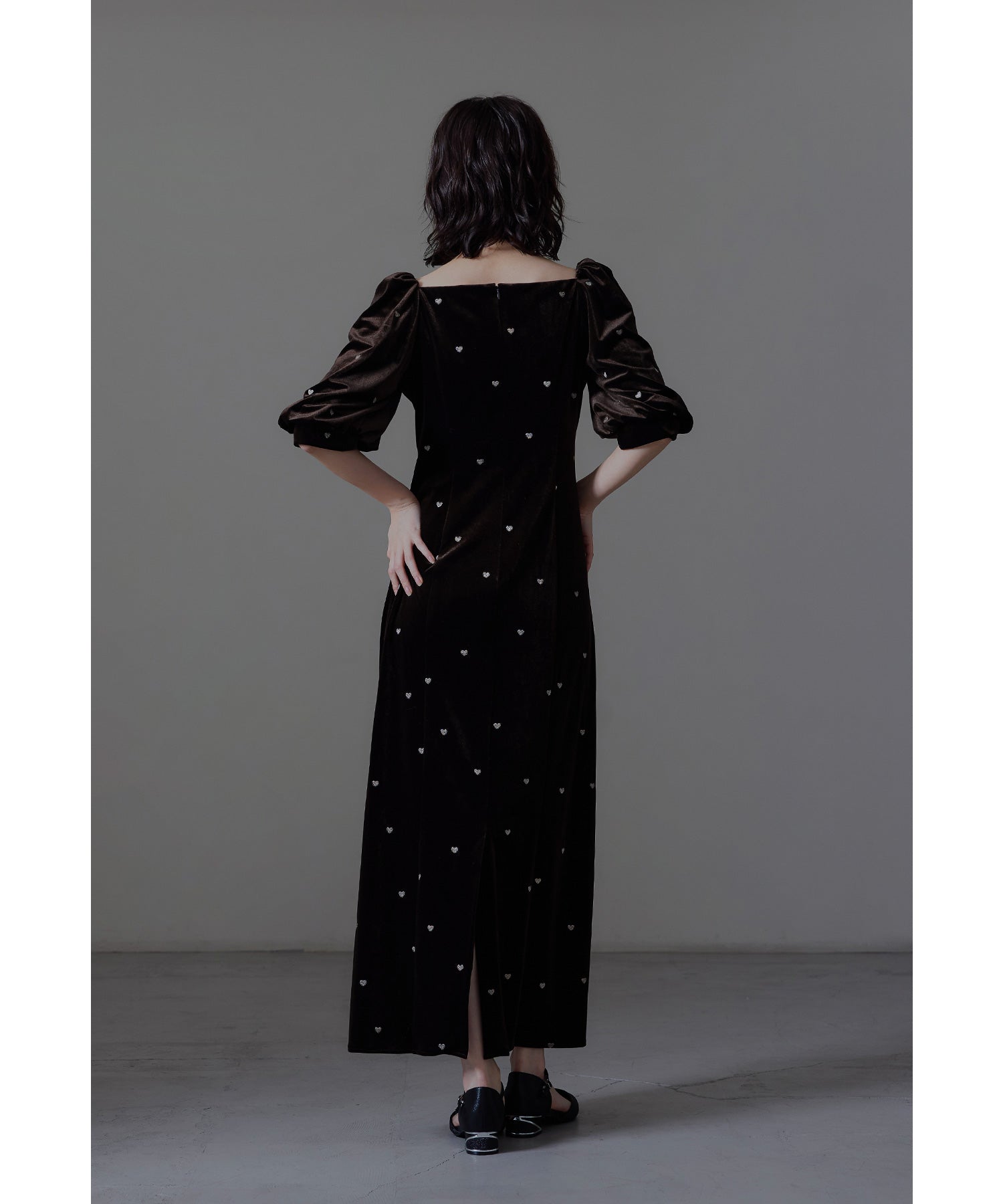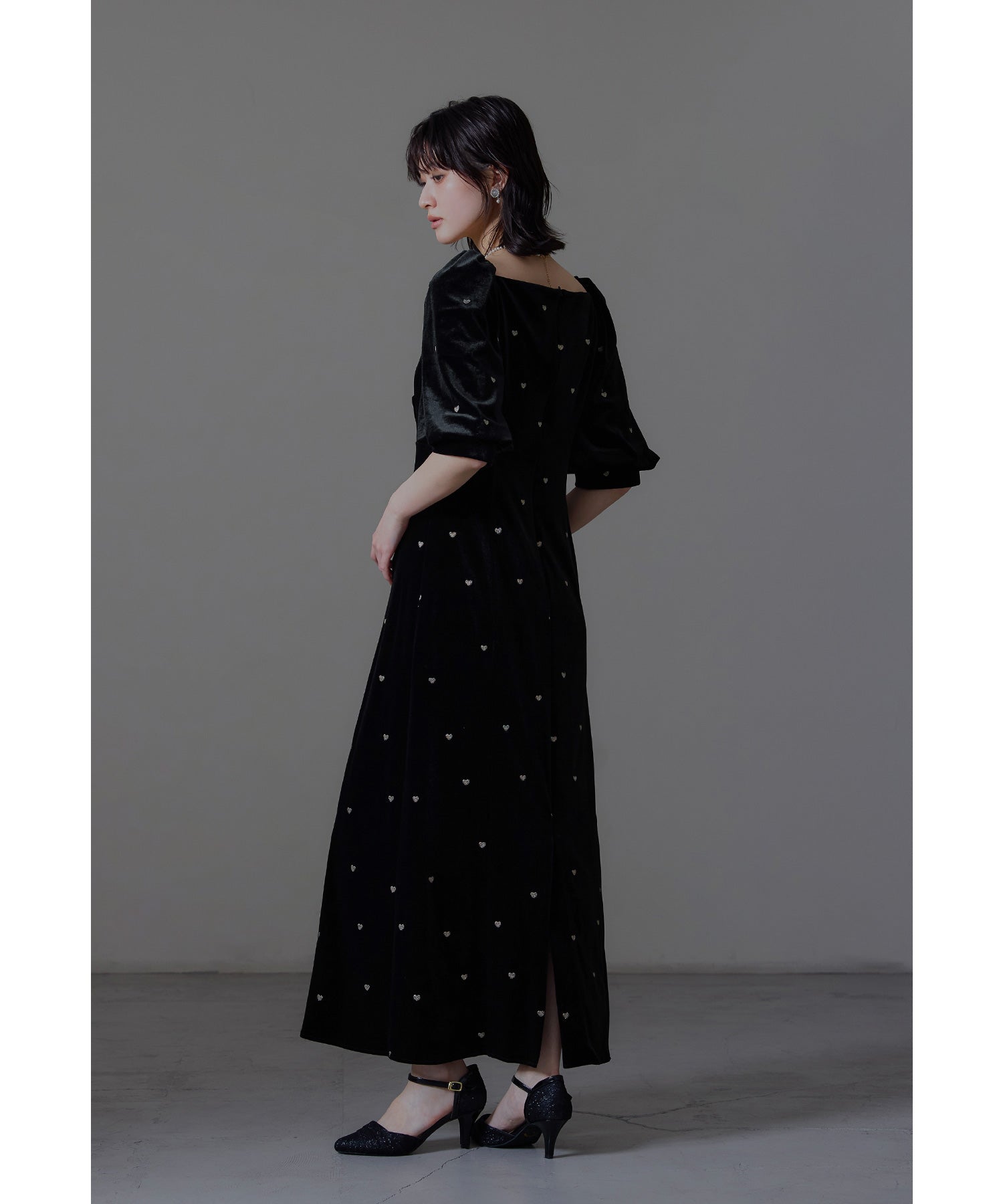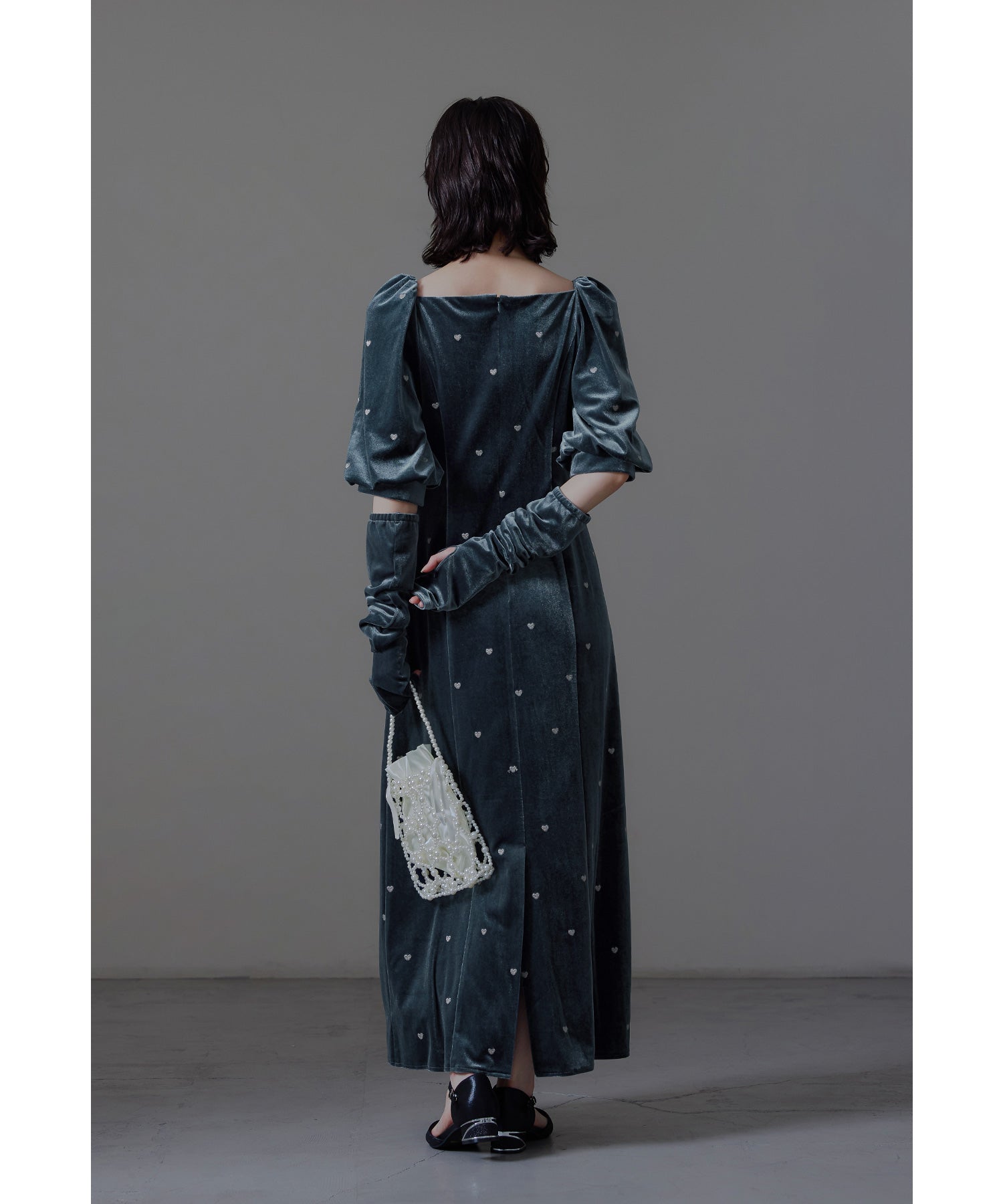 Rname スイートハートベロアドレス パーティードレス 結婚式 ドレープ パフスリーブ ボリューム袖 フレア ロング丈 袖あり 五分袖 お呼ばれ パーティー 二次会 披露宴 謝恩会 成人式 同窓会 卒業式 フォーマル オケージョンドレス 半袖 春 秋 冬 S M L 黒 ブラック ブラウン ブルー