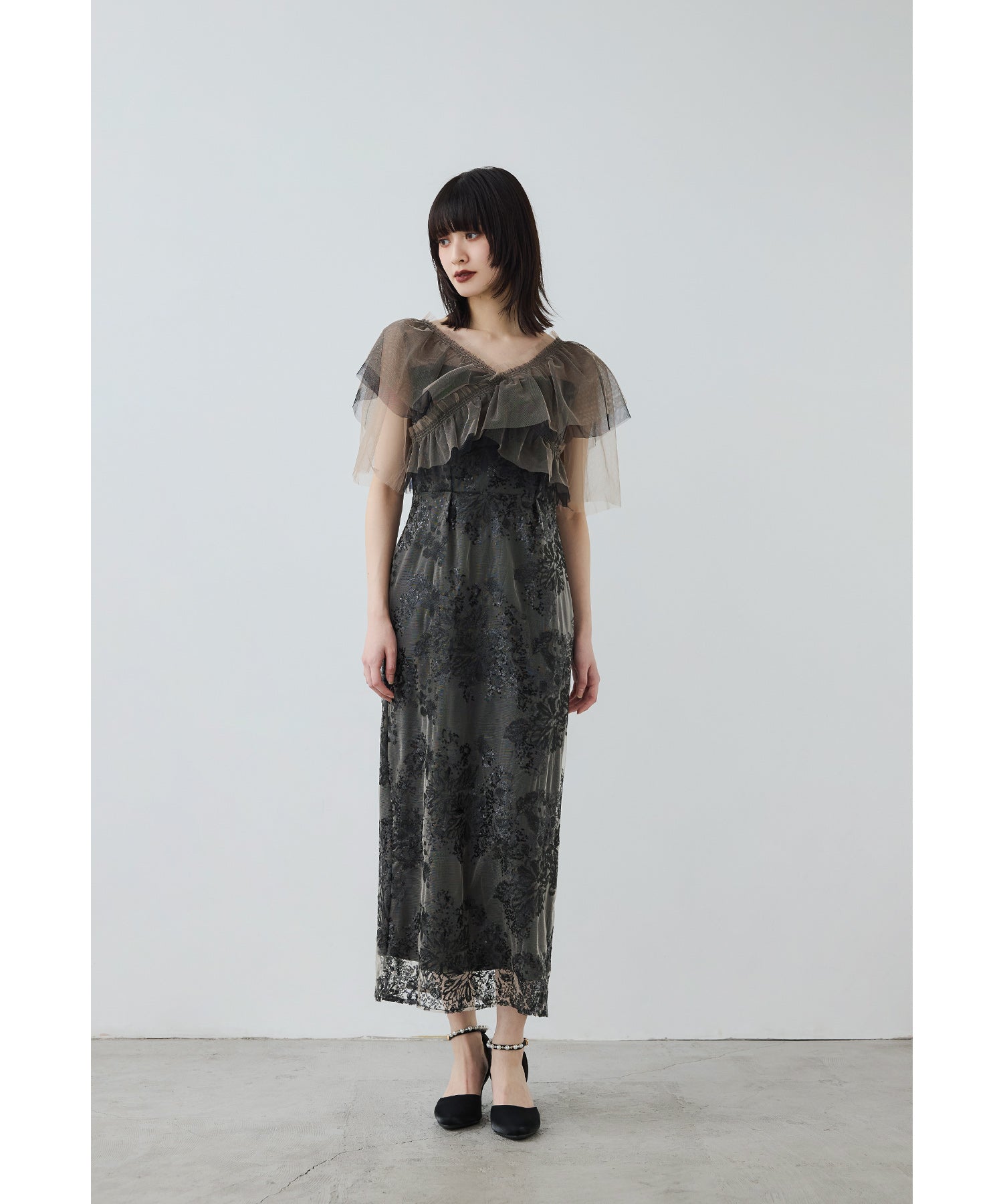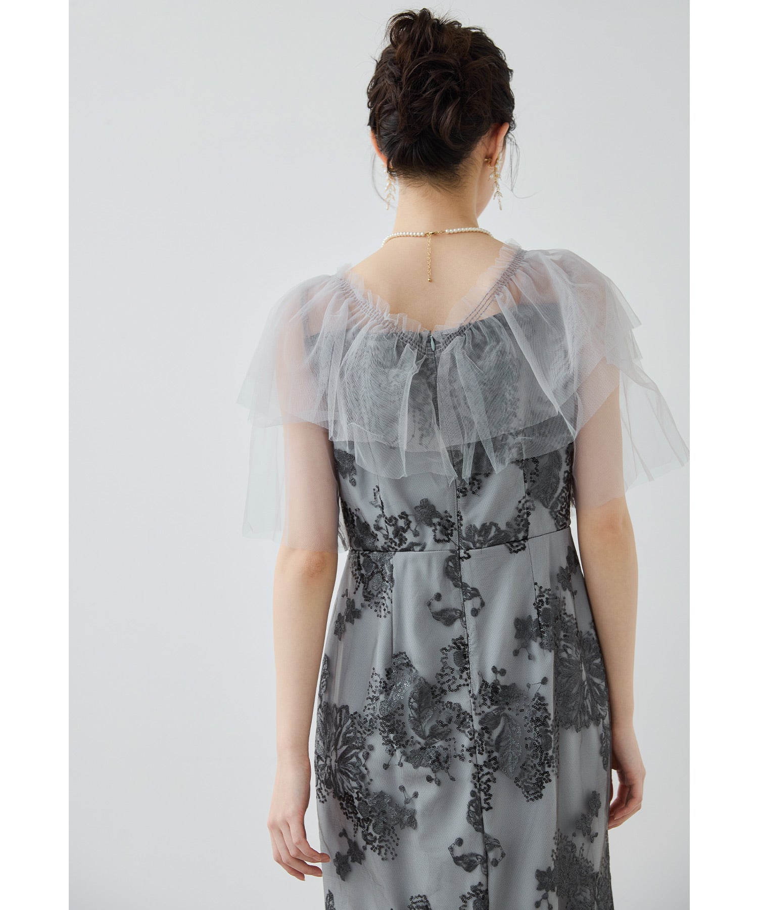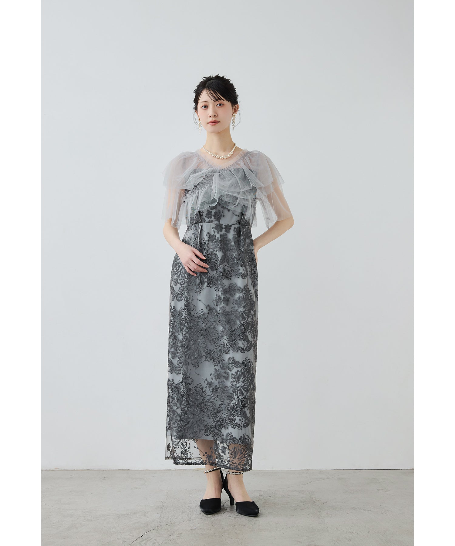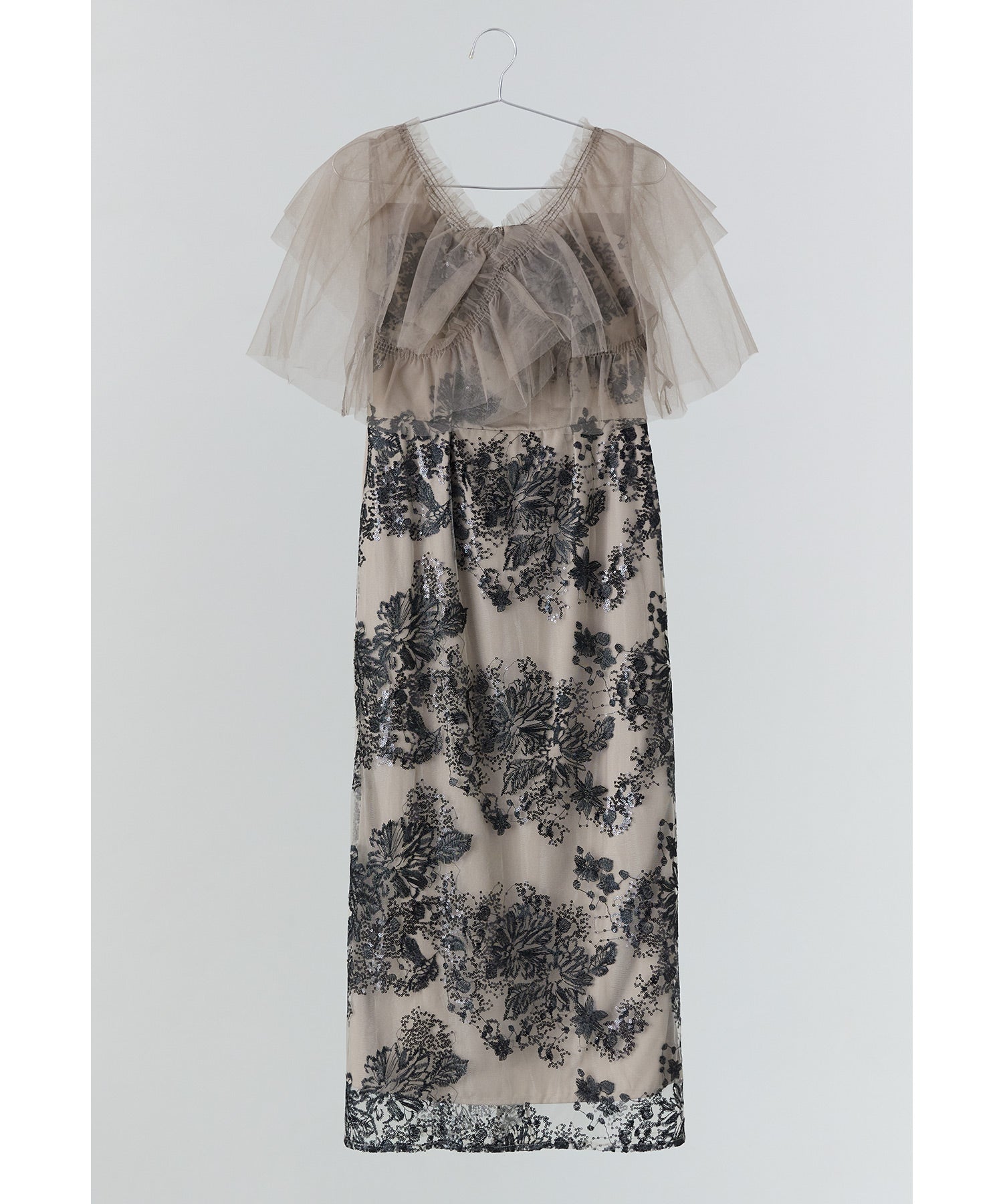 Rname レイヤードチュールドレス パーティードレス 結婚式 ワンピース スパンコール 花柄 刺繍 レース チュール シアー ロング丈 フリル 半袖 お呼ばれ パーティー 二次会 披露宴 謝恩会 成人式 同窓会 卒業式 フォーマル オケージョンドレス 春 夏 秋 冬 S M L 黒 グレー ベージュ
