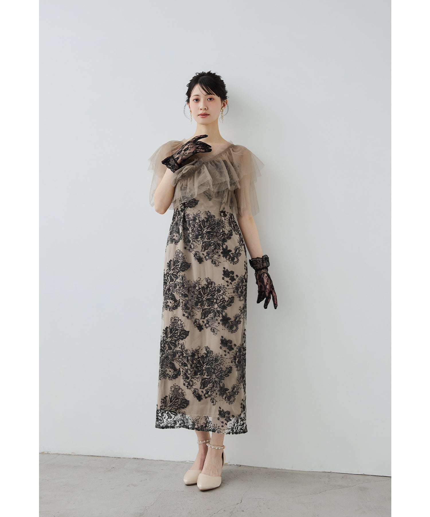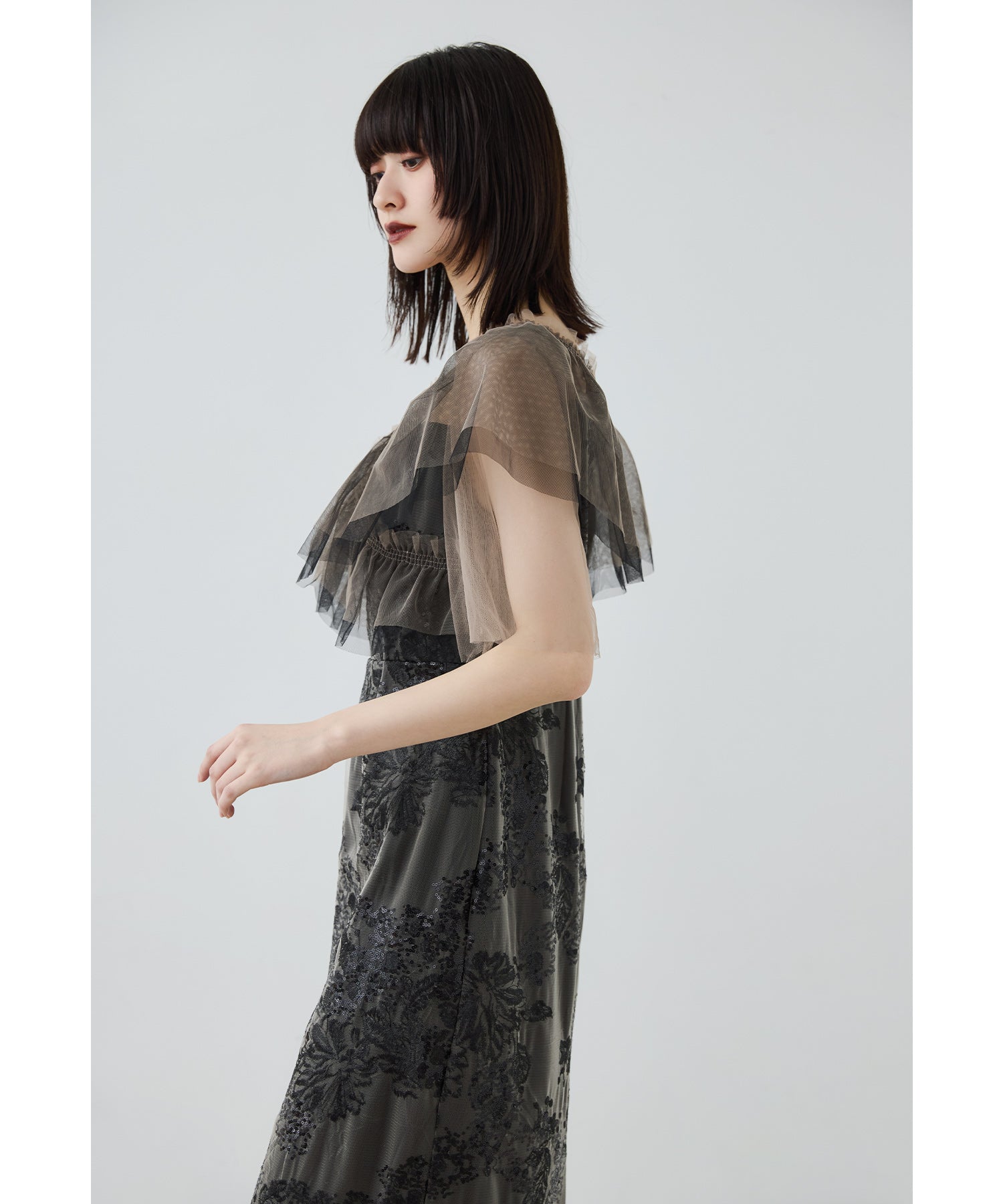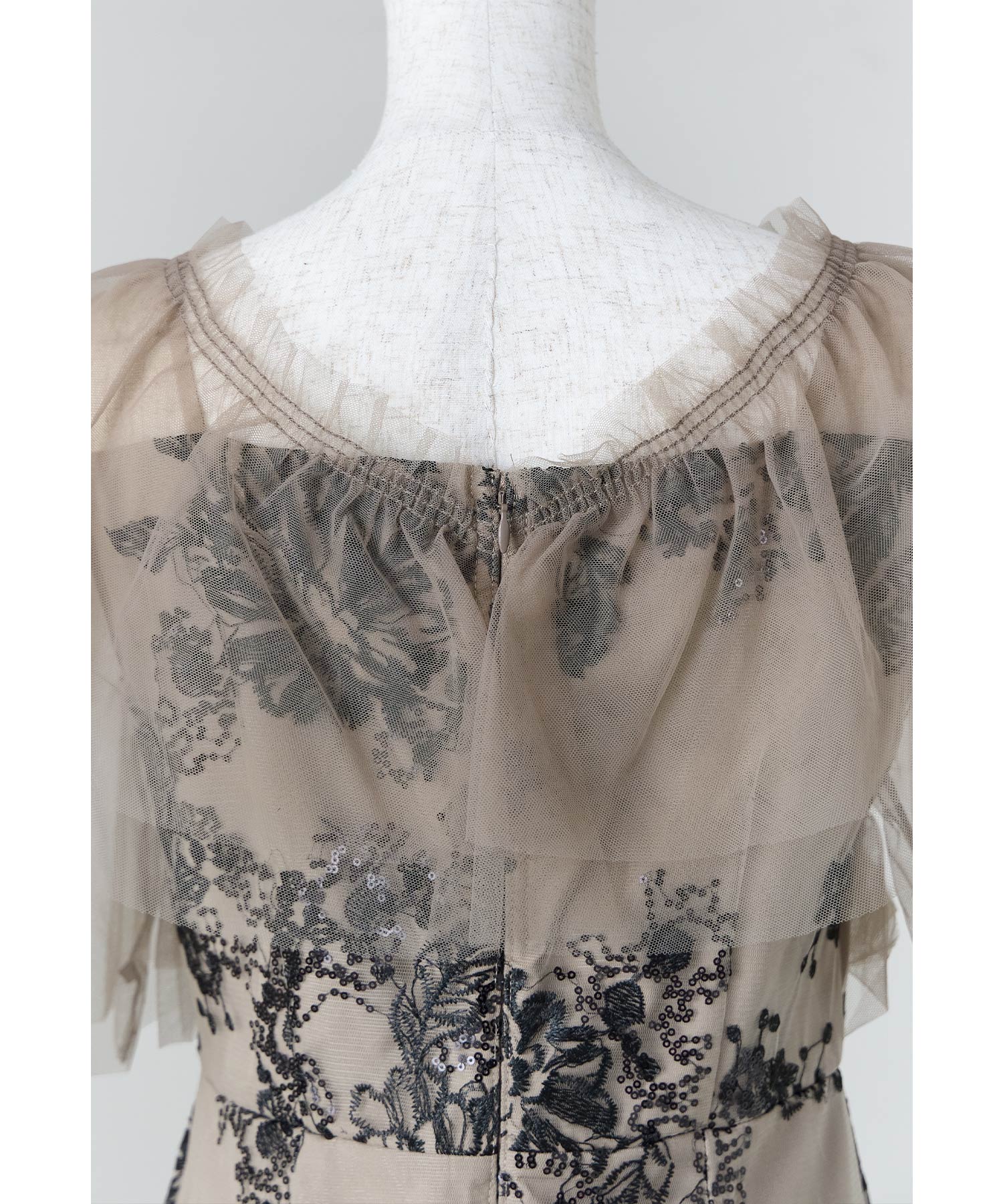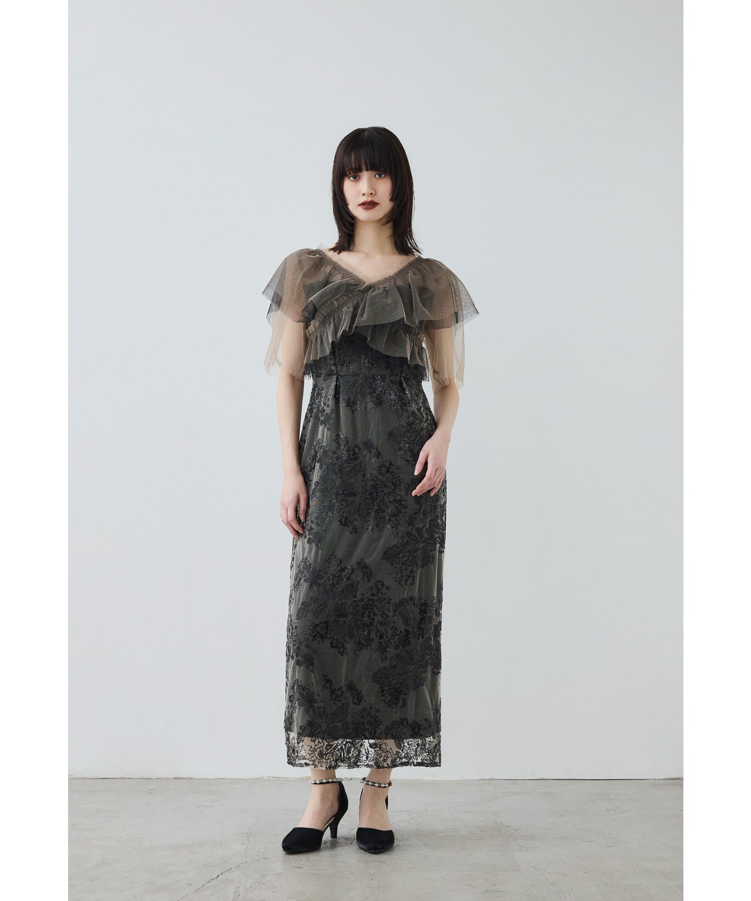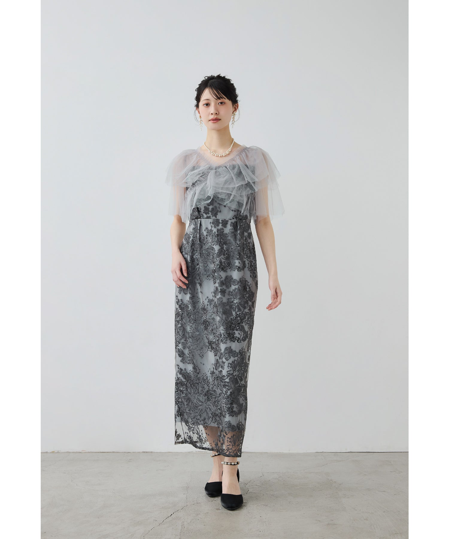 Rname レイヤードチュールドレス パーティードレス 結婚式 ワンピース スパンコール 花柄 刺繍 レース チュール シアー ロング丈 フリル 半袖 お呼ばれ パーティー 二次会 披露宴 謝恩会 成人式 同窓会 卒業式 フォーマル オケージョンドレス 春 夏 秋 冬 S M L 黒 グレー ベージュ
