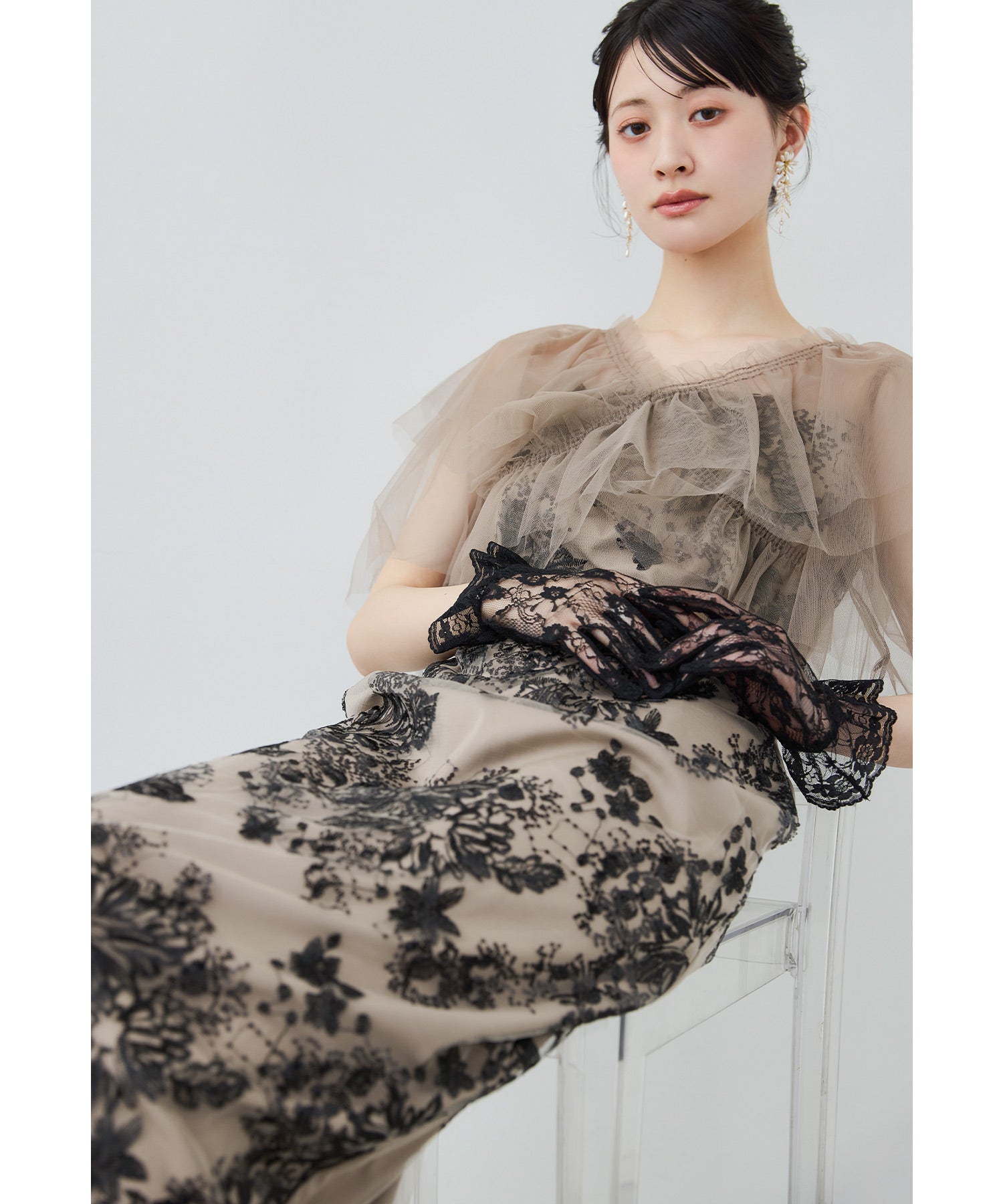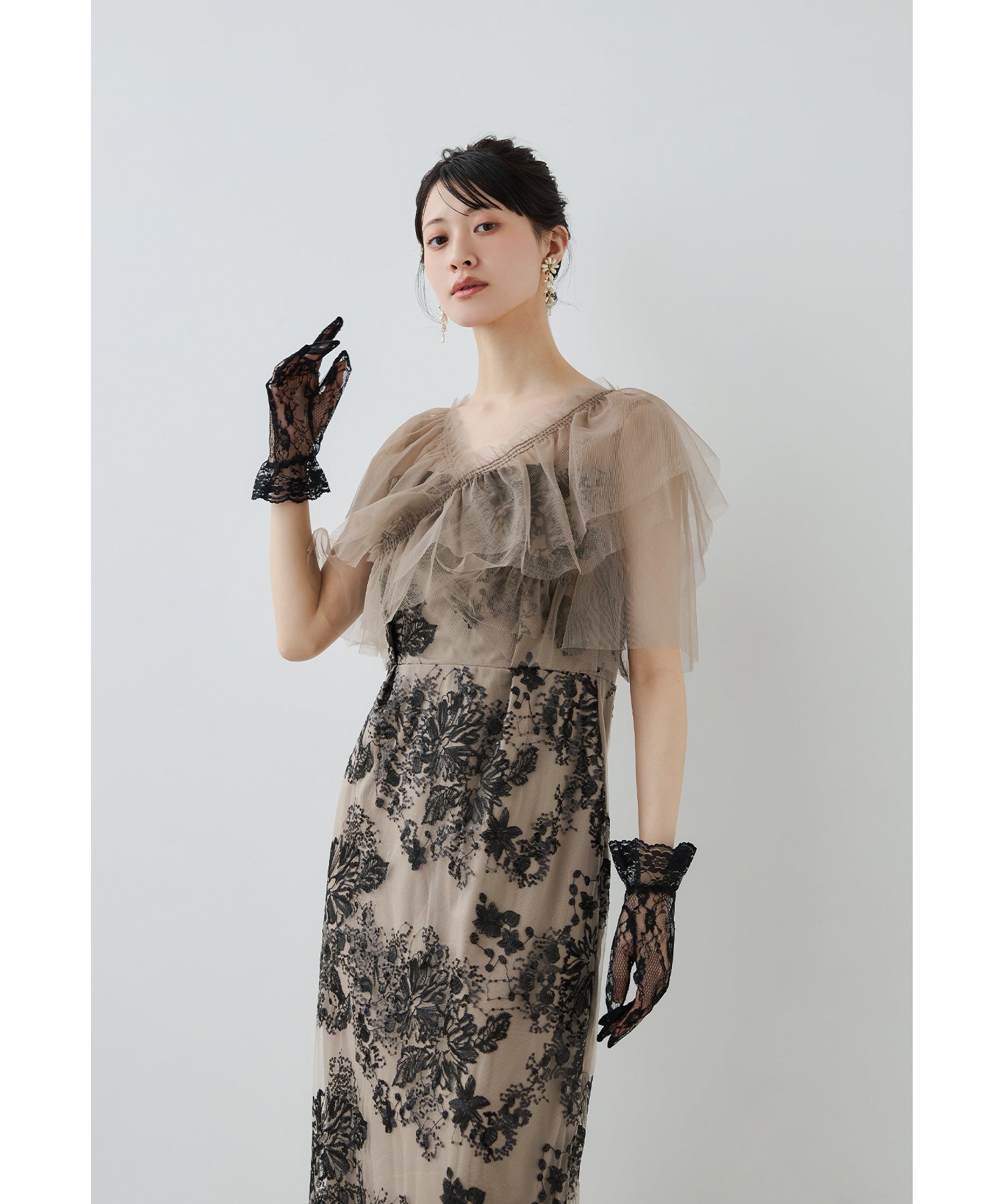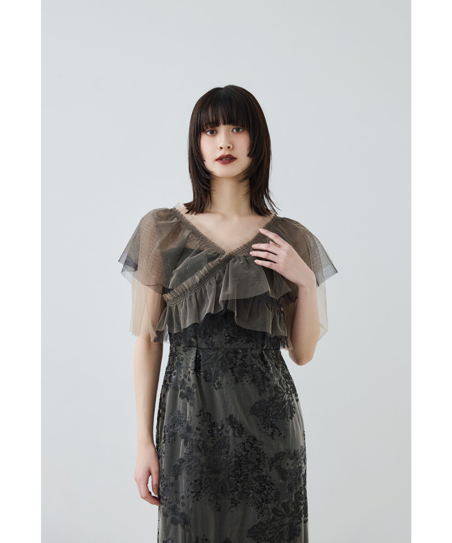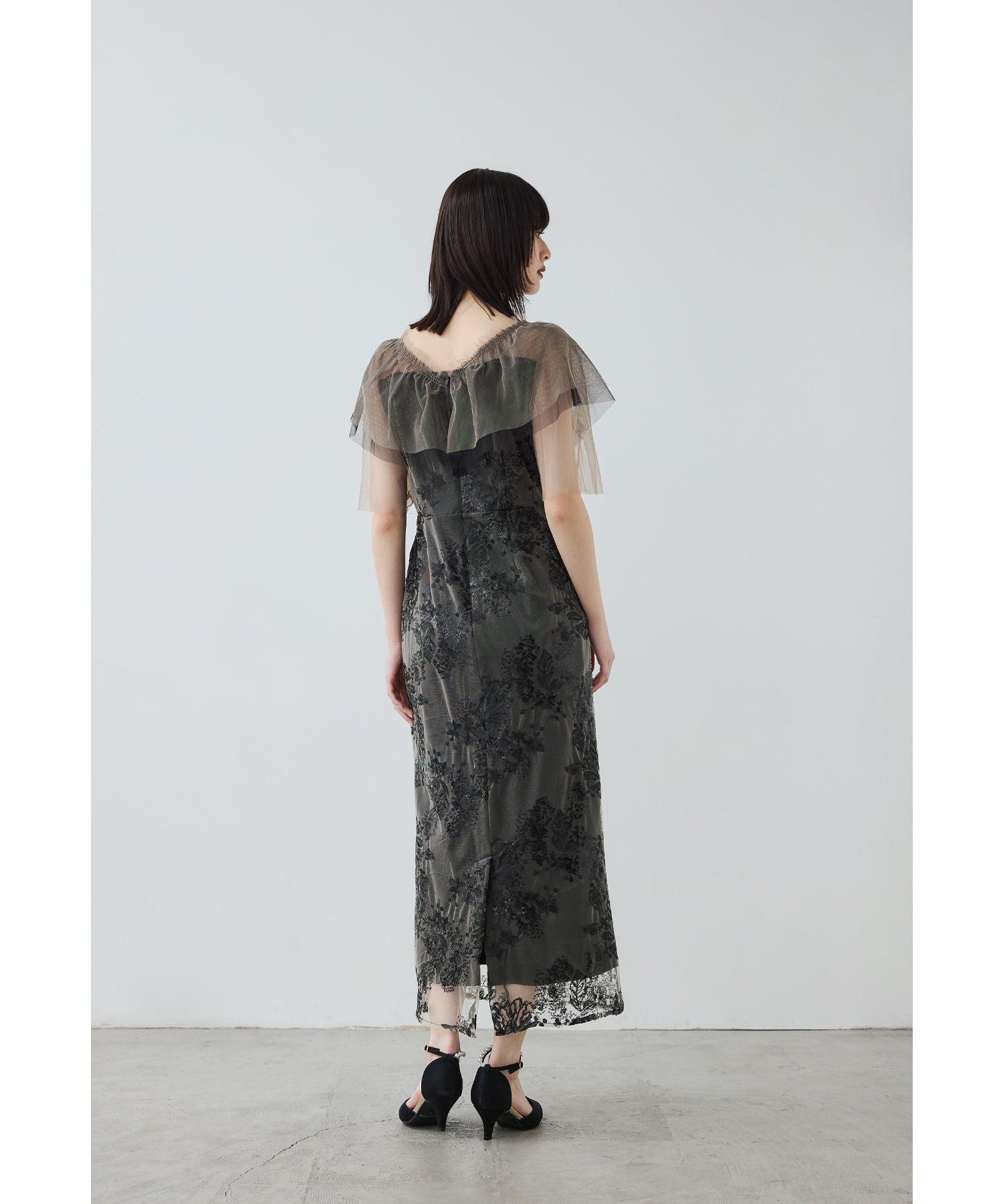 Rname レイヤードチュールドレス パーティードレス 結婚式 ワンピース スパンコール 花柄 刺繍 レース チュール シアー ロング丈 フリル 半袖 お呼ばれ パーティー 二次会 披露宴 謝恩会 成人式 同窓会 卒業式 フォーマル オケージョンドレス 春 夏 秋 冬 S M L 黒 グレー ベージュ