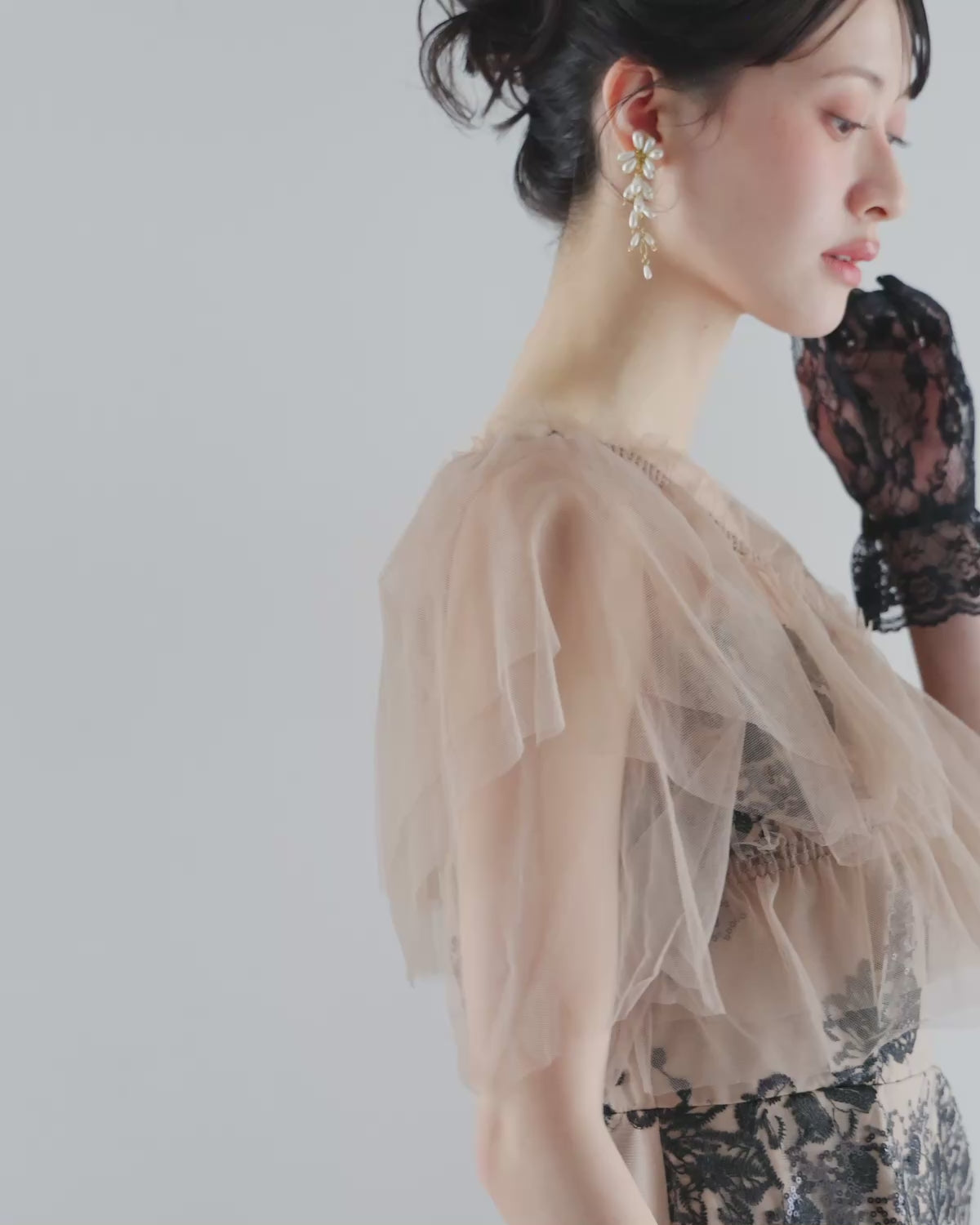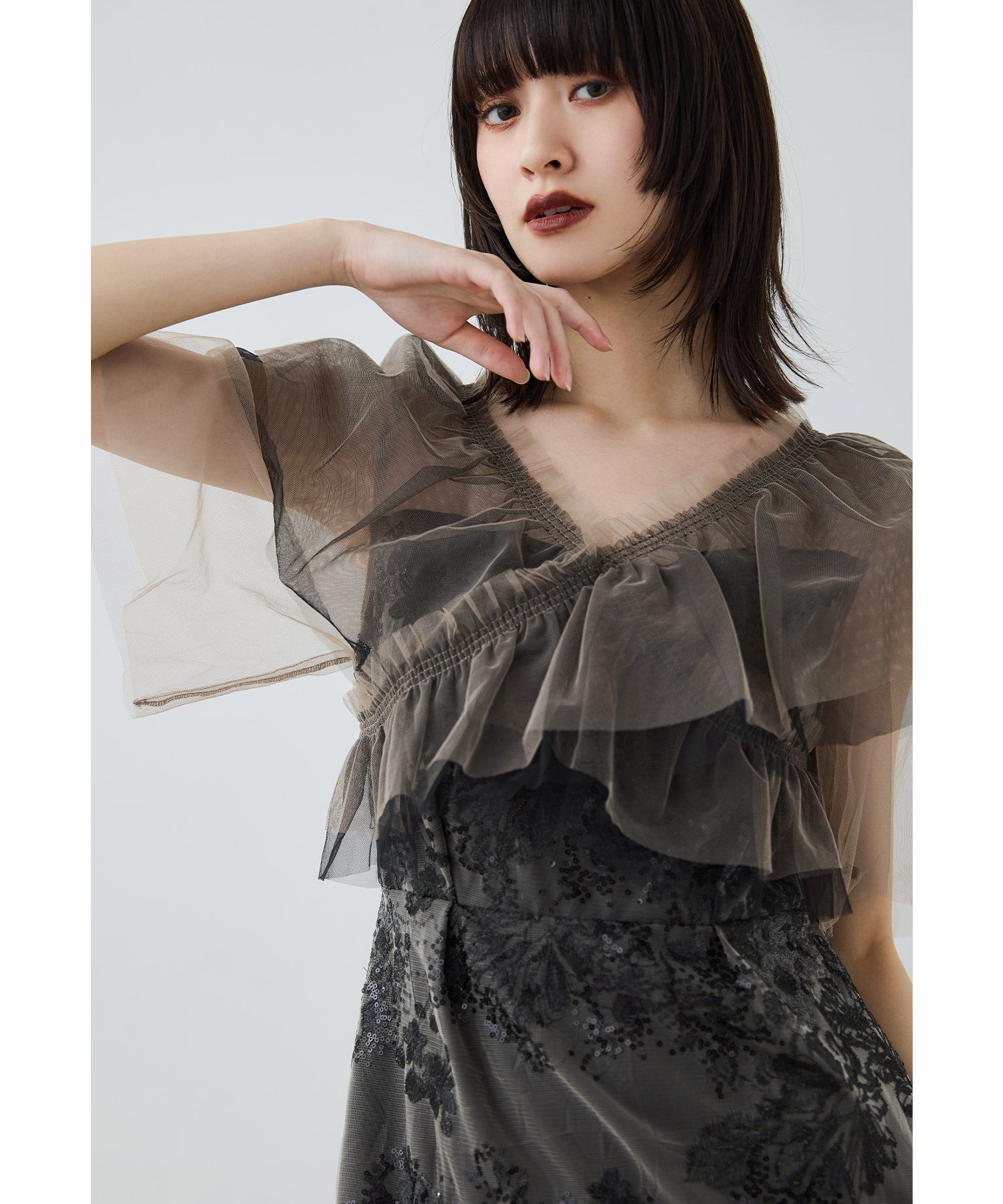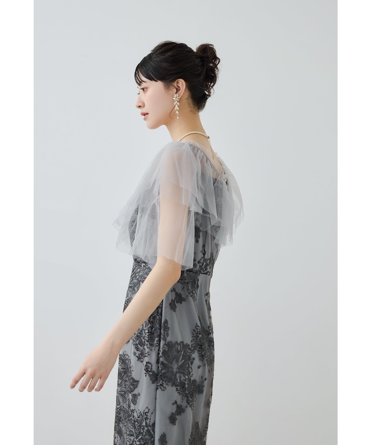 胸元からお袖にかけて、チュールフリルをクロスにかけて