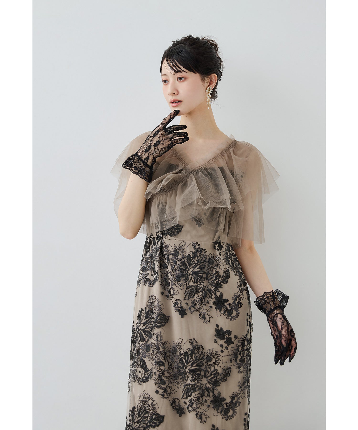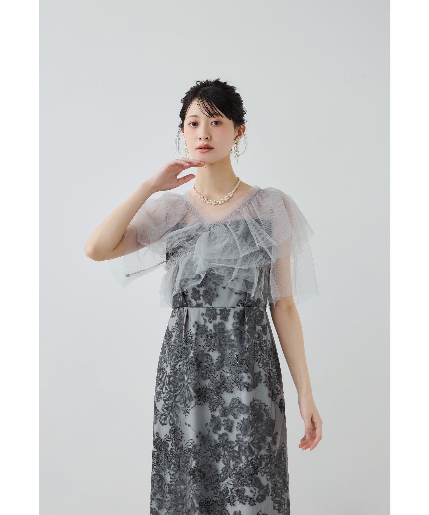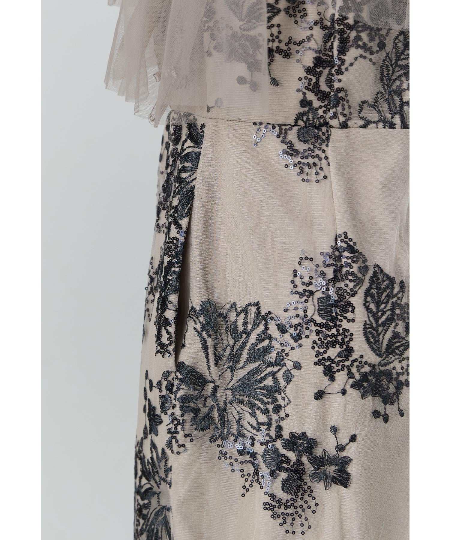 印象的なフラワー刺繍にスパンコールを散りばめた華やかなオケージョンドレス。