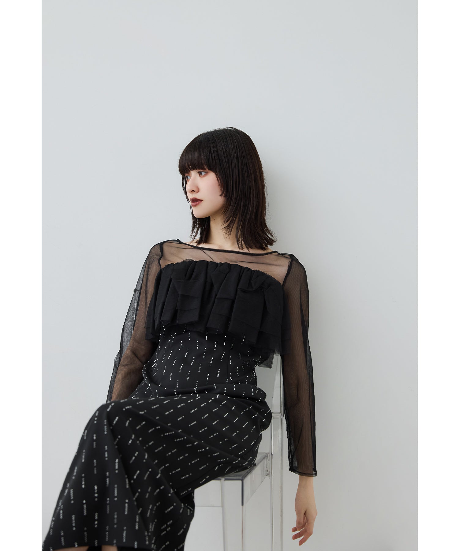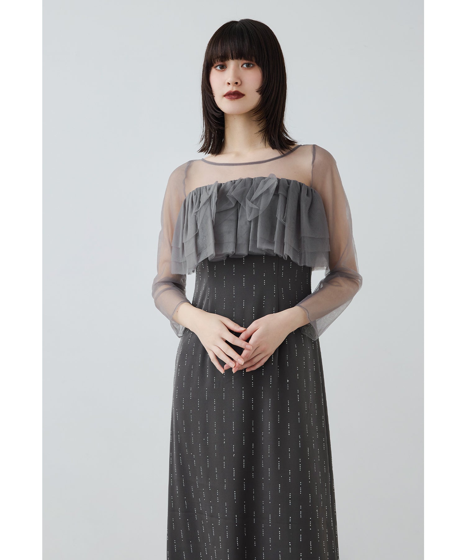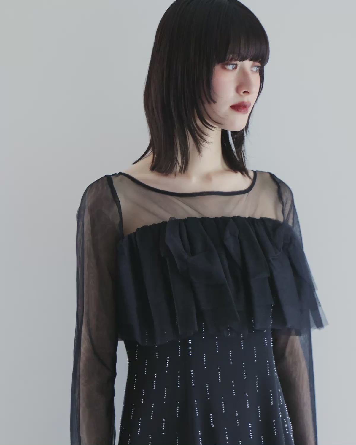 胸元は柔らかなチュールを贅沢に重ねた立体感のあるフリルデザインで顔まわりを華やかに。