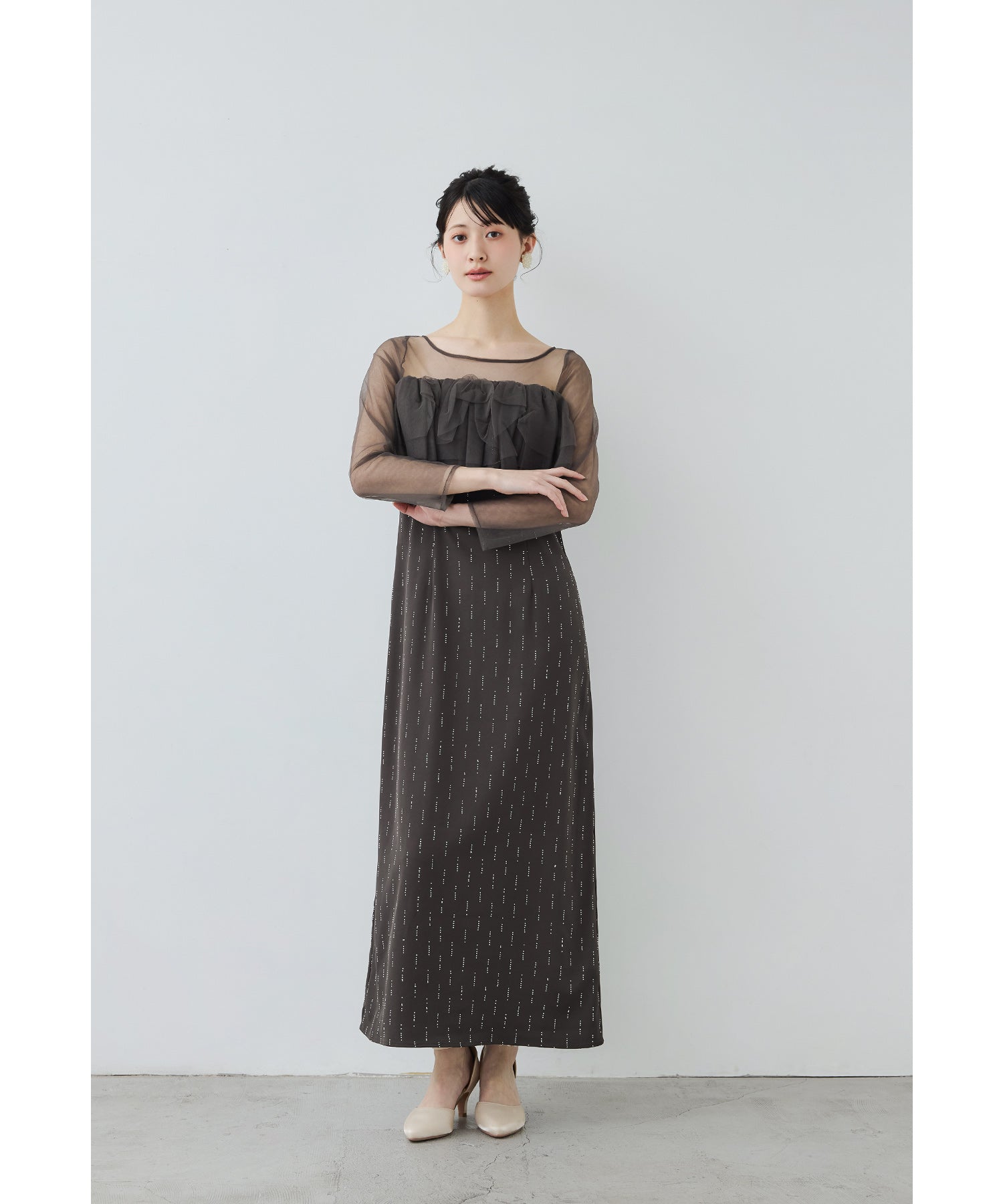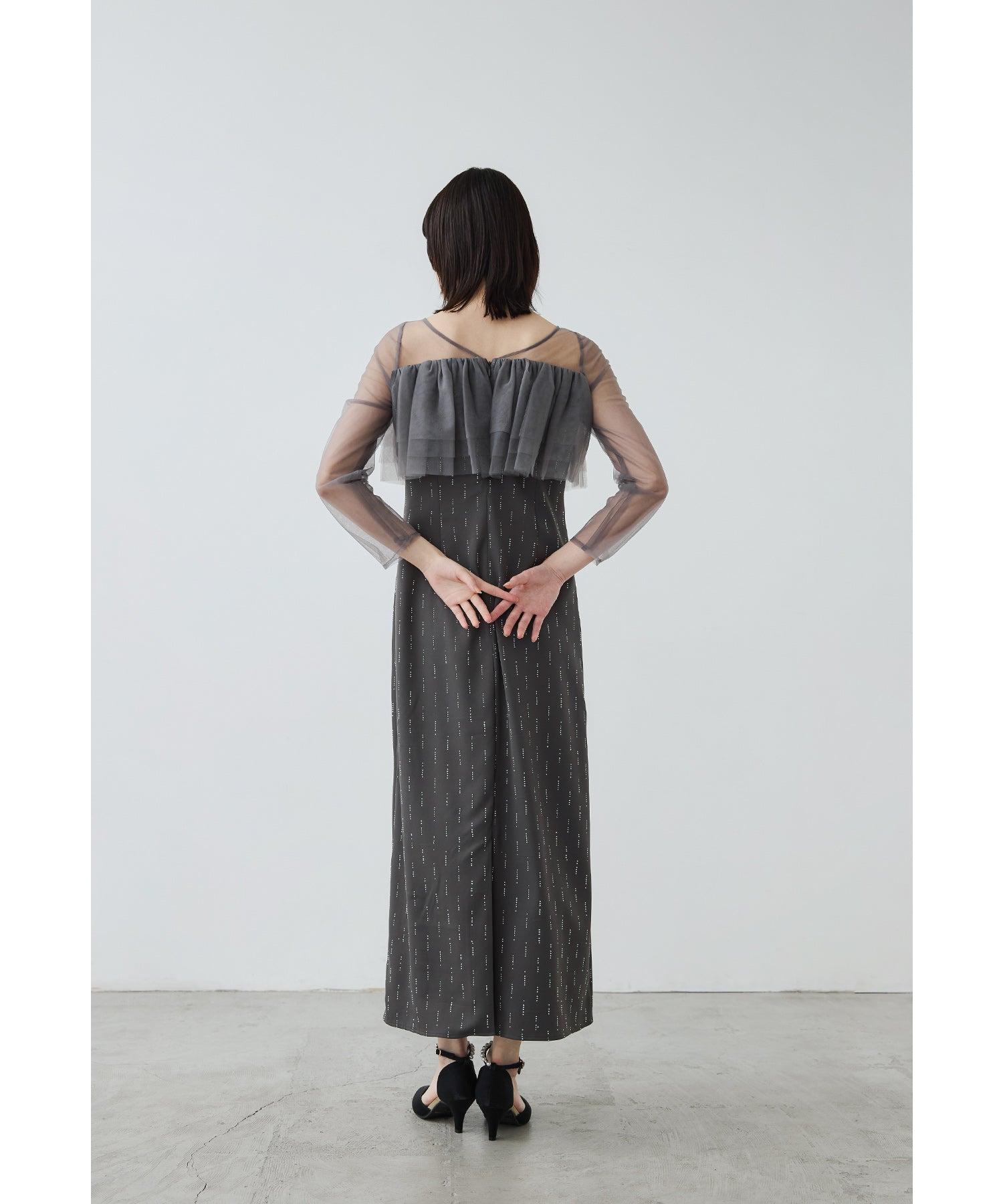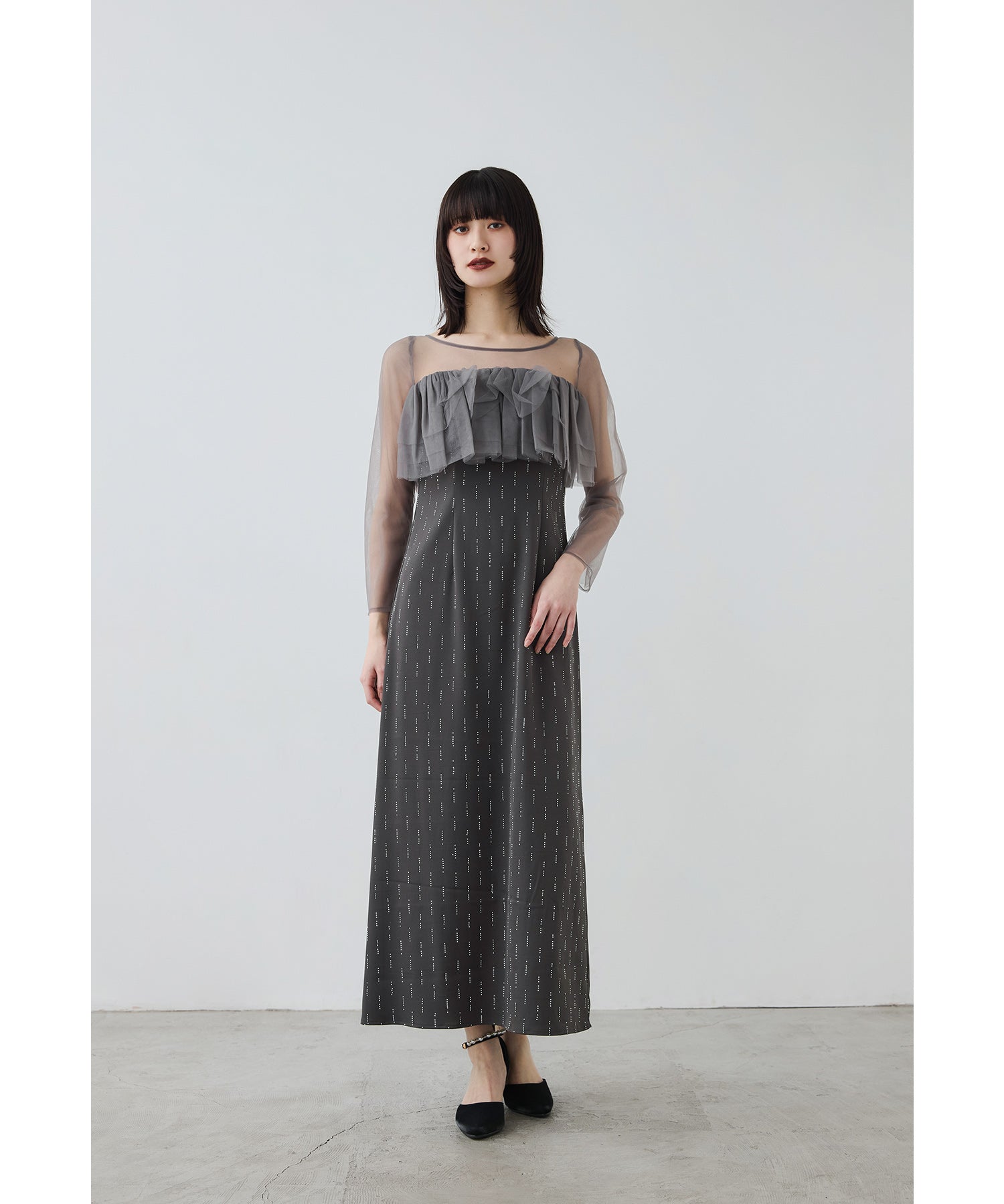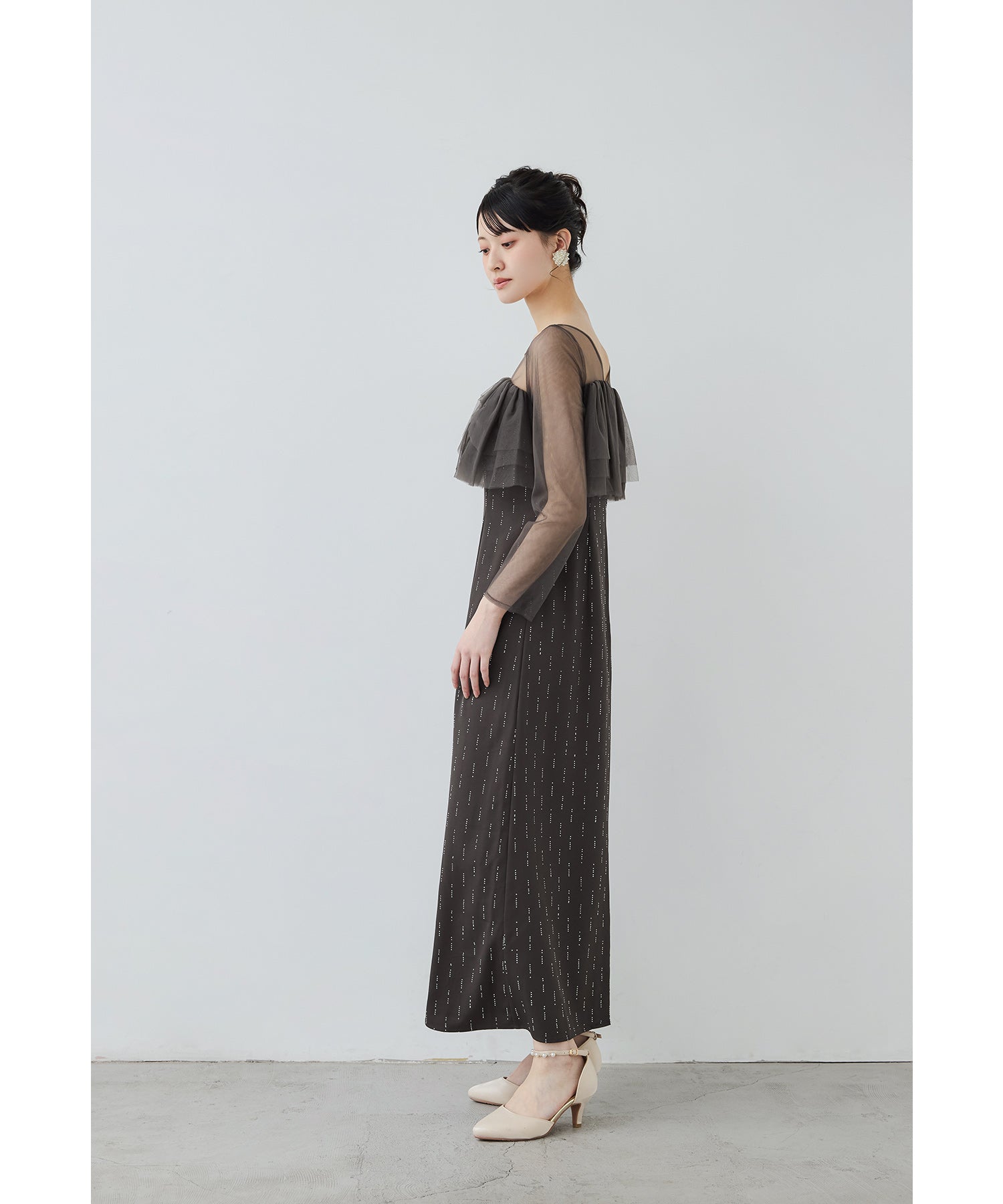 胸元は柔らかなチュールを贅沢に重ねた立体感のあるフリルデザインで顔まわりを華やかに。