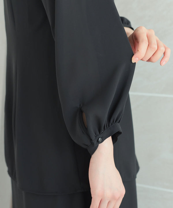 袖はロング丈に仕上げ、袖口にボダン付け、ふんわりとしたシルエットで優しい印象に仕上げました。