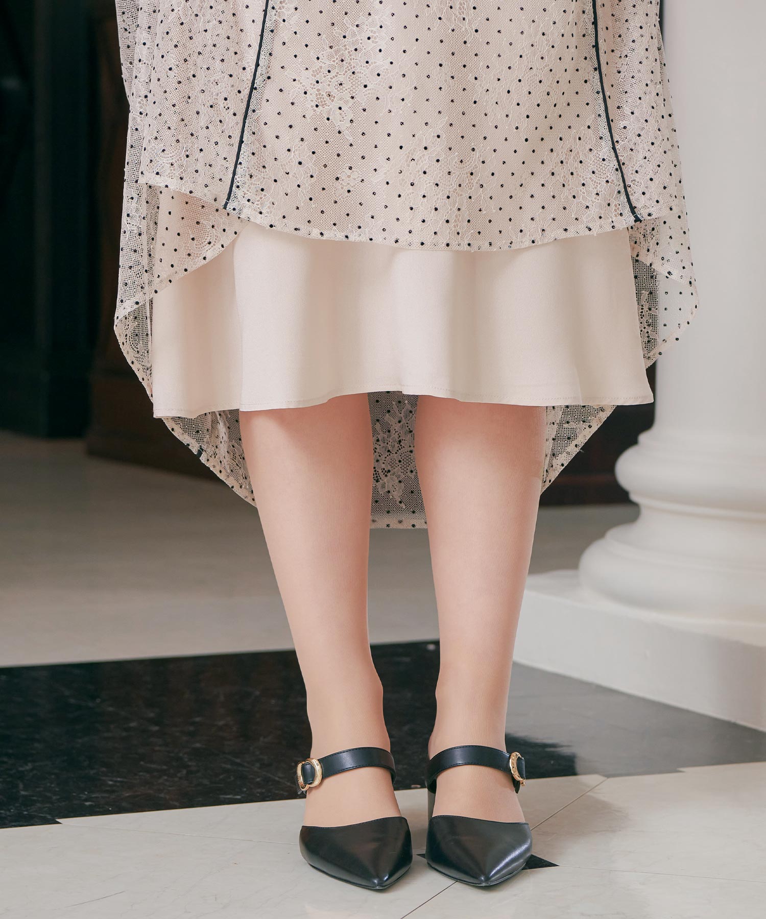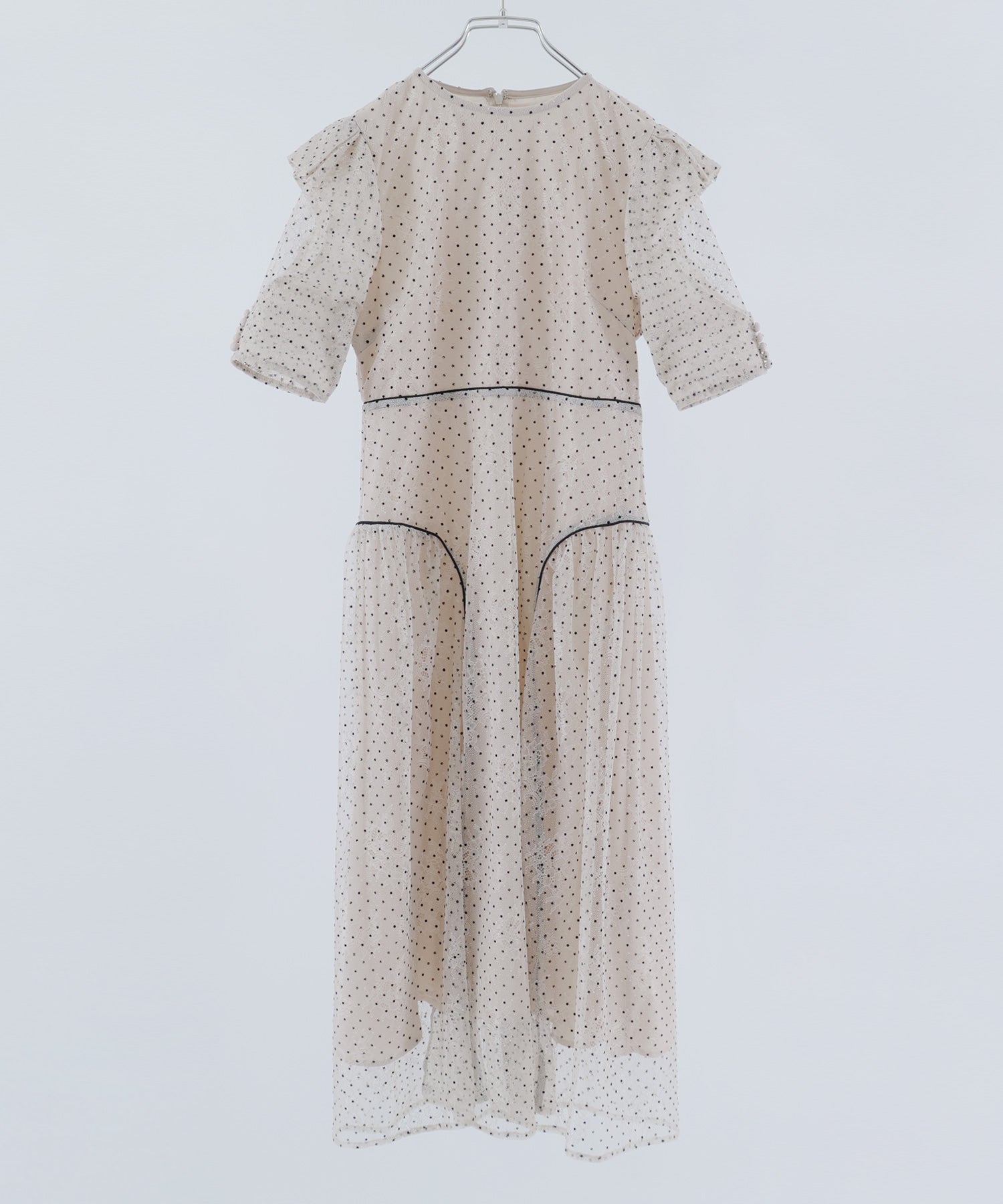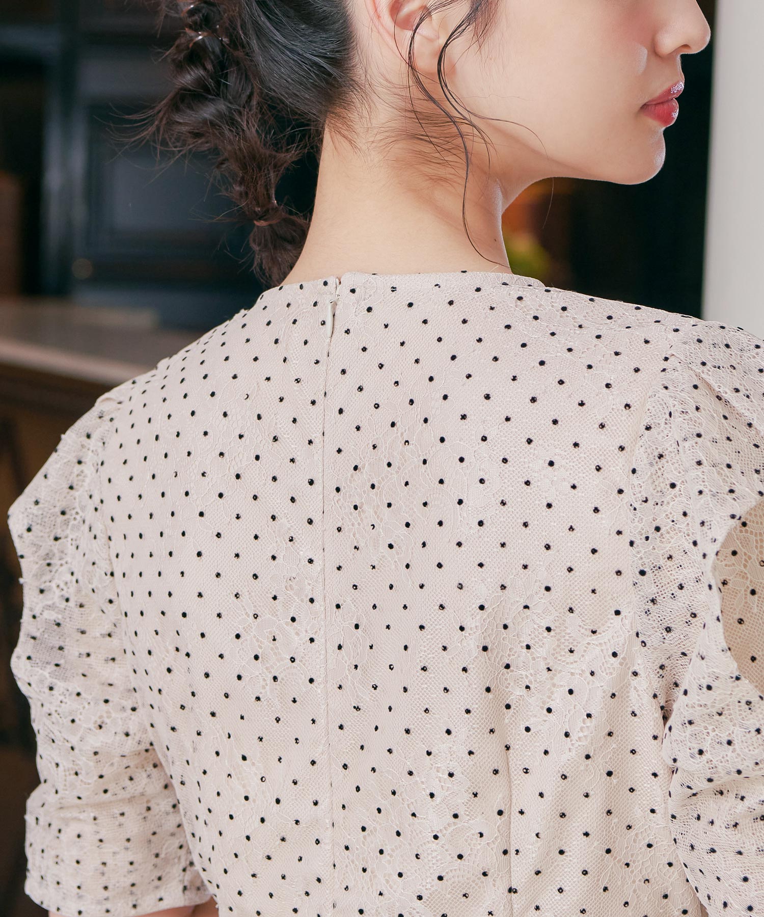 Rname 結婚式 ワンピース パーティードレス ドット レース パイピング ミドル丈 膝丈 袖あり 半袖 ボリューム袖 総レース フレア シンプル オケージョン 1.5次会 春夏 秋冬 二次会 謝恩会 成人式 同窓会 女子会 お呼ばれ 入学式 卒業式 フェミニン かわいい S M ベージュ ネイビー