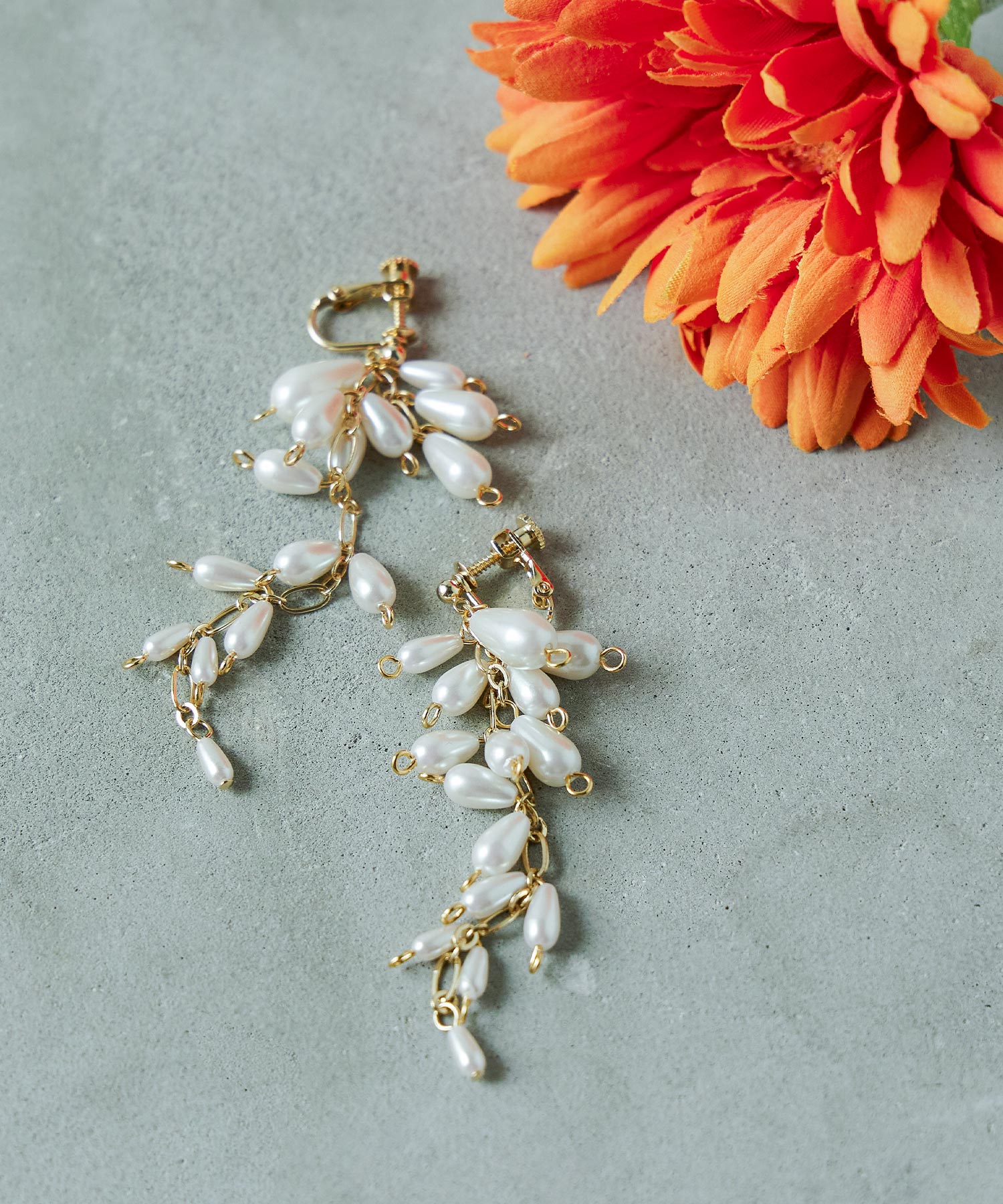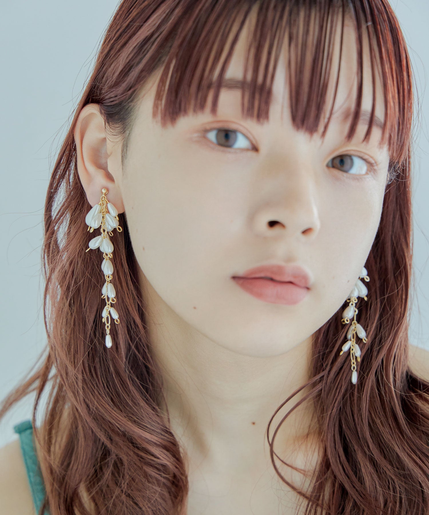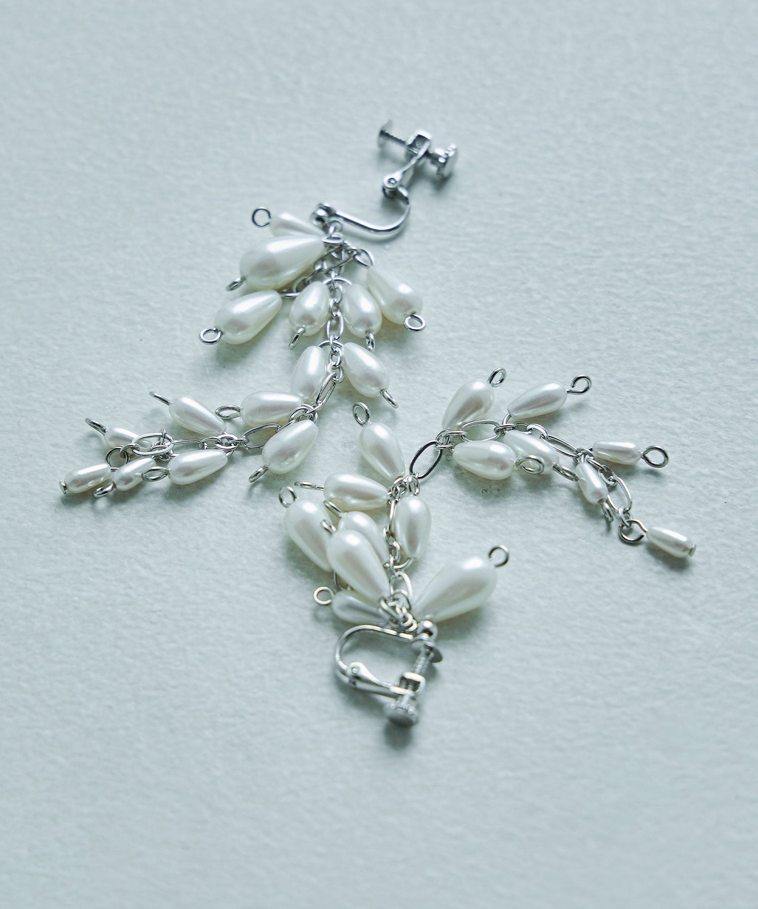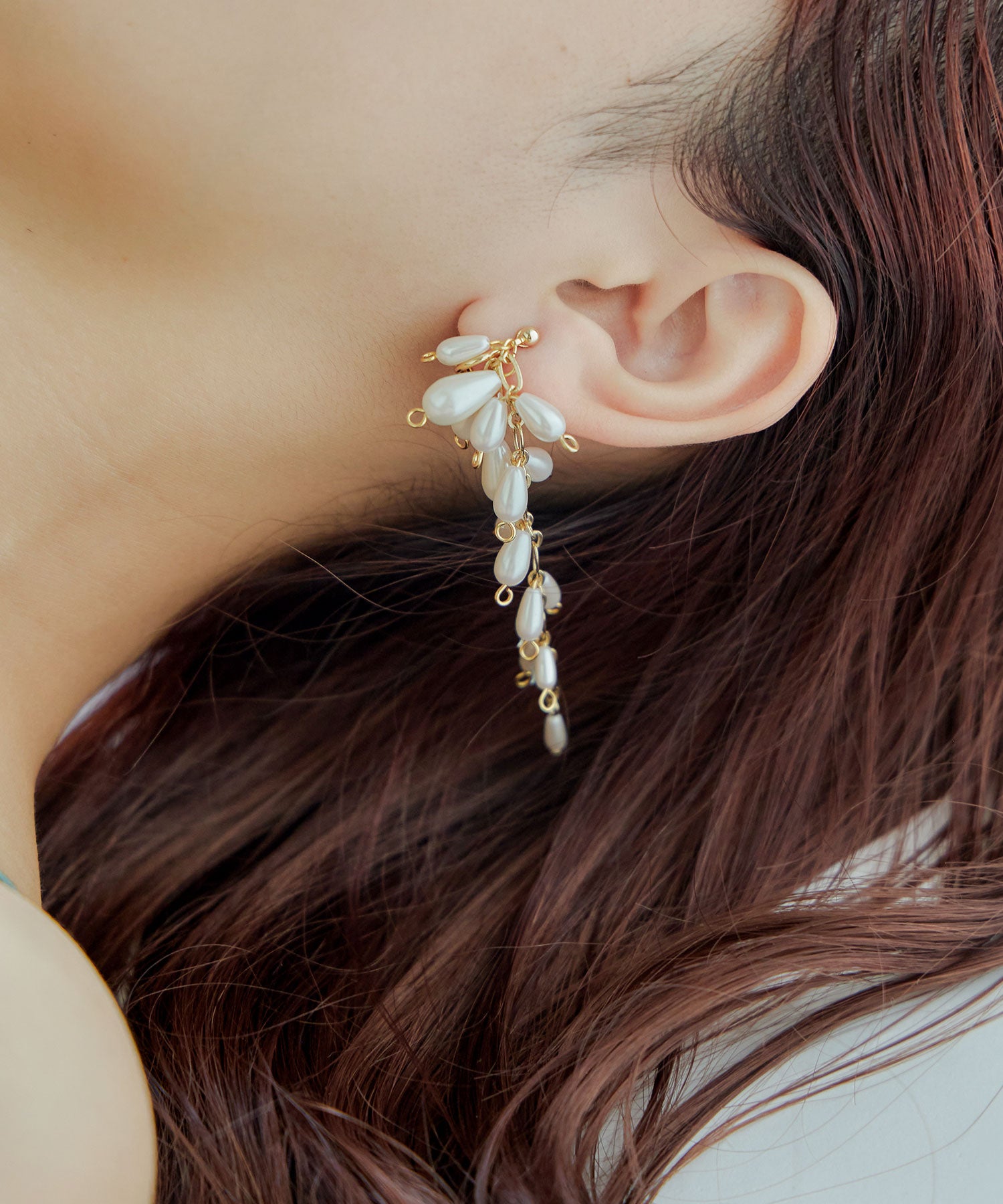 大きさの異なるパールがゆらゆら揺れるロングイヤリング。